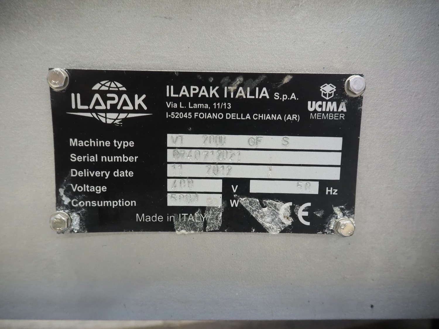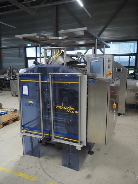 Ilapak vertical bag form-, fill- and seal machine, type: VT 2000 GF S, serial number: 0740712021, year of construction: 11-2012, 400 V, 50 Hz, 500 W, diameter pipe: 180 mm, vertical seal length: 640 mm, horizontal seal length: 450 mm, total dimensions: 2300 mm x 1900 mm x 2500 mm.