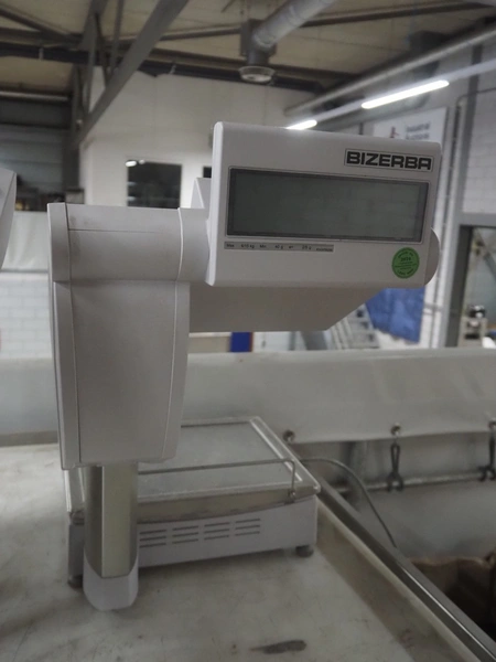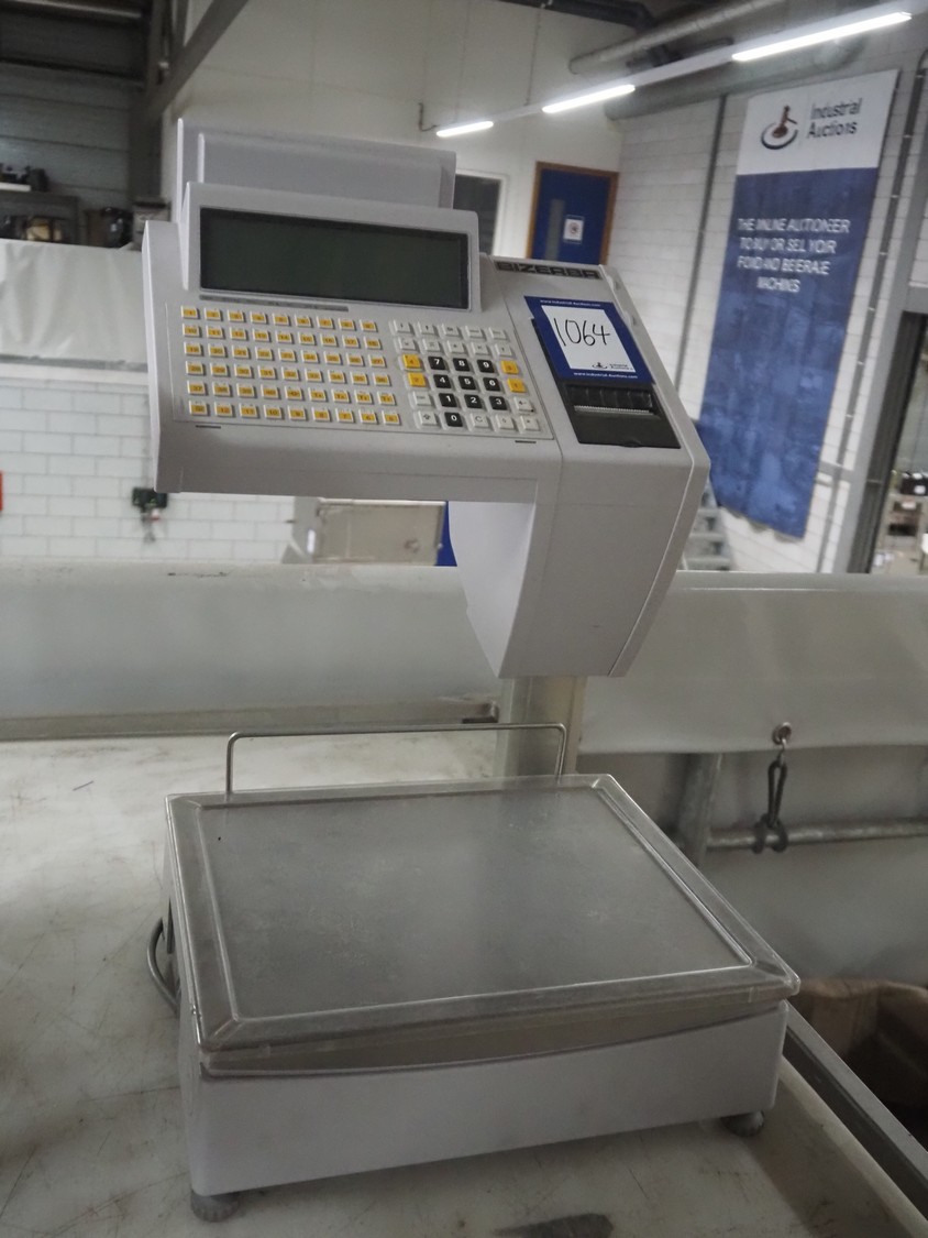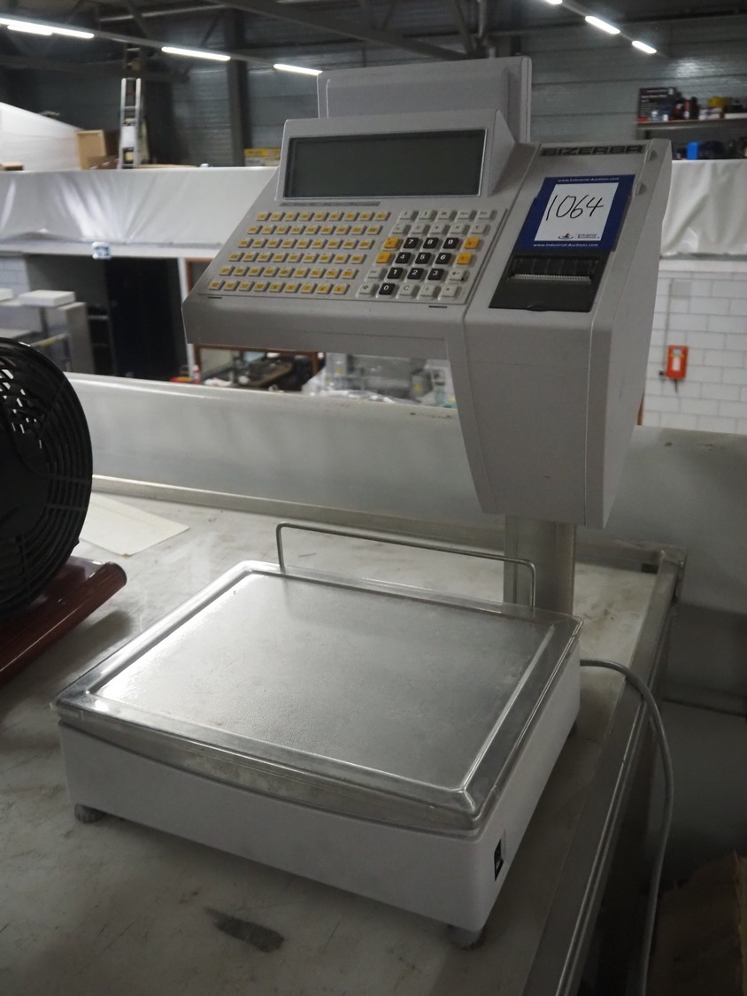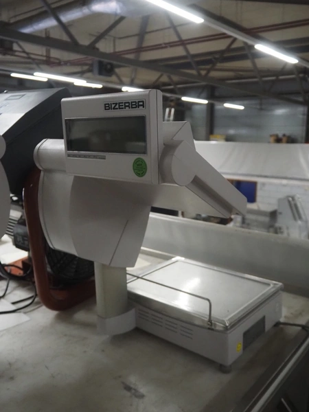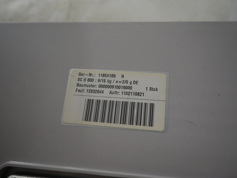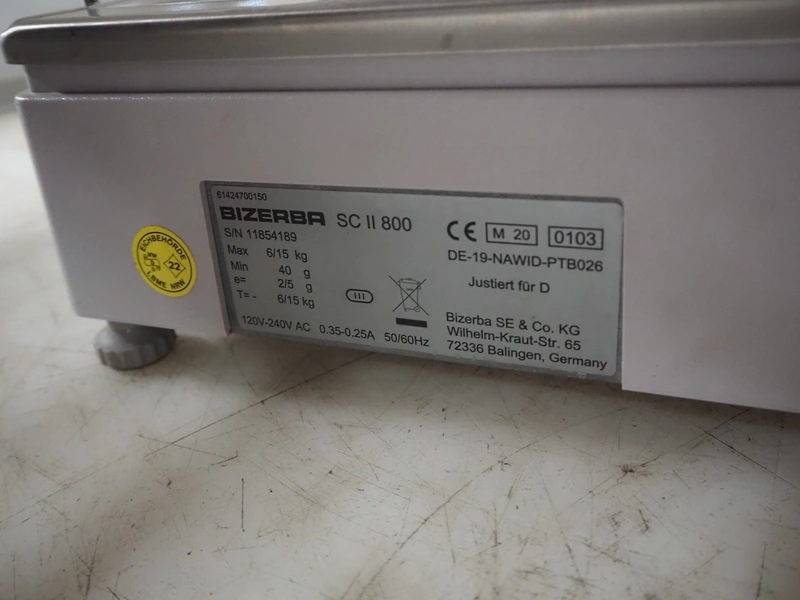 Bizerba weighing scale with label printer, type: SC II 800, serial number: 11854189, 120/240 V, 50/60 Hz, 0.35-0.25 A, minimum weight: 40 gram, maximum weight: 6/15 Kg, e= 2/5 gram, scale dimensions: 350 mm x 270 mm, total dimensions: 480 mm x 350 mm x 560 mm.