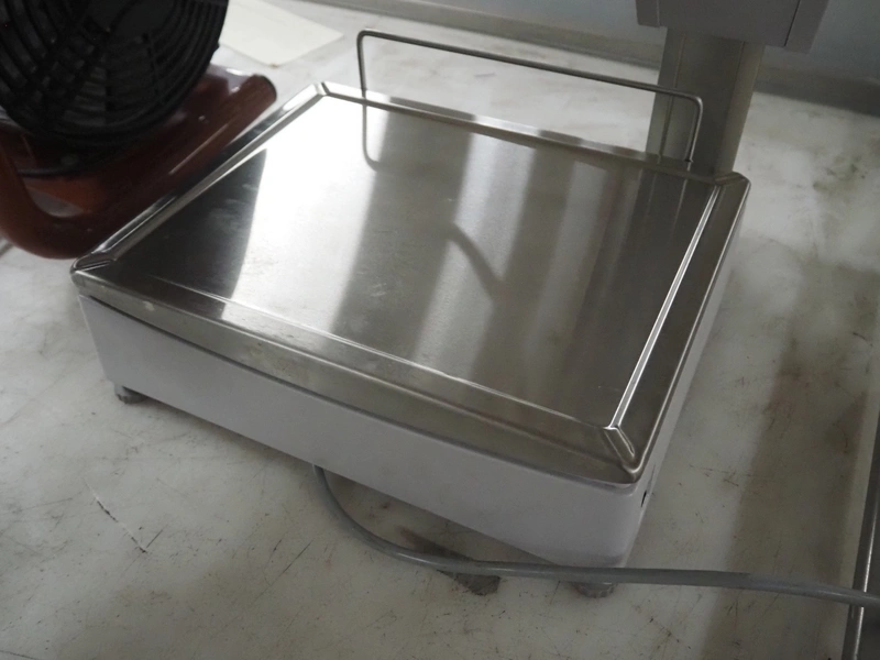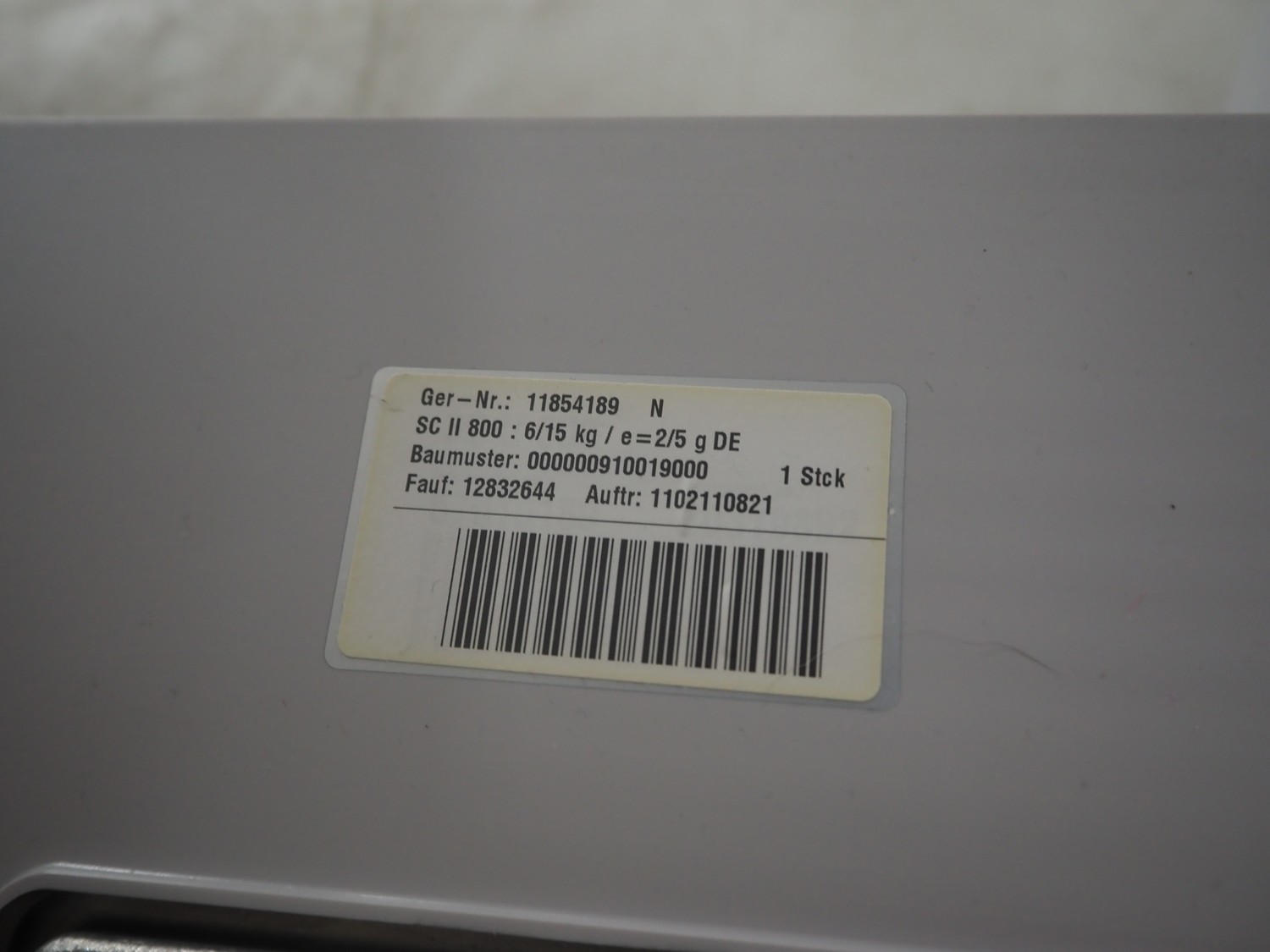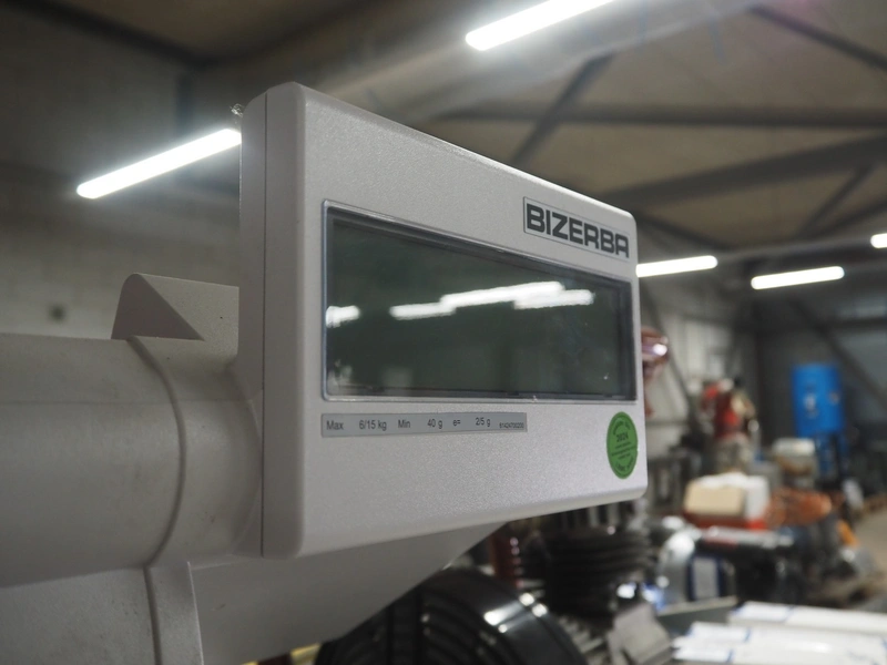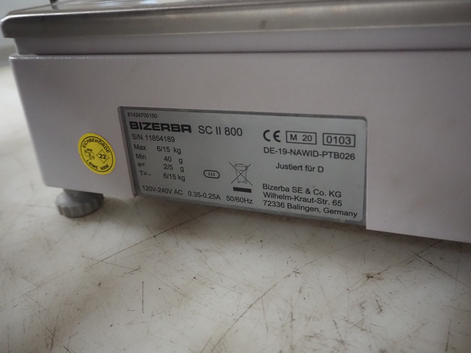 Bizerba weighing scale with label printer, type: SC II 800, serial number: 11854189, 120/240 V, 50/60 Hz, 0.35-0.25 A, minimum weight: 40 gram, maximum weight: 6/15 Kg, e= 2/5 gram, scale dimensions: 350 mm x 270 mm, total dimensions: 480 mm x 350 mm x 560 mm.