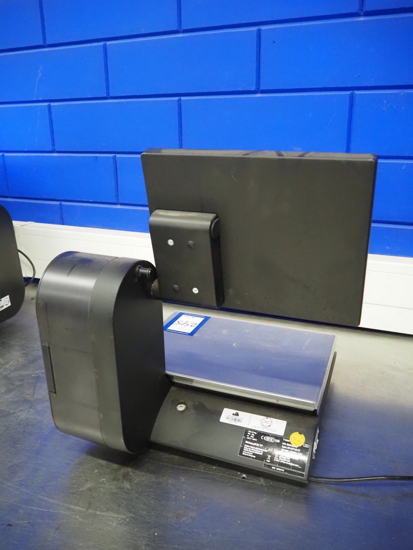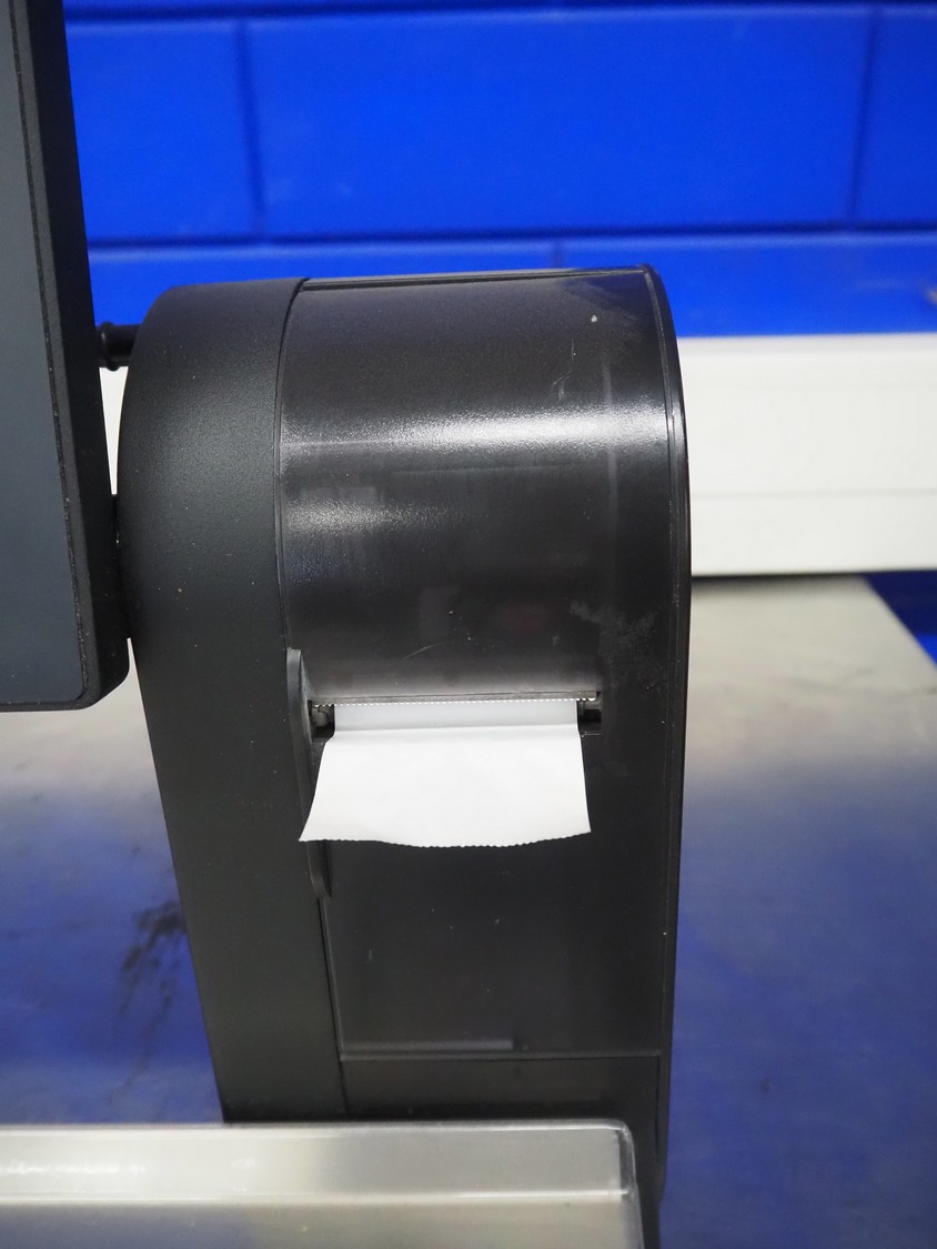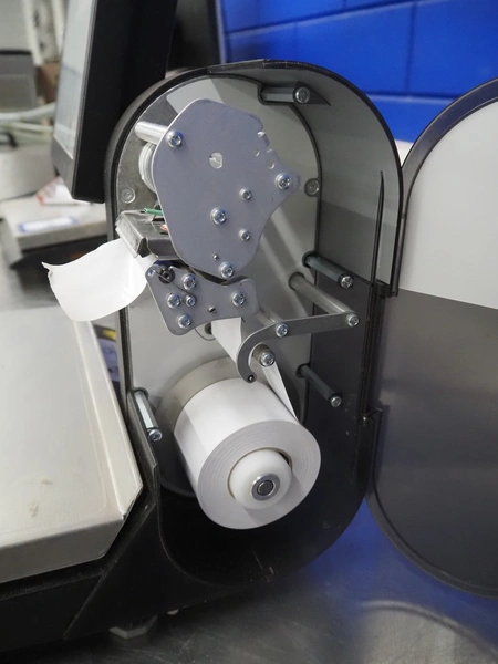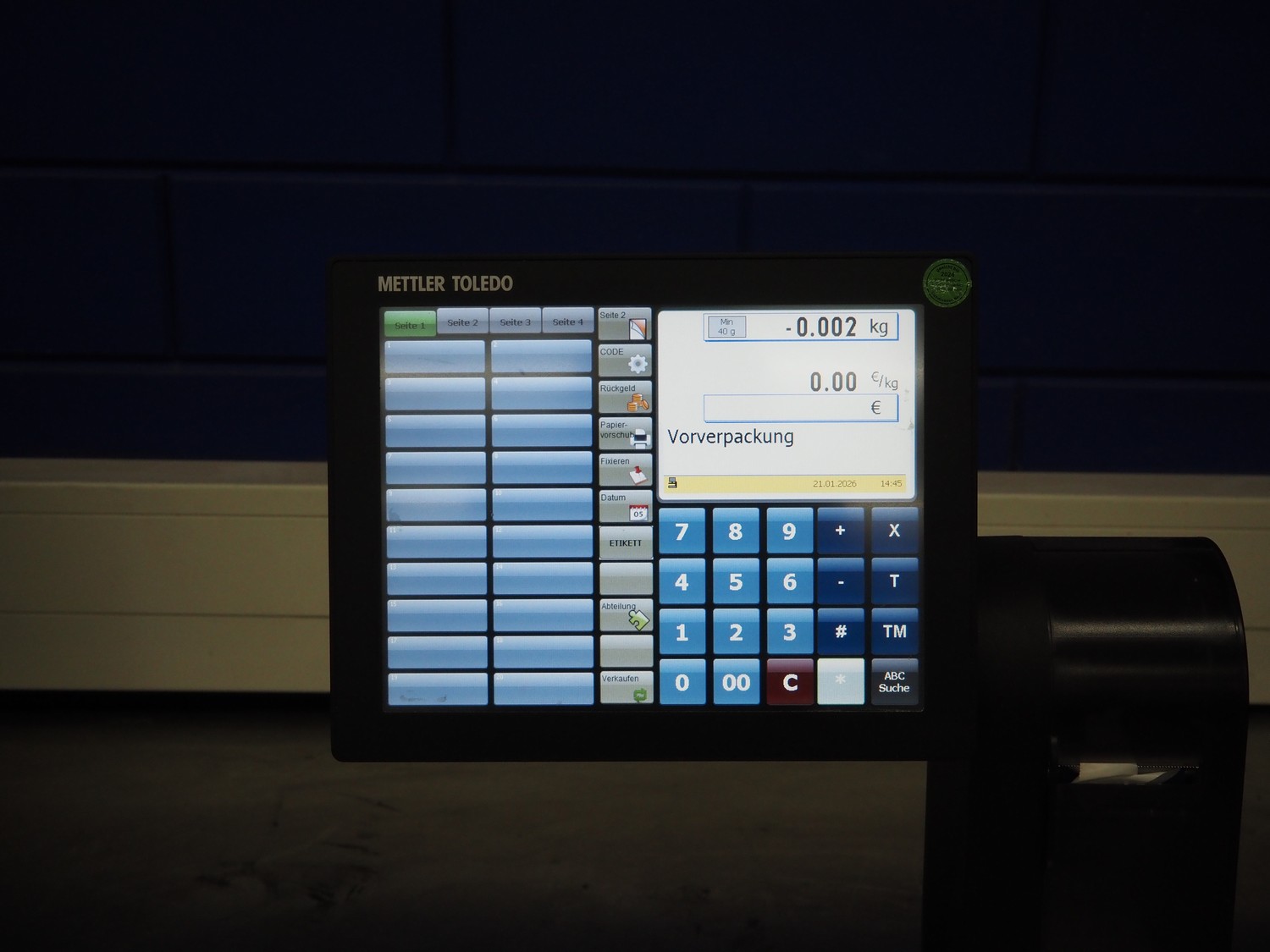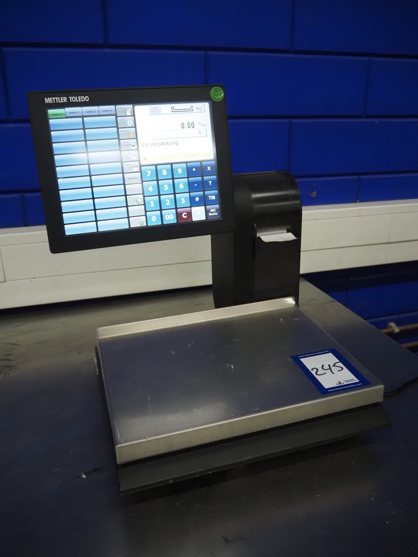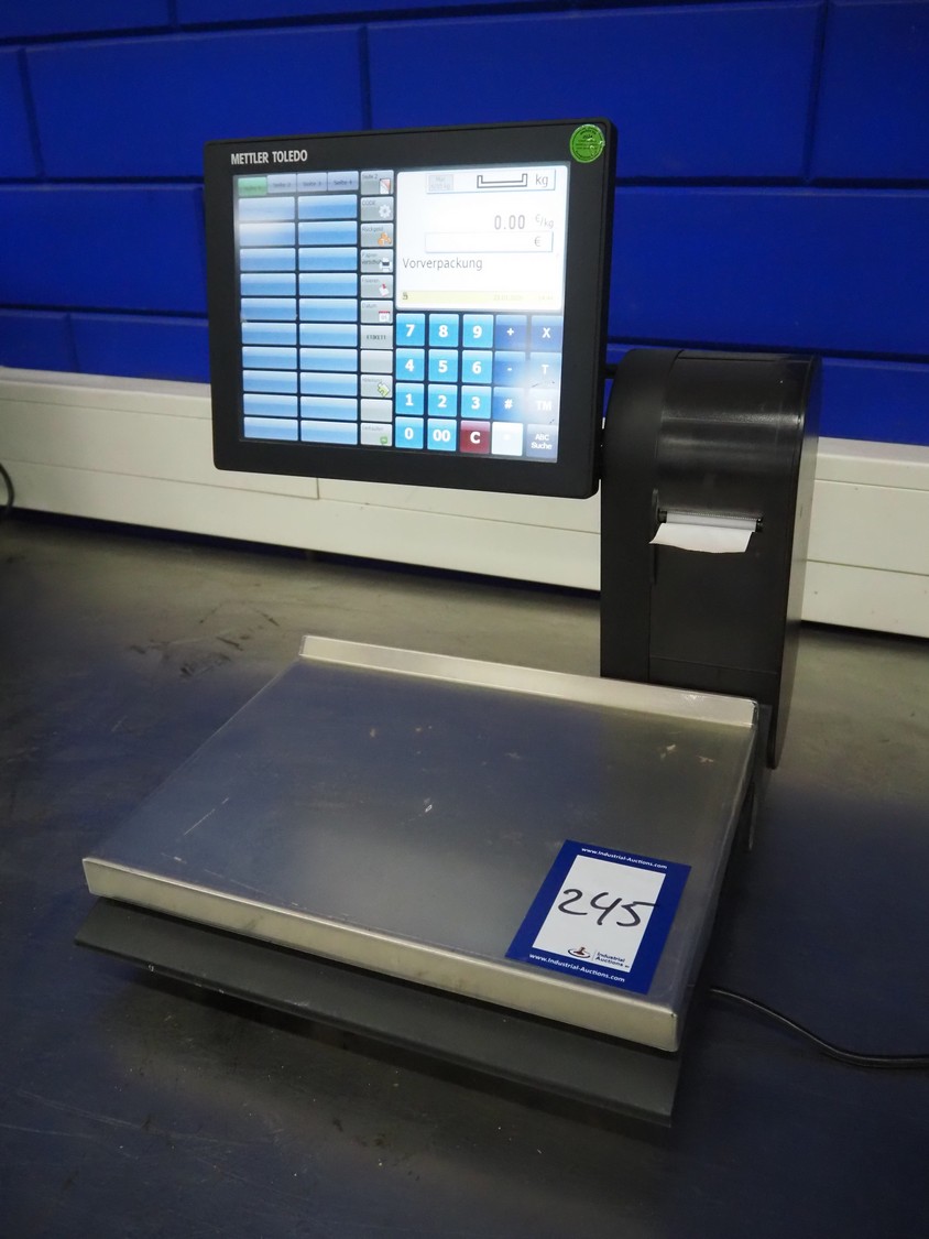 Mettler Toledo weighing scale with label printer, type: UC-GTT-M CT, serial number: B836386887, maximum: 6/15 kg, minimum: 40 gram, e= 2/5 gram, dimensions scale: 360 mm x 270 mm, total dimensions: 430 mm x 400 mm x 470 mm.