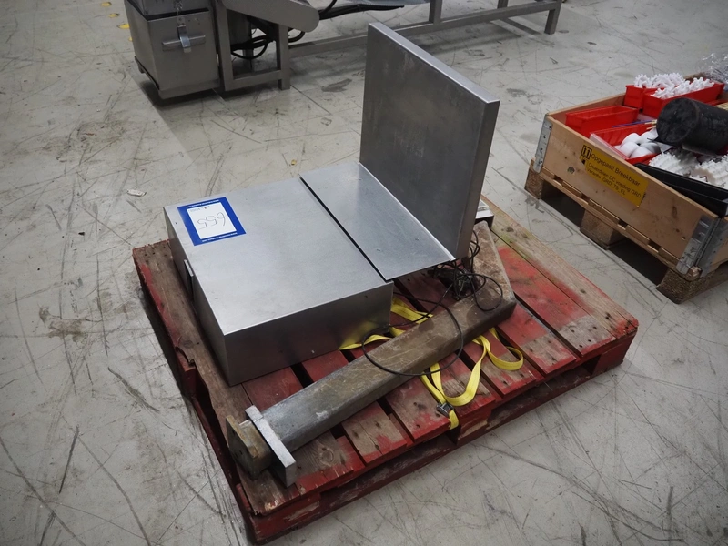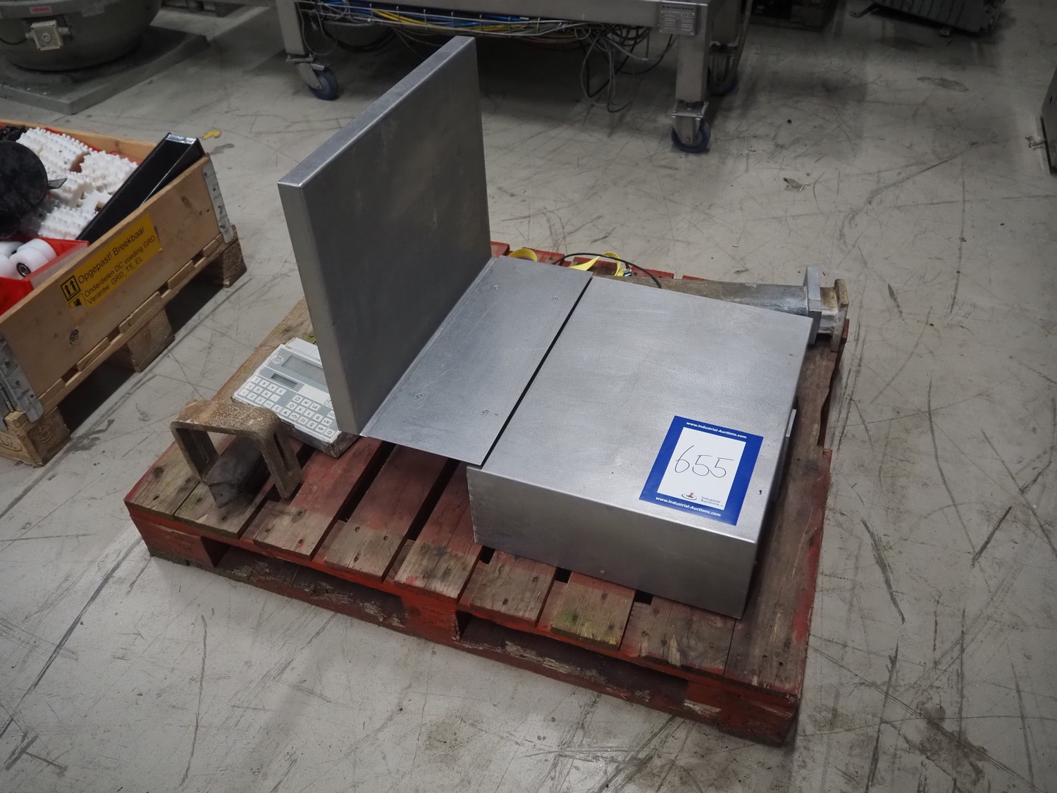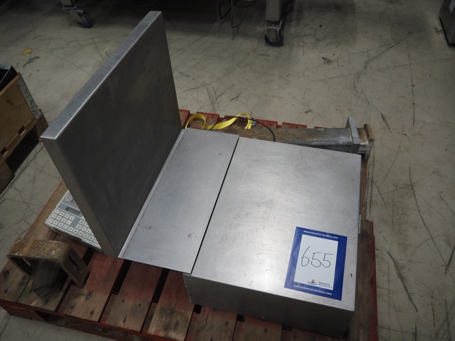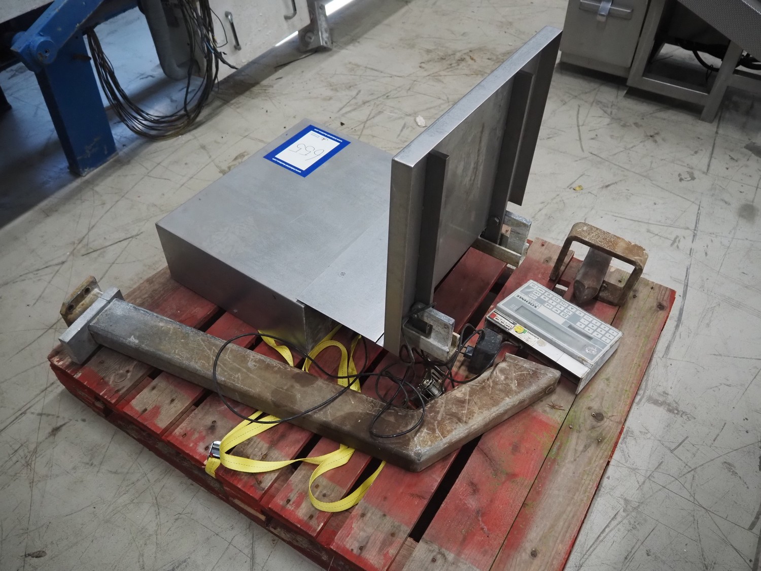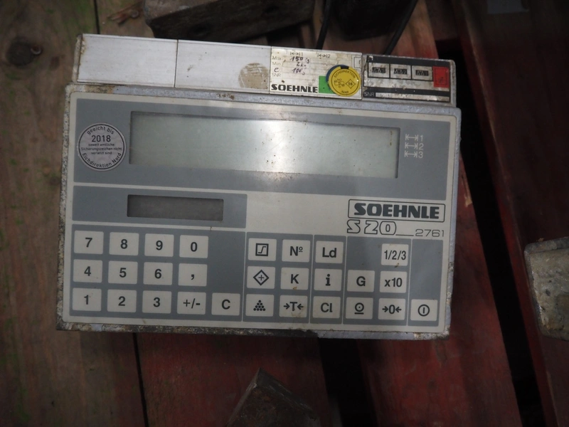 Weighing scale with Soehnle indicator, serial number: 50153, maximum weight: 150 kg, minimum weight: 2 kg, e = 100 gram, dimensions: 560 mm x 600 mm x 750 mm.