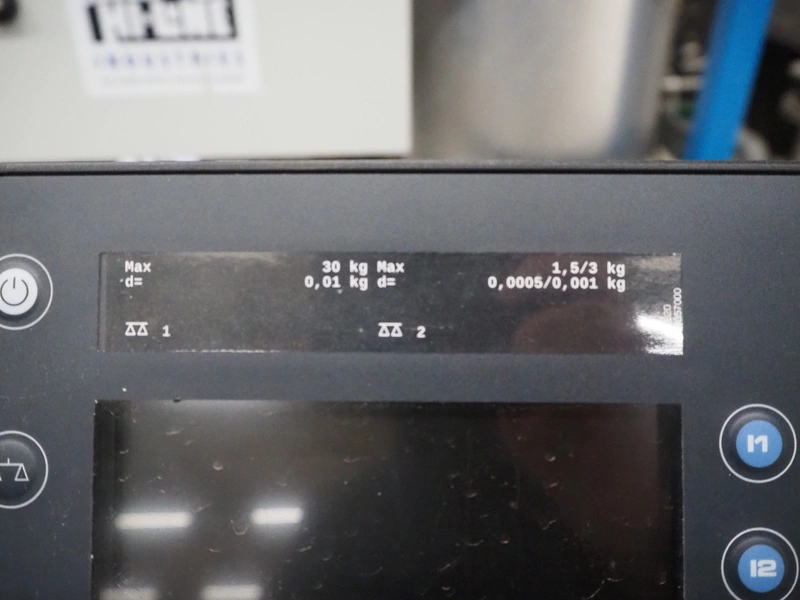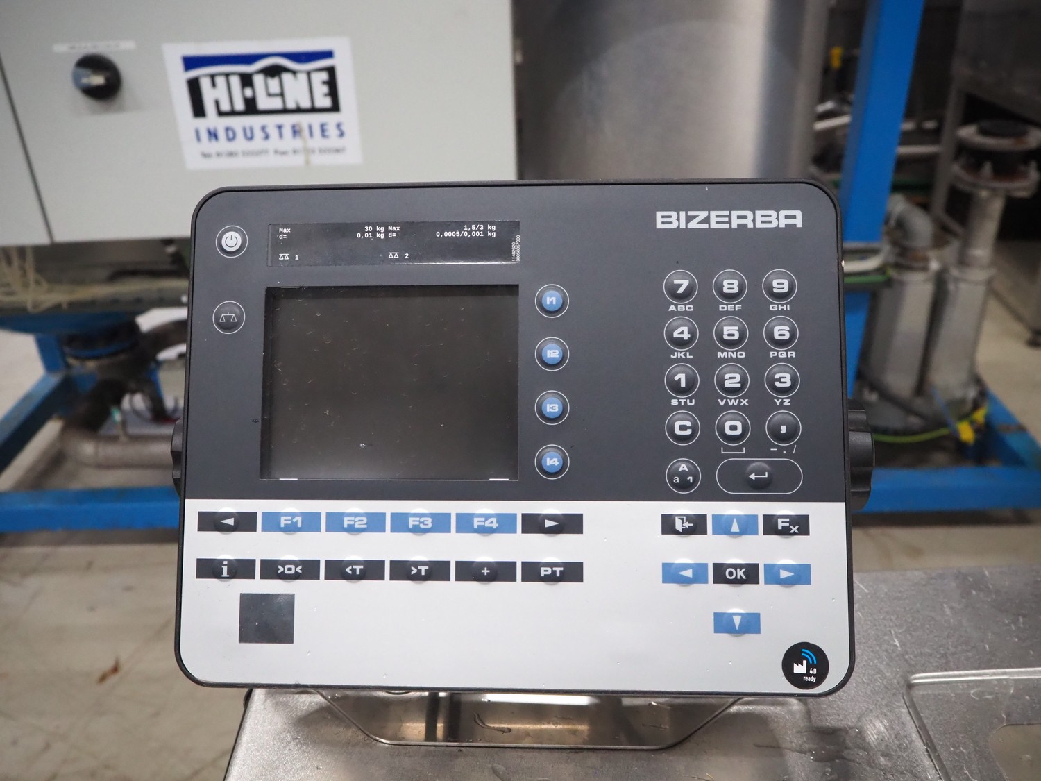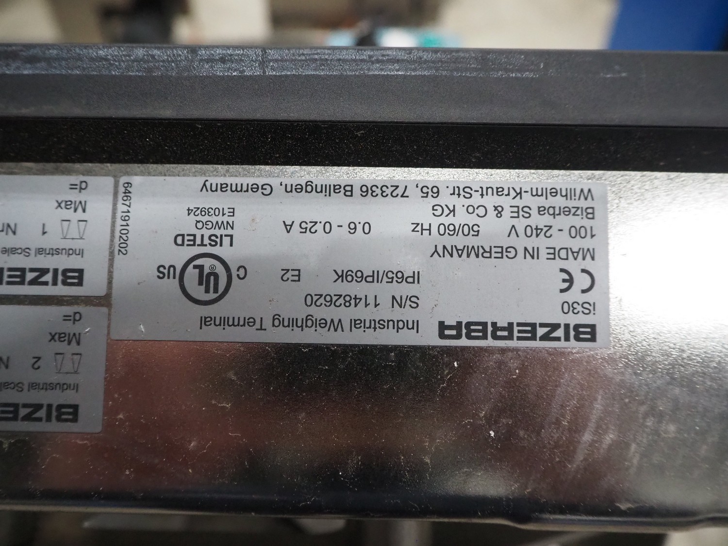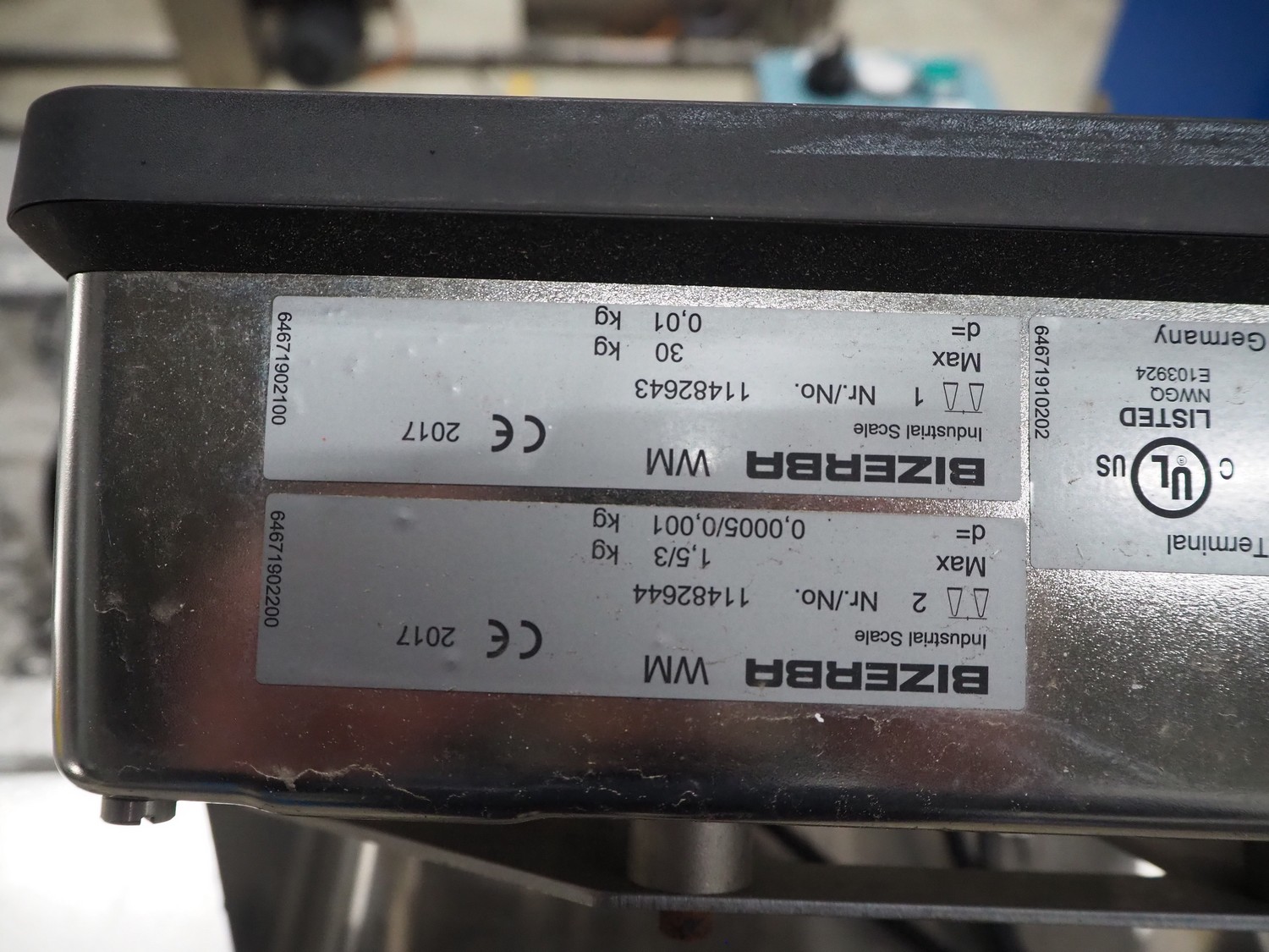 Bizerba industrial weighing scale terminal with 2 scales, model: iS30, serial number: 11482620, 100/240 V, 50/60 Hz, 0.6/0.25 A, maximum capacity: (1x) 30 kg, (1x) 1.5/3 kg, dimensions: 780 mm x 650 mm x 1350 mm.