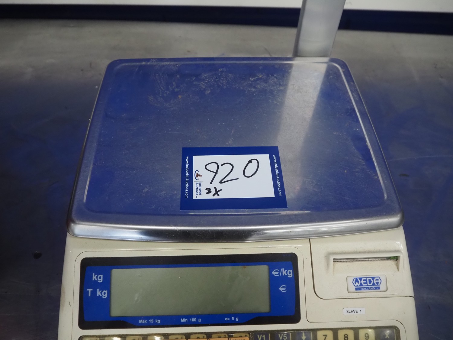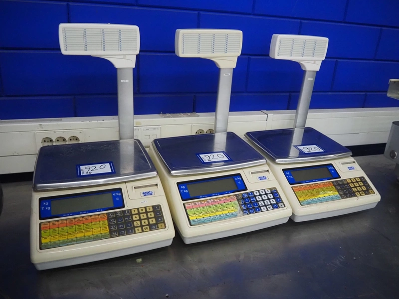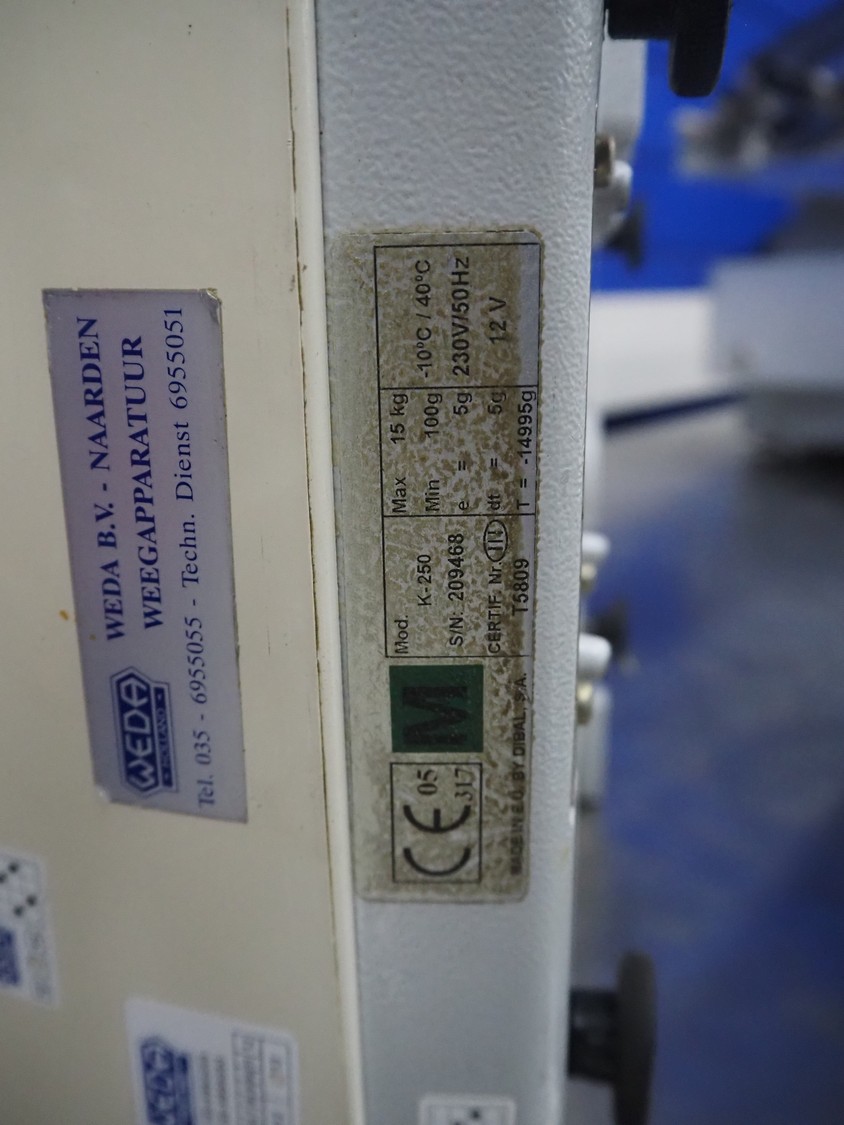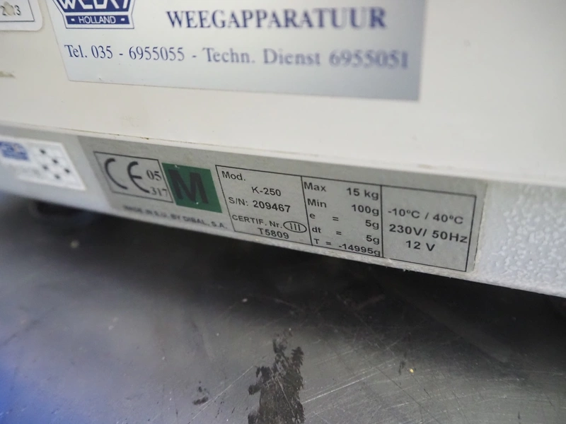 3 Dibal S.A. weighing scales, model: K-250, serial number: 209473 / 209468 / 209467, 230 V, 50 Hz, maximum weight: 15 kg, minimum weight: 100 gram, e= 5 gram, dt= 5 gram, T= - 14995 gram, dimensions scale: 320 mm x 250 mm, total dimensions: (3x) 330 mm x 450 mm x 550 mm.