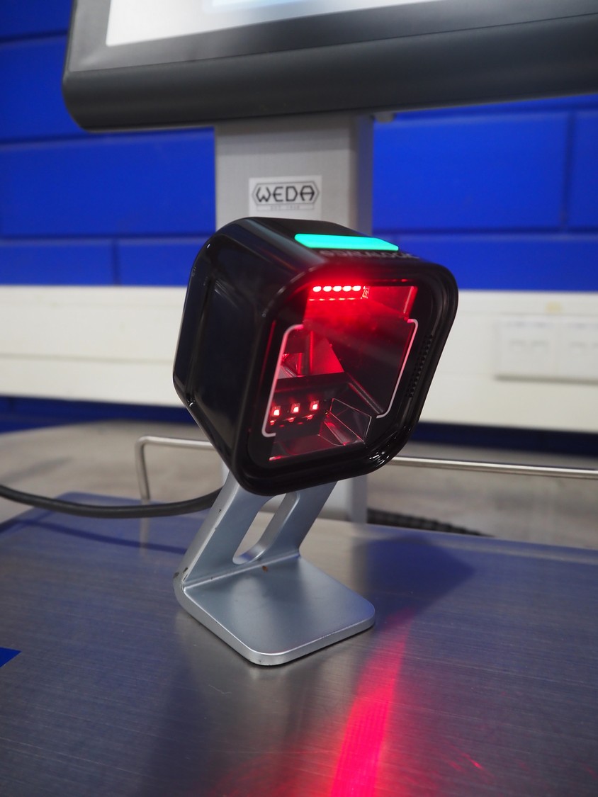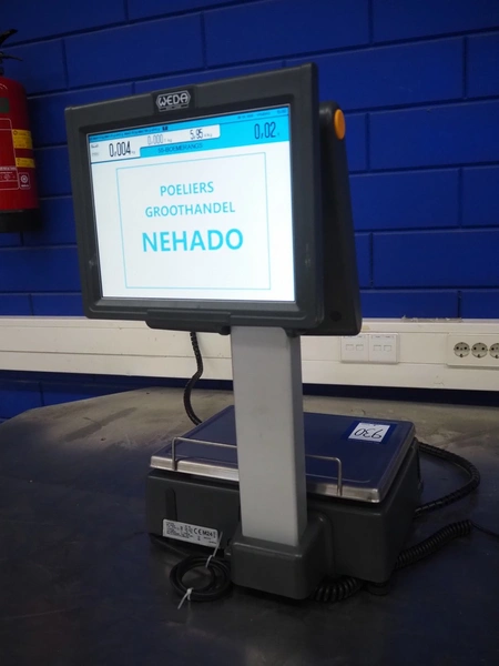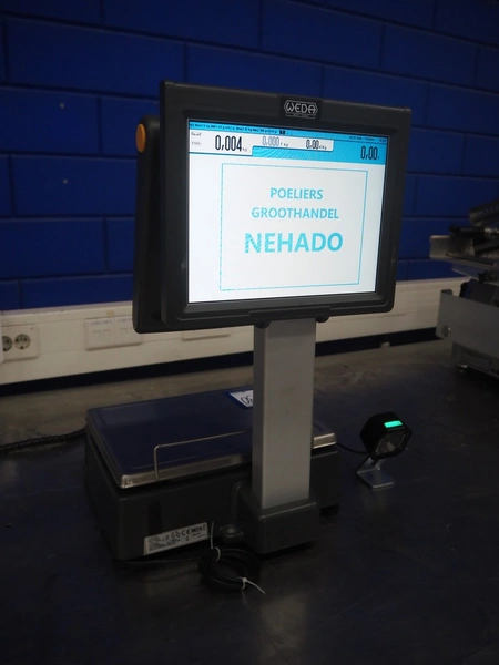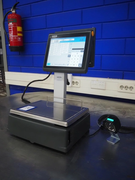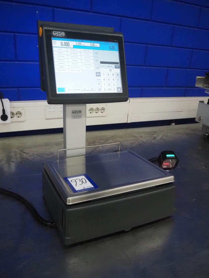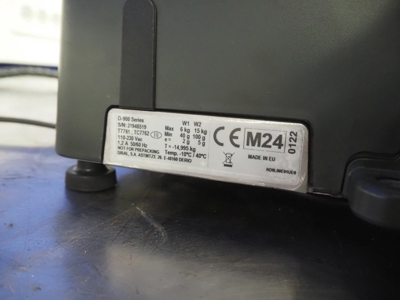 Dibal S.A. weighing scale with label printer and scanner, model: D-900 series, serial number: 31948519, 110-230 V, 50/60 Hz, 1.2 A, maximum weight: 15 kg, minimum weight: 100 gram, e= 5 gram, T= -14.995 kg, dimensions scale: 360 mm x 280 mm, total dimensions: 380 mm x 460 mm x 620 mm.