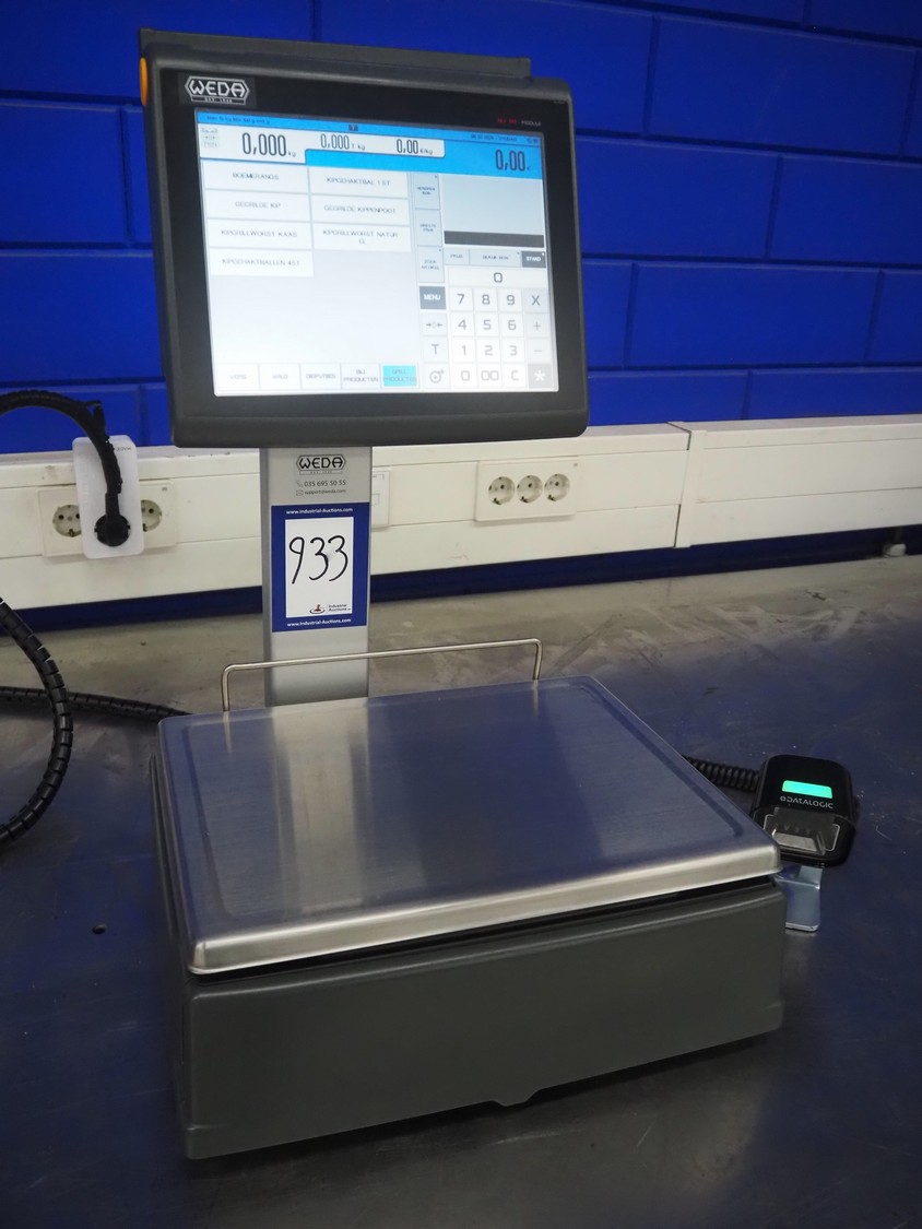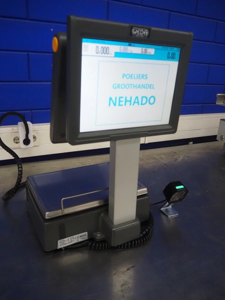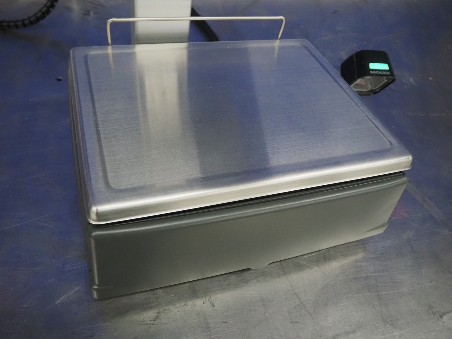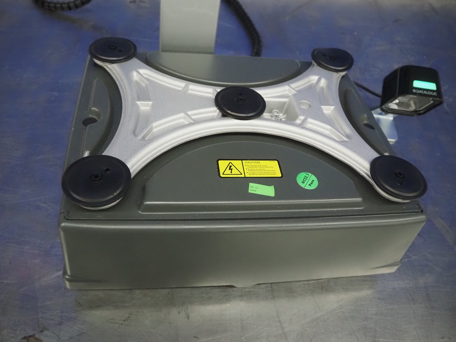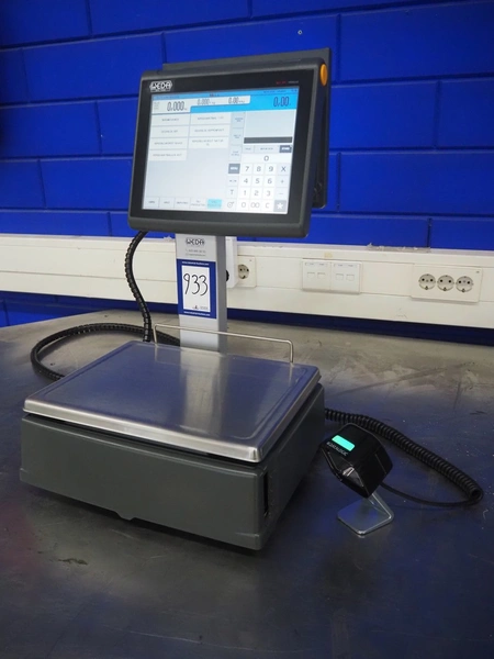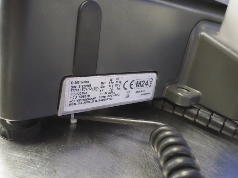 Dibal S.A. weighing scale with label printer and scanner, model: D-900 series, serial number: 31922556, 110-230 V, 50/60 Hz, 1.2 A, maximum weight: 15 kg, minimum weight: 100 gram, e= 5 gram, T= -14.995 kg, dimensions scale: 360 mm x 280 mm, total dimensions: 380 mm x 460 mm x 620 mm.