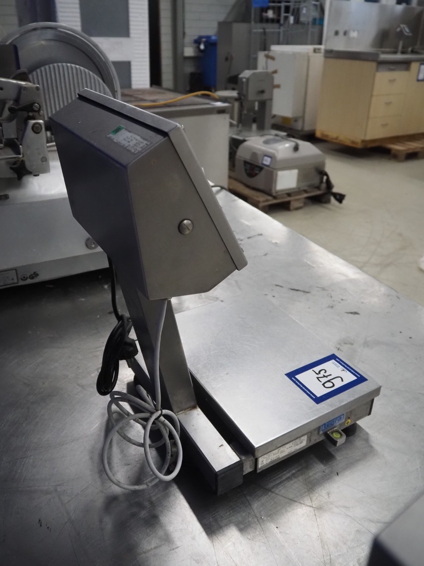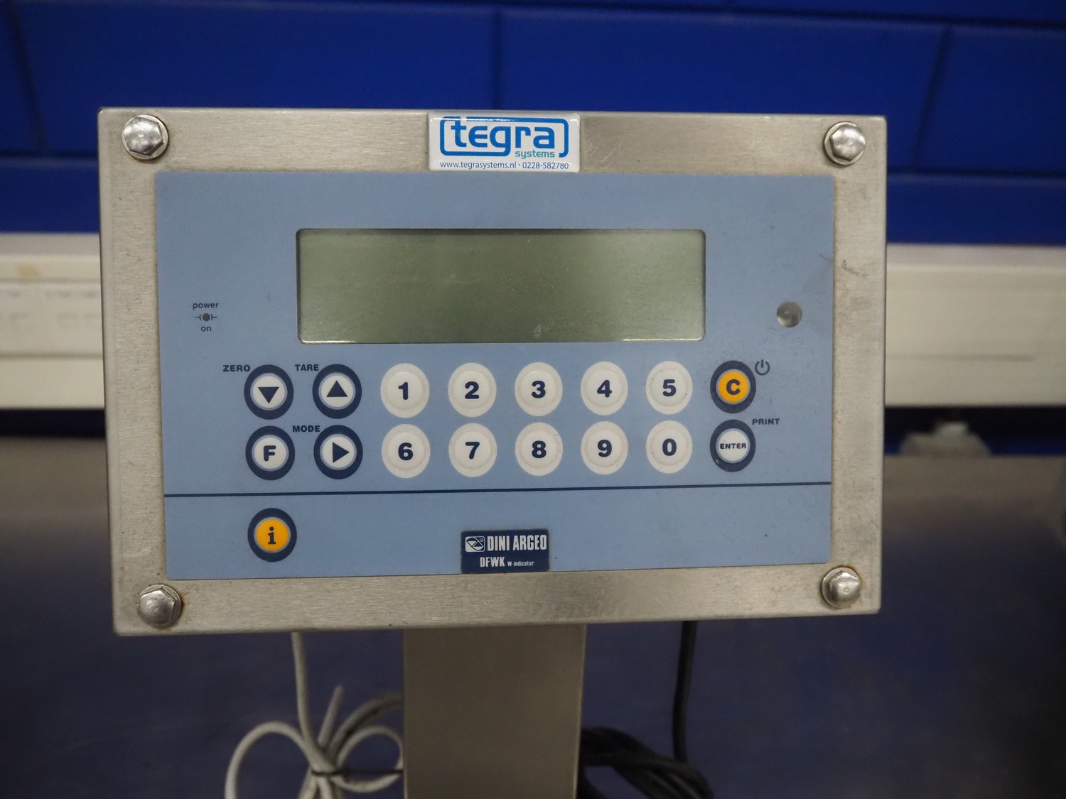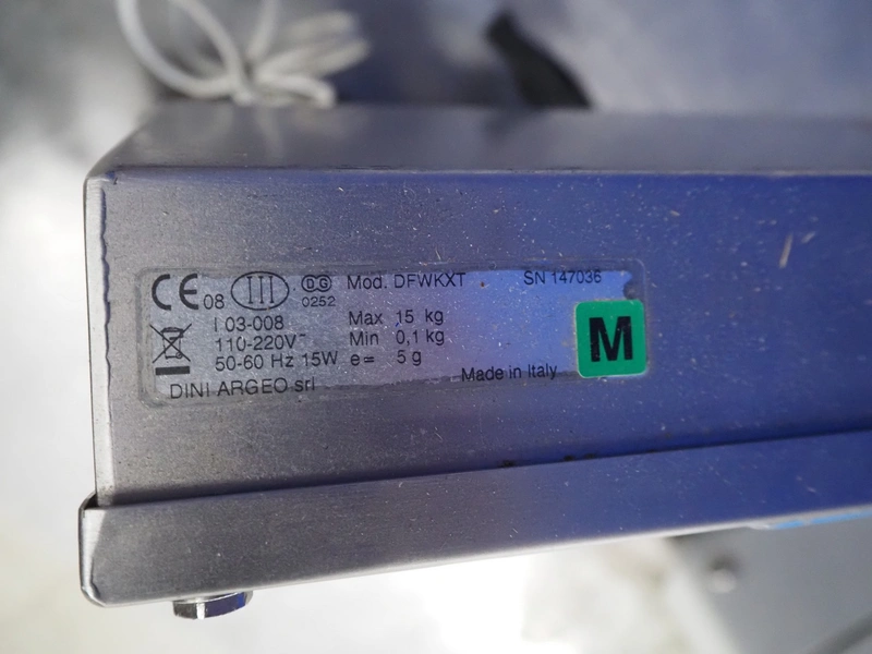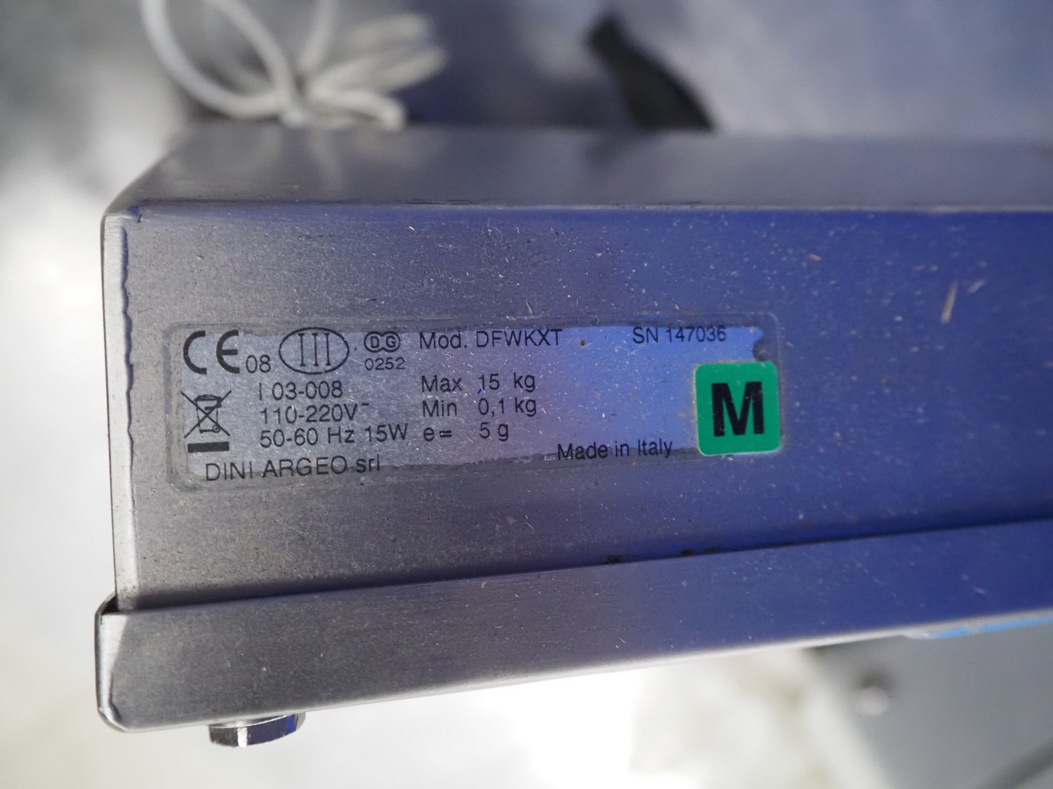 Dini Argeo srl weighing scale, model: DFWKXT, serial number: 147036, 110/220 V, 1 Ph, 50/60 Hz, 15 W, maximum capacity: 15 kg, minimum capacity: 0.1, e= 5 g, dimensions: 350 mm x 300 mm x 500 mm.