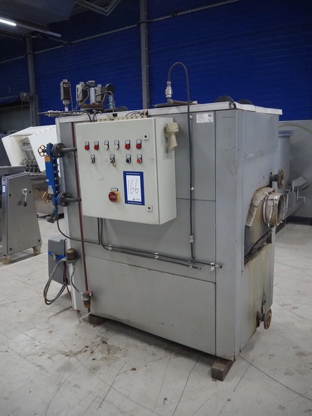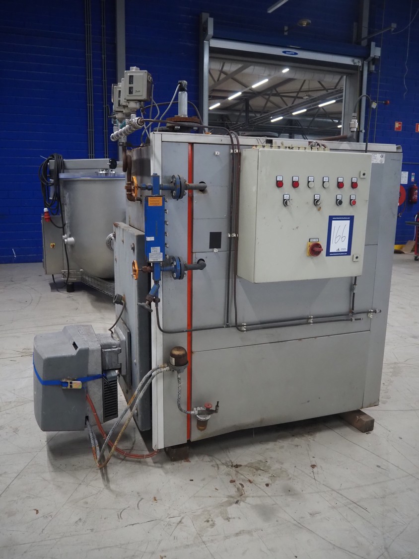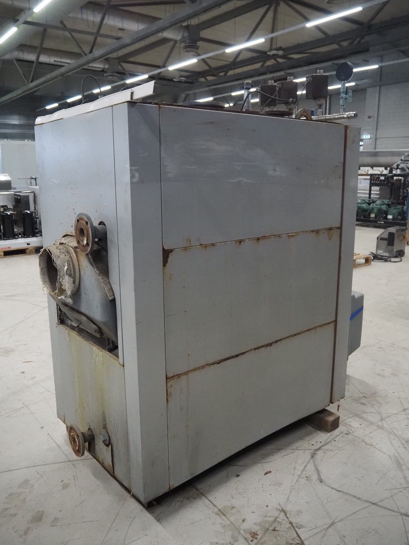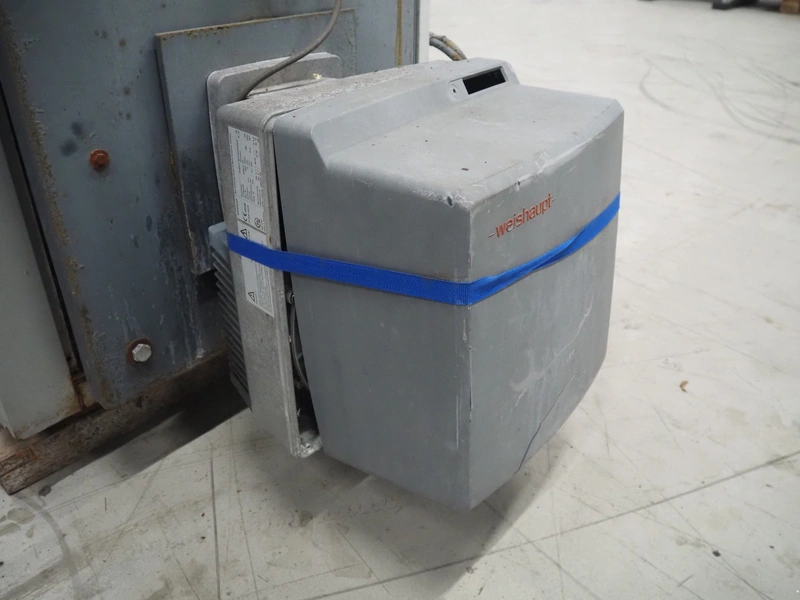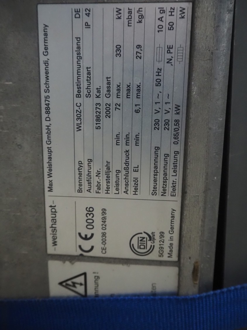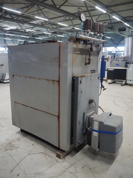 Viessmann steam generator with Weishaupt oil burner, type steam generator: Vitoplex 100, type: oil generator: WL30Z-C, factory number: 5186273, year of construction: 2002, 230 V, 1 Ph, 50 Hz, capacity: 27.9 kg per hour, total dimensions: 2120 mm x 1100 mm x 2000 mm.