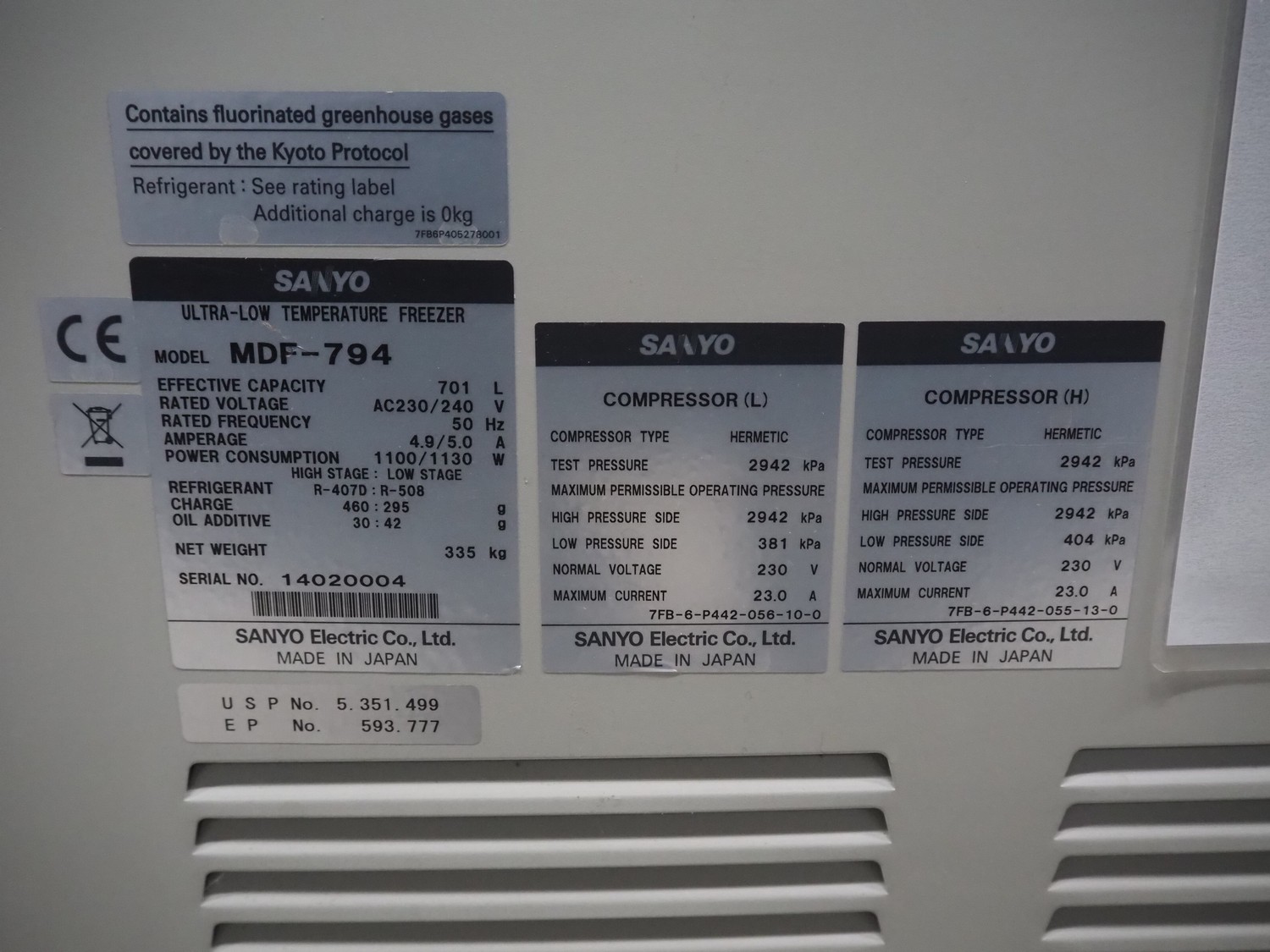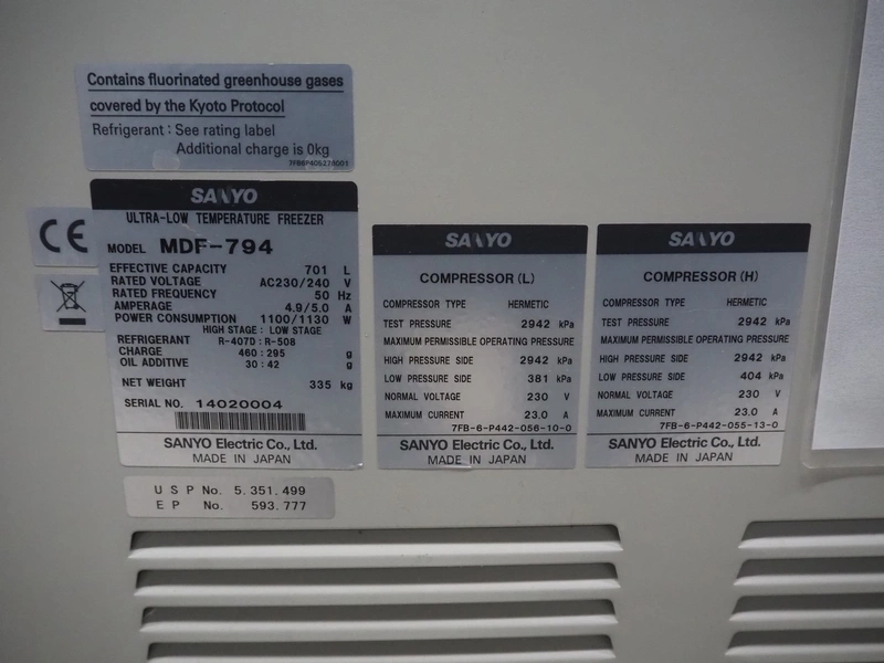 Sanyo Ultra-low temperature freezer, model: MDF-794, serial number: 14020004, 230/240 V, 50 Hz, 4.9/5.0 A, 1100/1130 W, refrigerant: R-407D:R508, 460:295 gram, volume: 701 liter, dimensions: 2570 mm x 870 mm x 1080 mm.