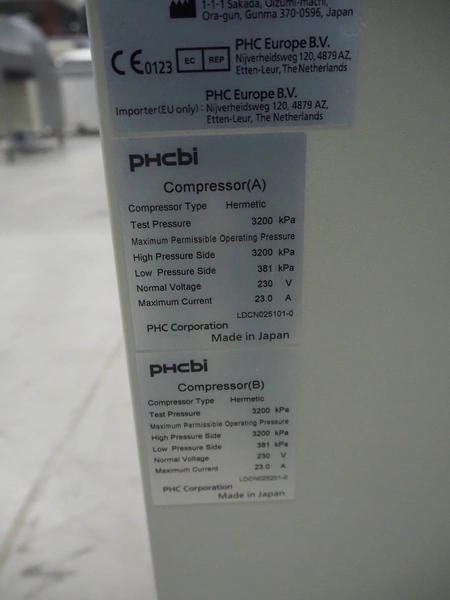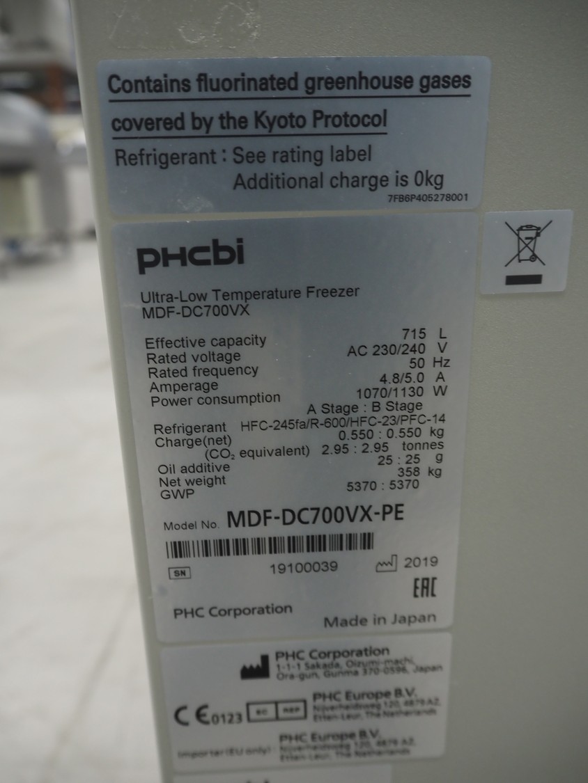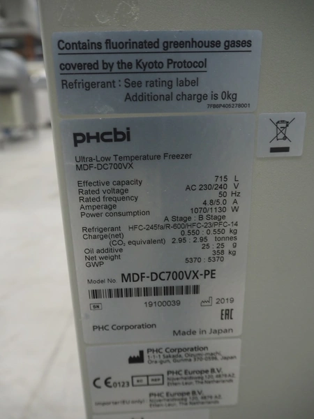 PHCBI ultra-low temperature freezer, model: MDF-DC700VX-PE, serial number: 19100039, year of construction: 2019, 230/240 V, 50 Hz, 4.8/5.0 A, 1070/1130 W, refrigerant: HFC-245fa/R-600/HFC-23/PFC-14, 0.550 kg, volume: 715 liter, dimensions: 2300 mm x 960 mm x 1070 mm.