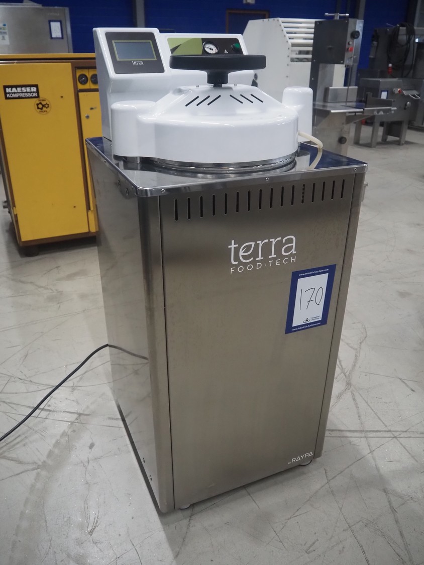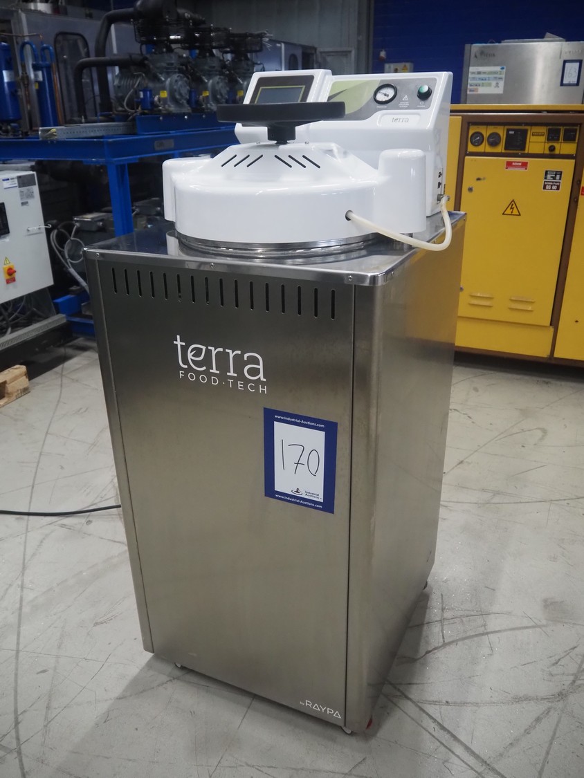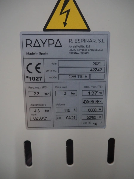 Raypa steam sterilizer, model: CFS.110.V, serial number: 42242, year of construction: 2021, 400 V, 3 Ph, 50/60 Hz, 16 A, 6000 W, volume: 115 liter, test pressure: 4.3 bar, maximum temperature: 137° celcius, dimensions: 610 mm x 670 mm x 1430 mm.