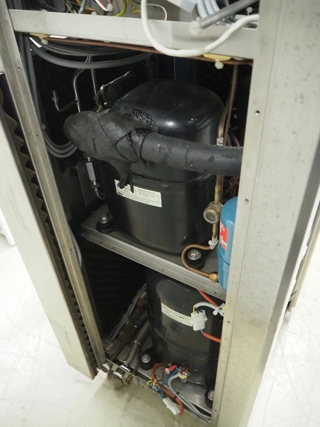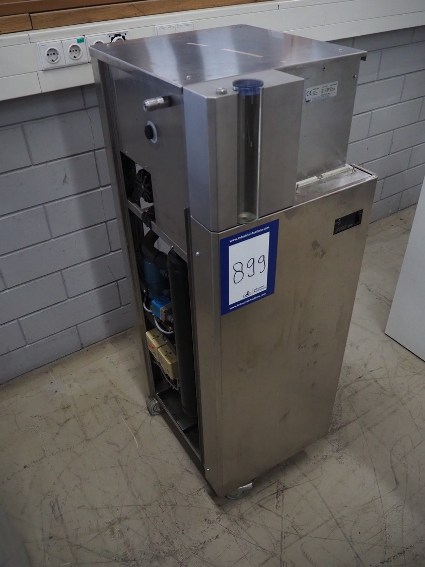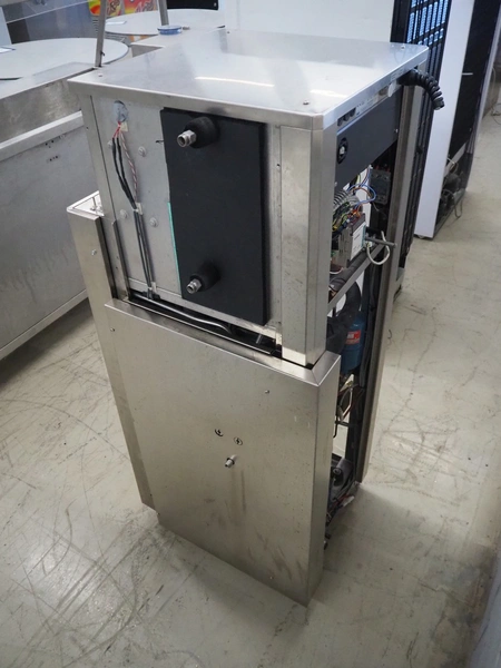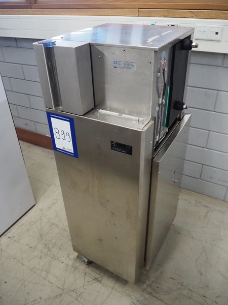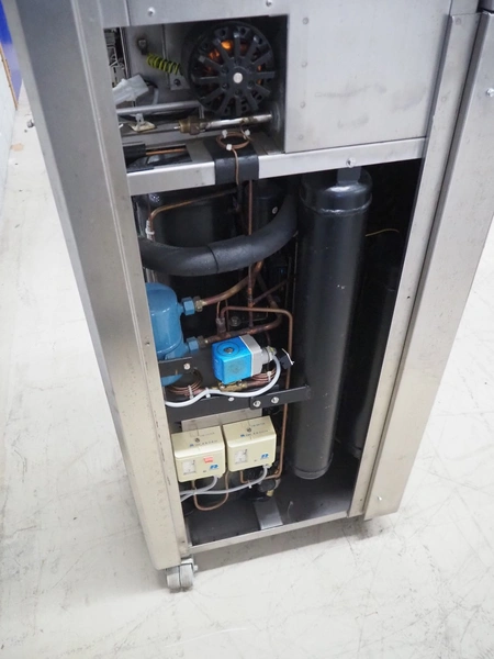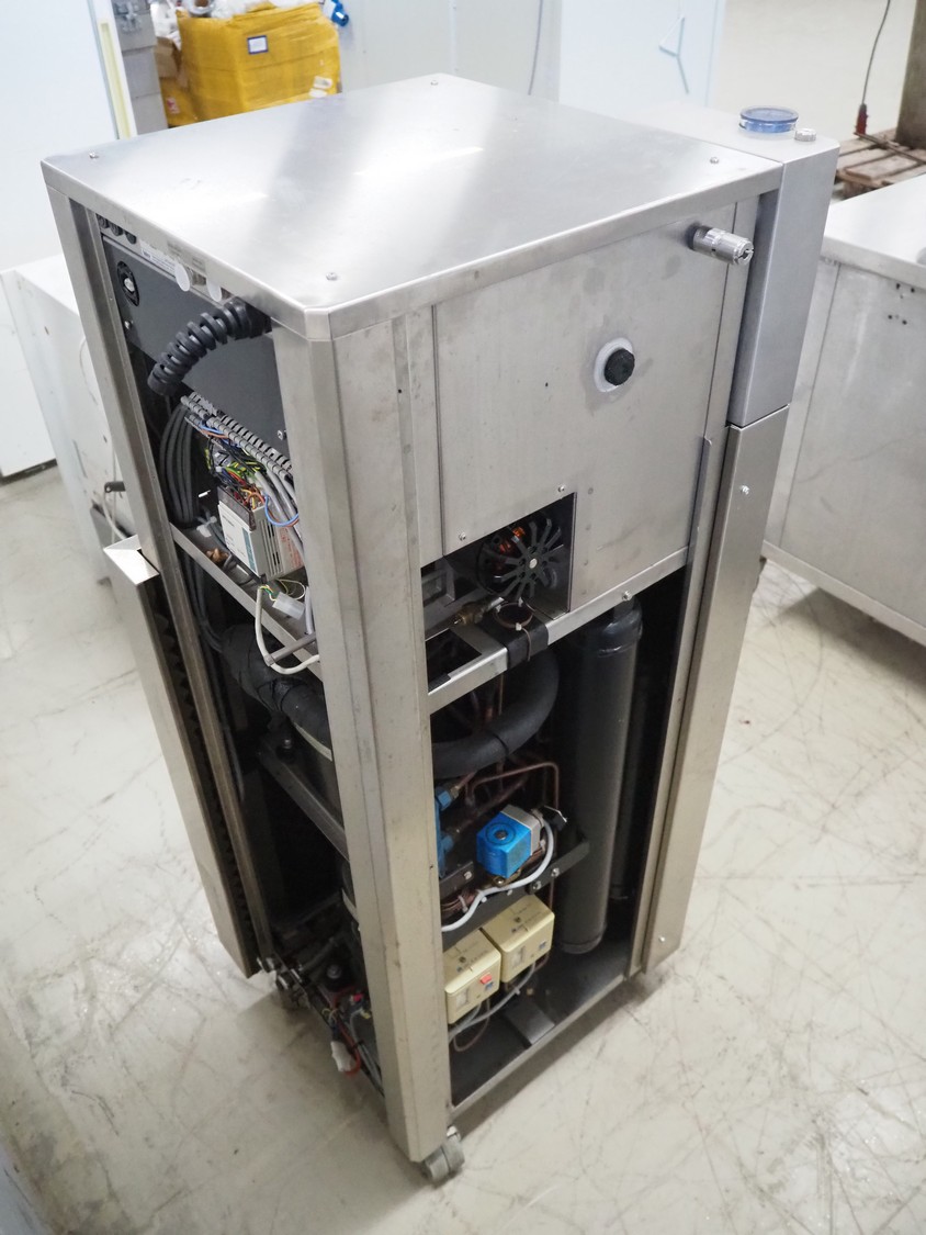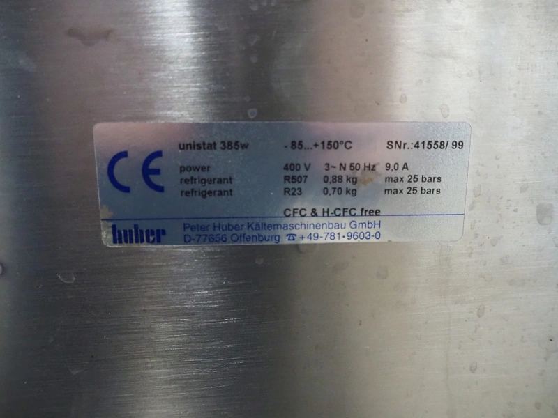 Huber mobile circulation thermostat for open baths and closed systems, model: Unistat 385w, serial number: 41558/99, 400-440 V, 3 Ph, 50/60 Hz, 9.5 A, refrigerant: R507, 0.88 kg, dimensions: 560 mm x 500 mm x 1340 mm. Incomplete.
