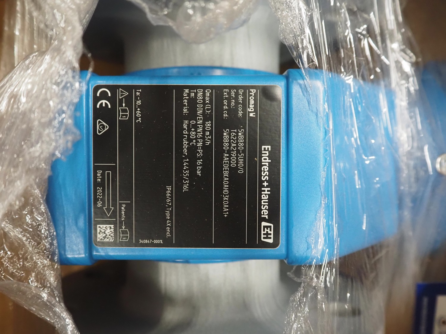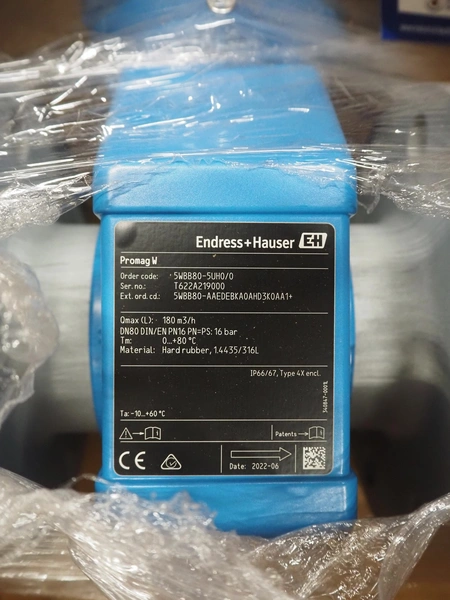 Endress + Hauser flowmeter, model: Promag W, serial number: T622A219000, DN 80, Q-maximum: 180 m³ per hour.