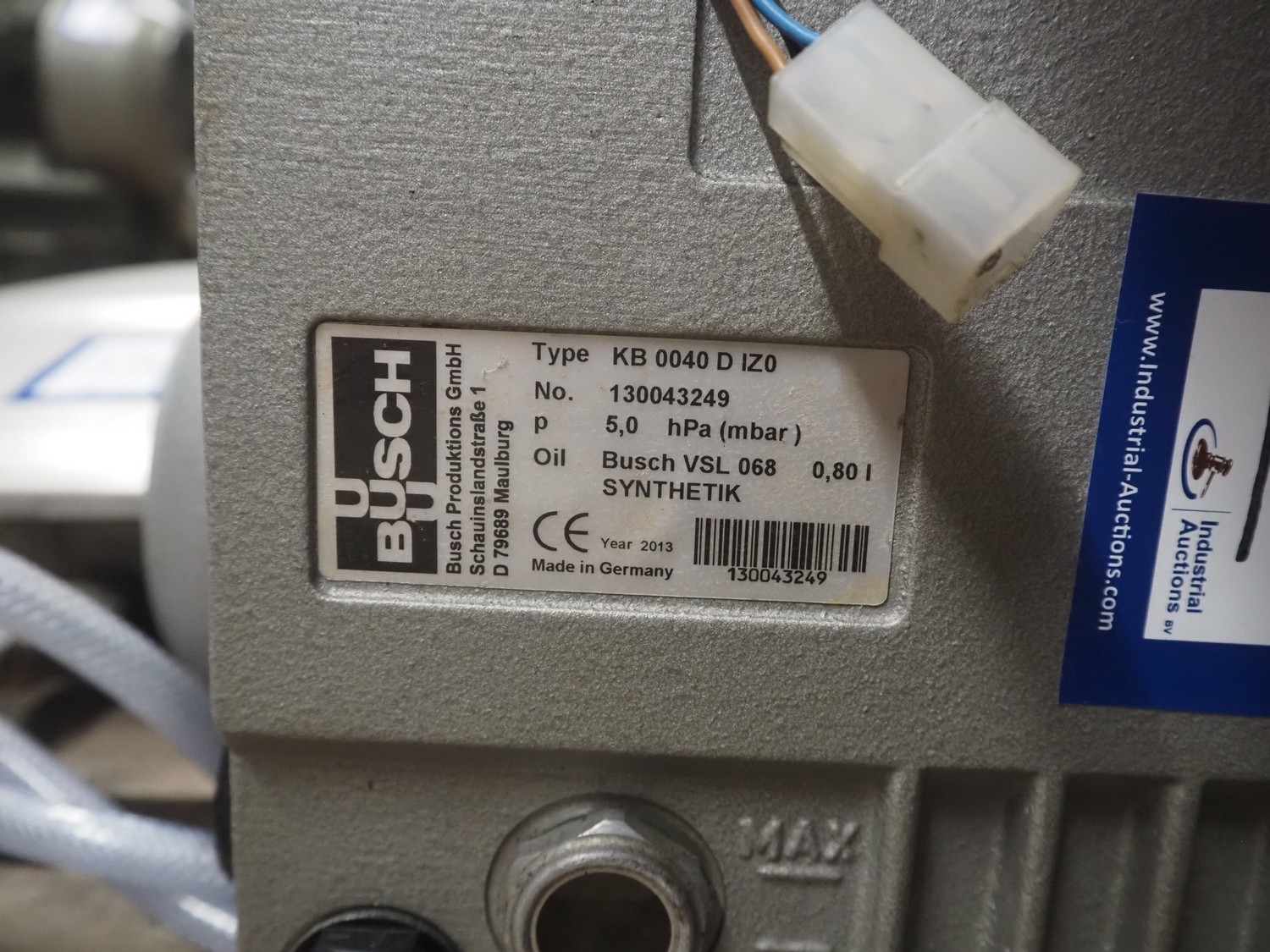Busch vacuum pump, type: KB 0040 D IZ0, number: 130043249, year of construction: 2013, capacity: 40 m³ per hour, dimensions: 450 mm x 280 mm x 450 mm.