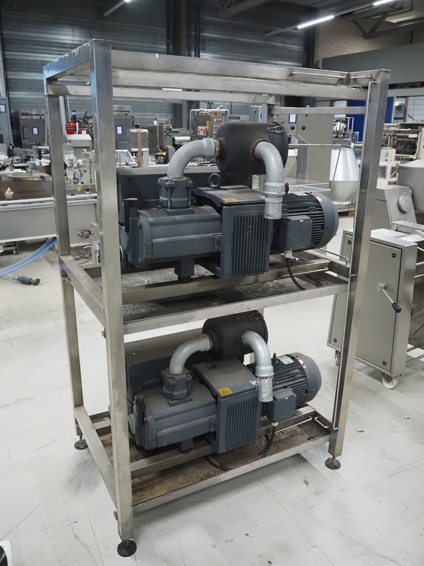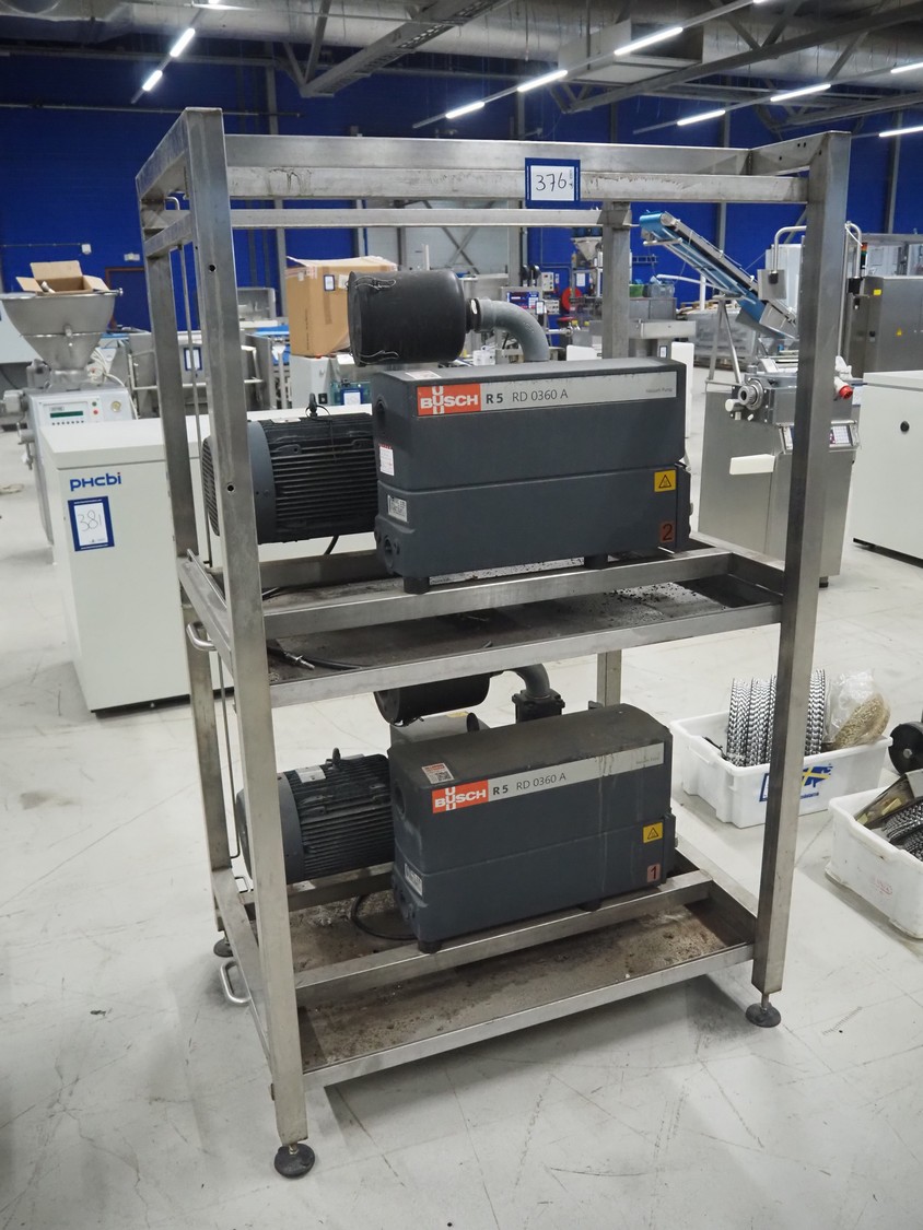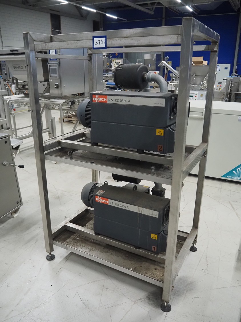 S/s rack with 2 Busch vacuum pumps, type: (2x) RD 0360 A 503, serial number: CHM120330107 / CHM120330110, year of construction: 2020, capacity: (2x) 300 m³ per hour, total dimensions: 1150 mm x 800 mm x 1850 mm.