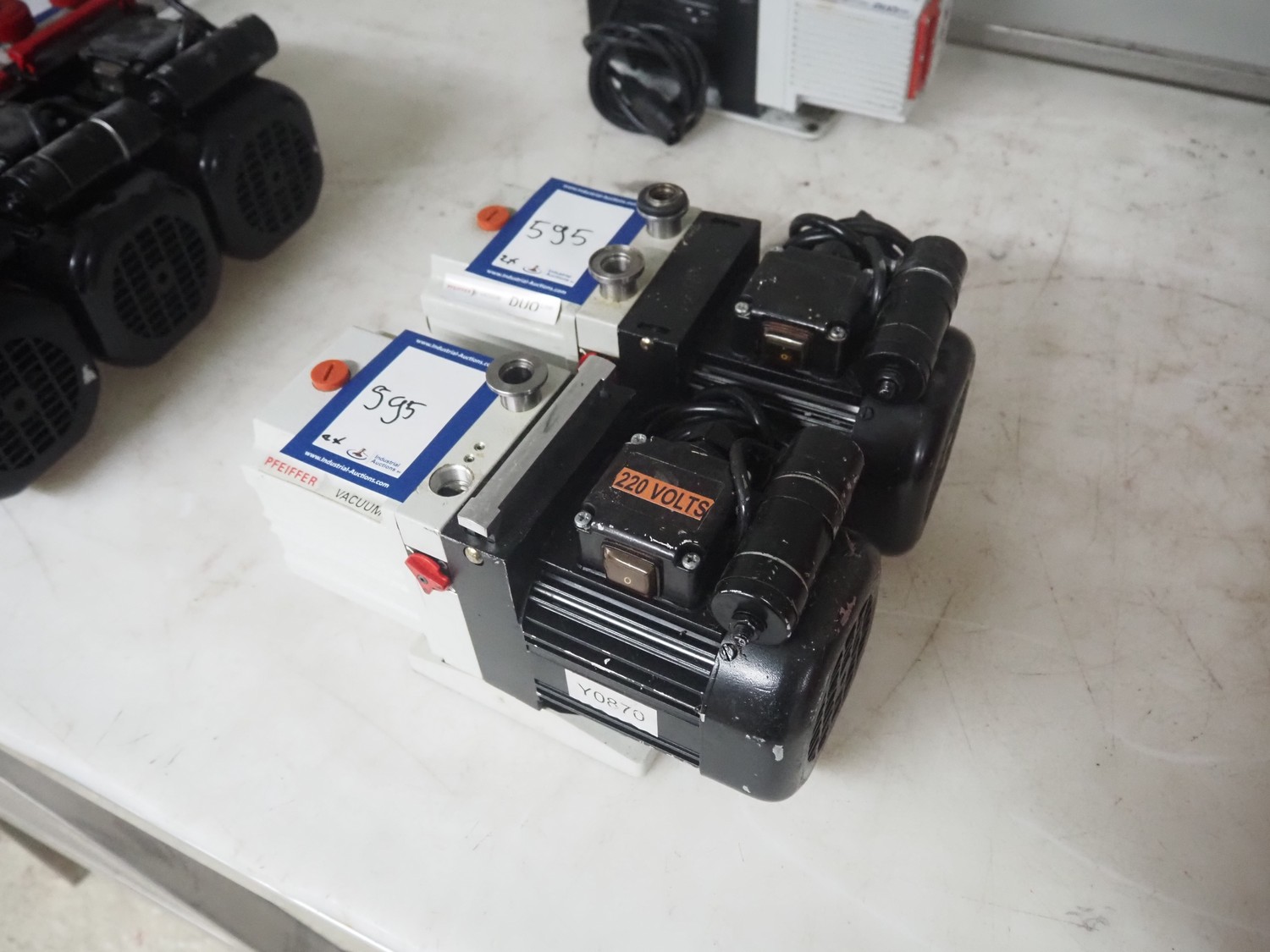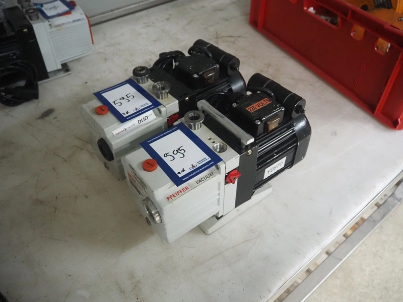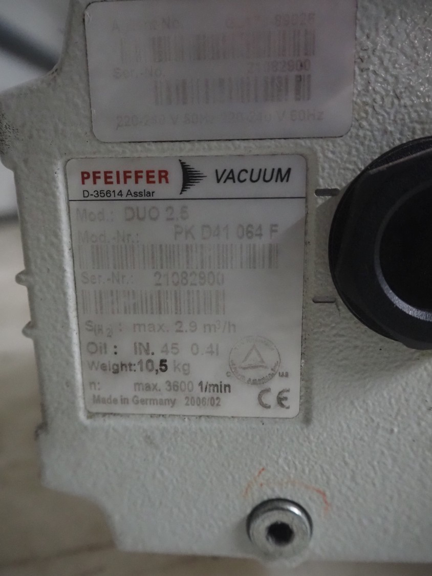 2 Pfeiffer Vacuum pumps, model: DUO 2.5 and DUO 2.6, year of construction: 2005/2006, capacity: 2.9 m³ per hour, weight: 10.5 kg, dimensions: (3x) 310 mm x 120 mm x 190 mm.