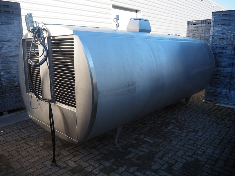 Alfa-Laval s/s milk cooling tank with mixing arm, type: HCA-C 6000, serial number: 10284, volume: 6350 litres, dimensions: 3350 mm x 1500 mm x 1750 mm. With integrated cooling system.