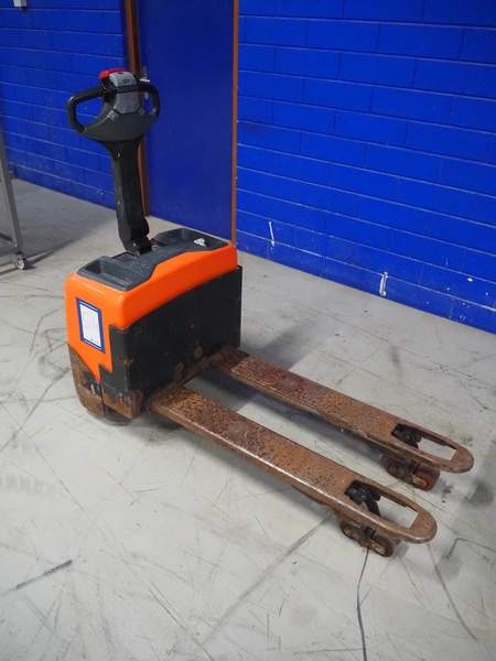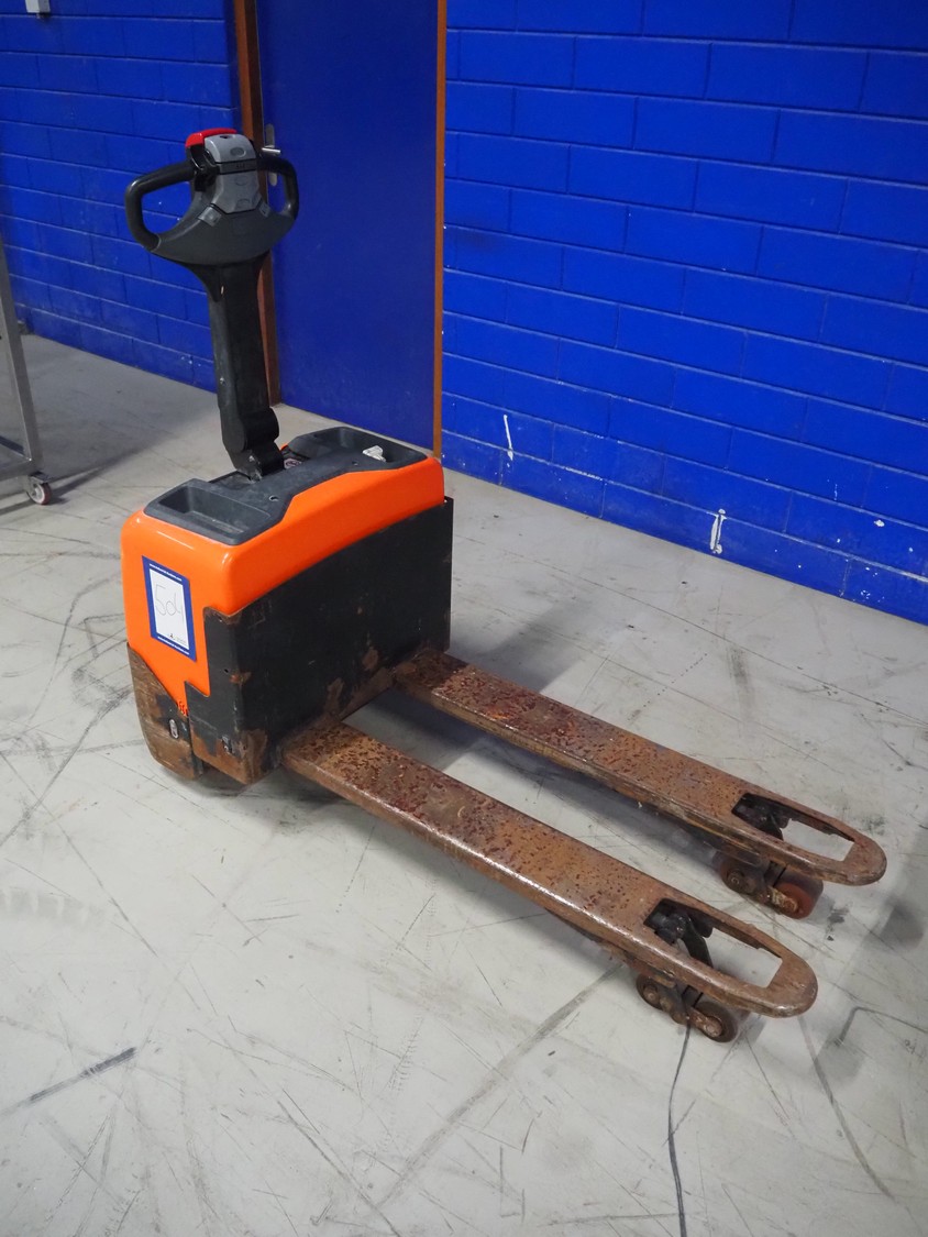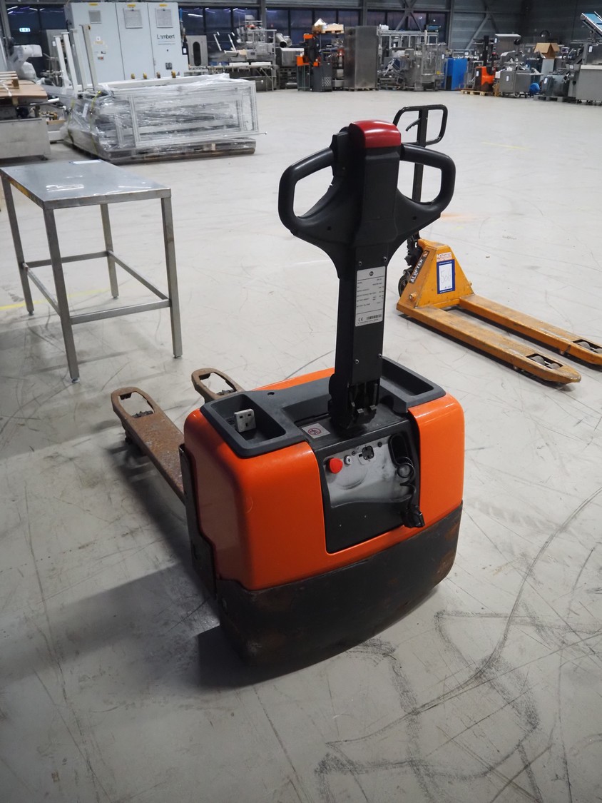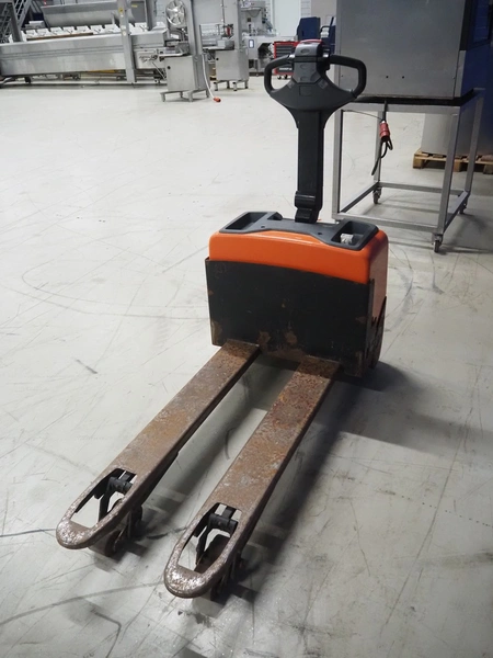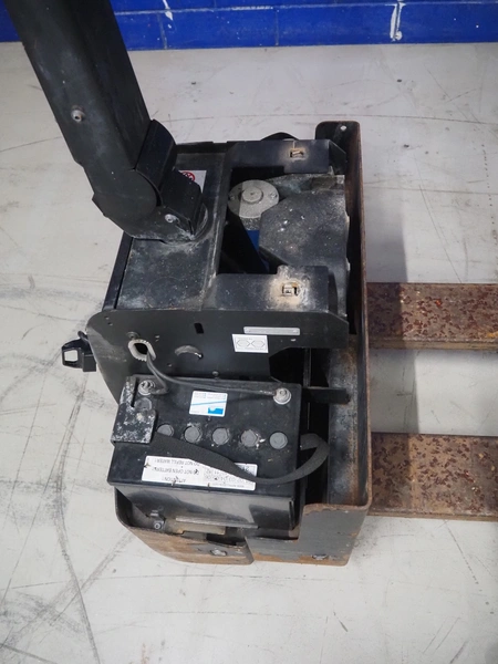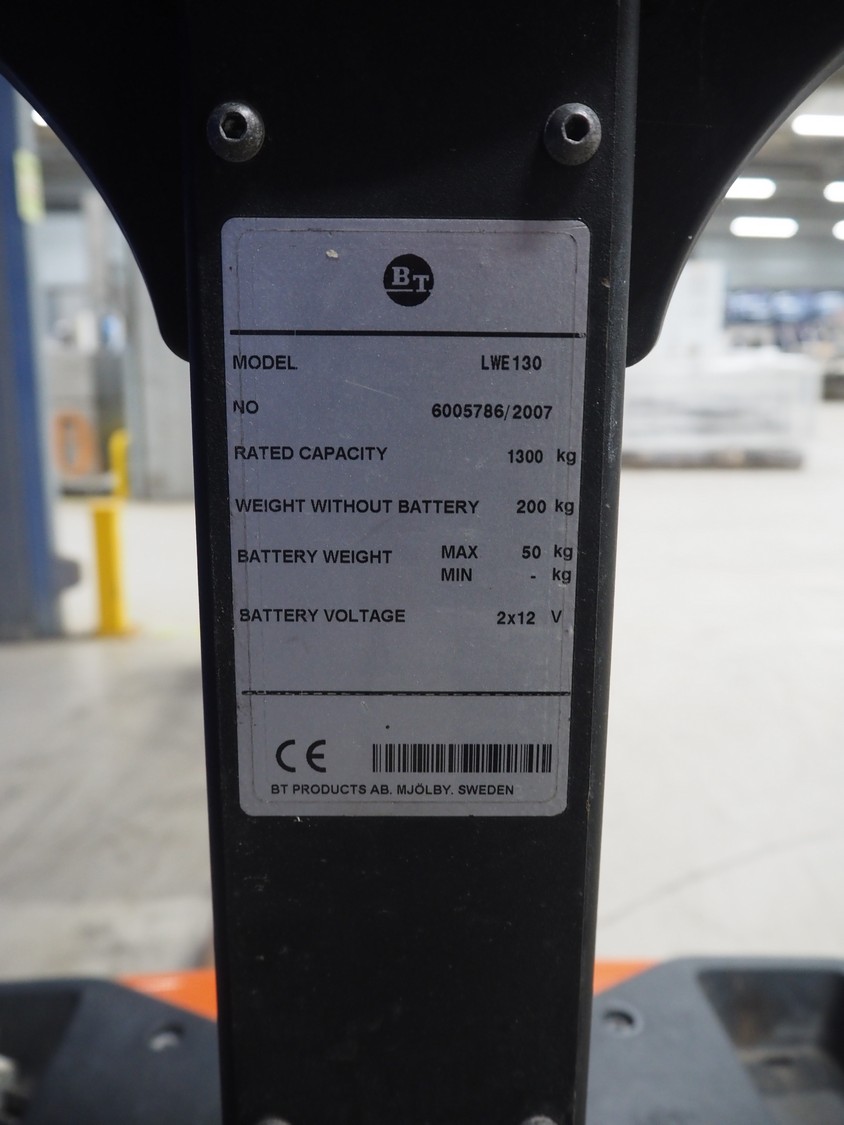 BT electrical pallet lifter, model: LWE130, number: 6005786, year of construction: 2007, capacity: 1300 kg, fork length: 1150 mm, total dimensions: 1600 mm x 700 mm x 1350 mm.