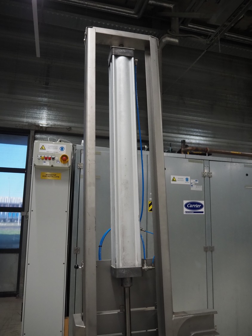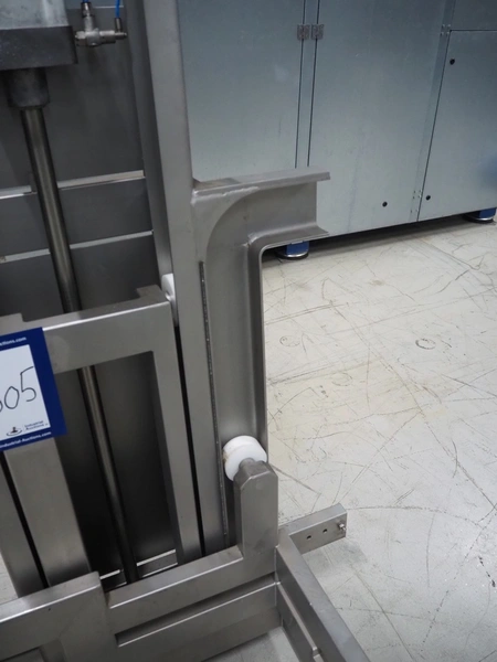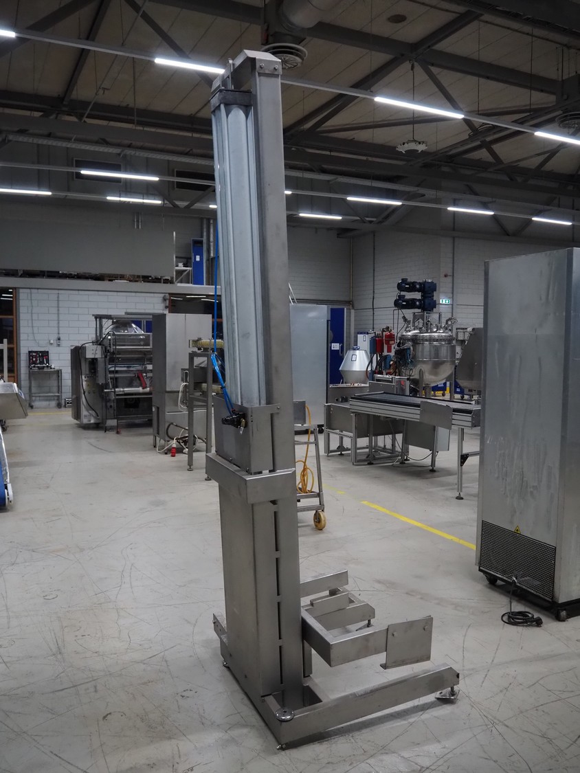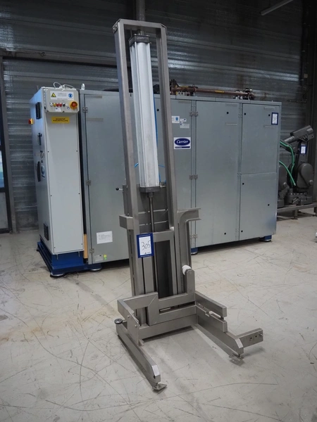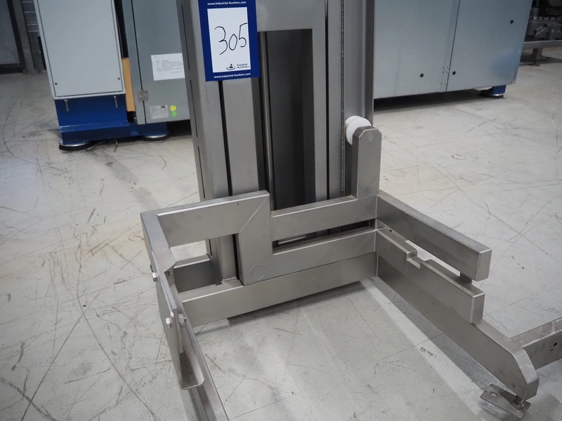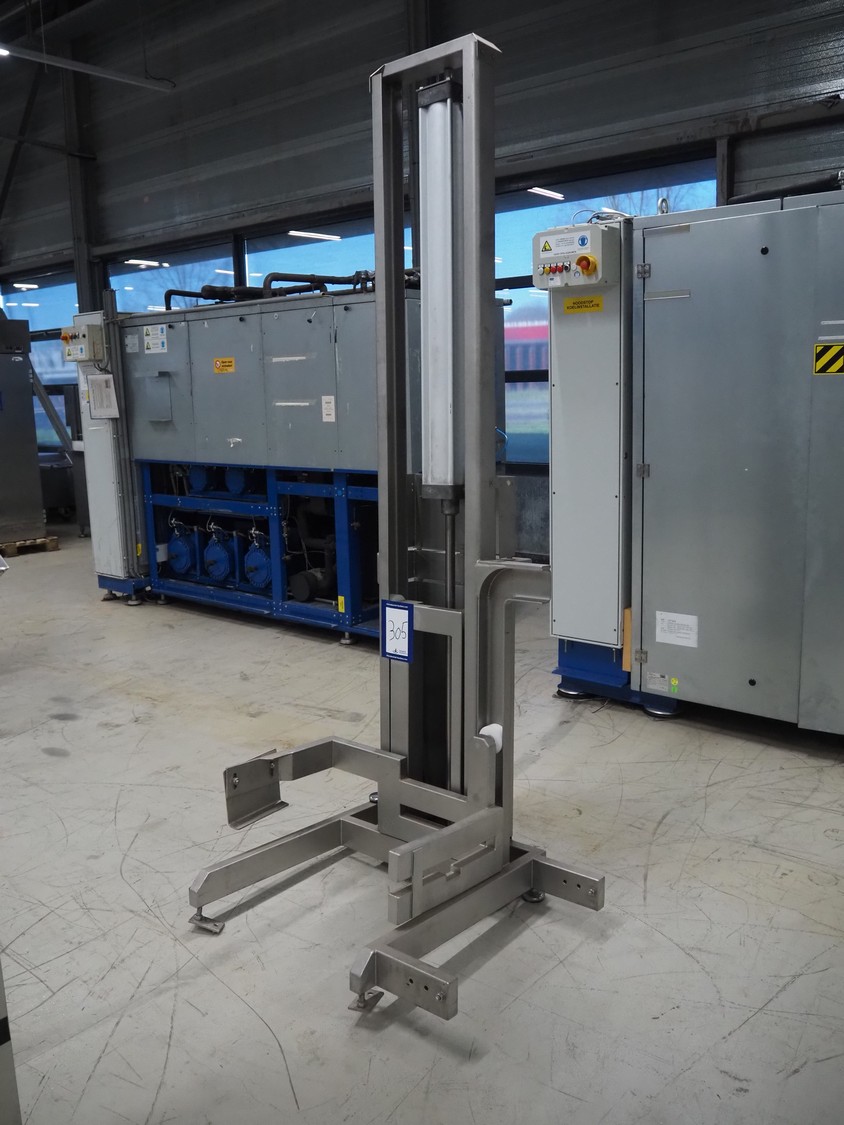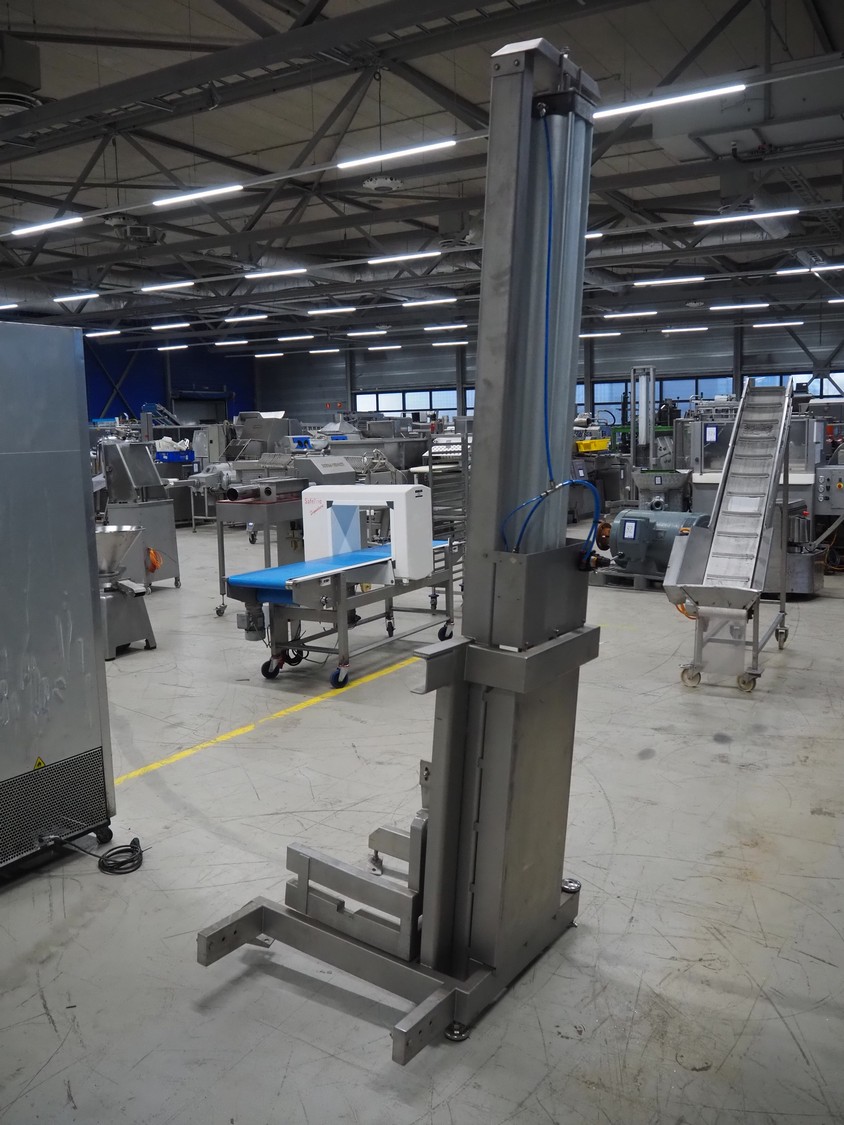 Industrilyften lifter for 200 liter meat bins, type: IL 300 PK, maximum capacity: 300 kg, lifting height: 1000 mm, total dimensions: 1000 mm x 840 mm x 2620 mm.