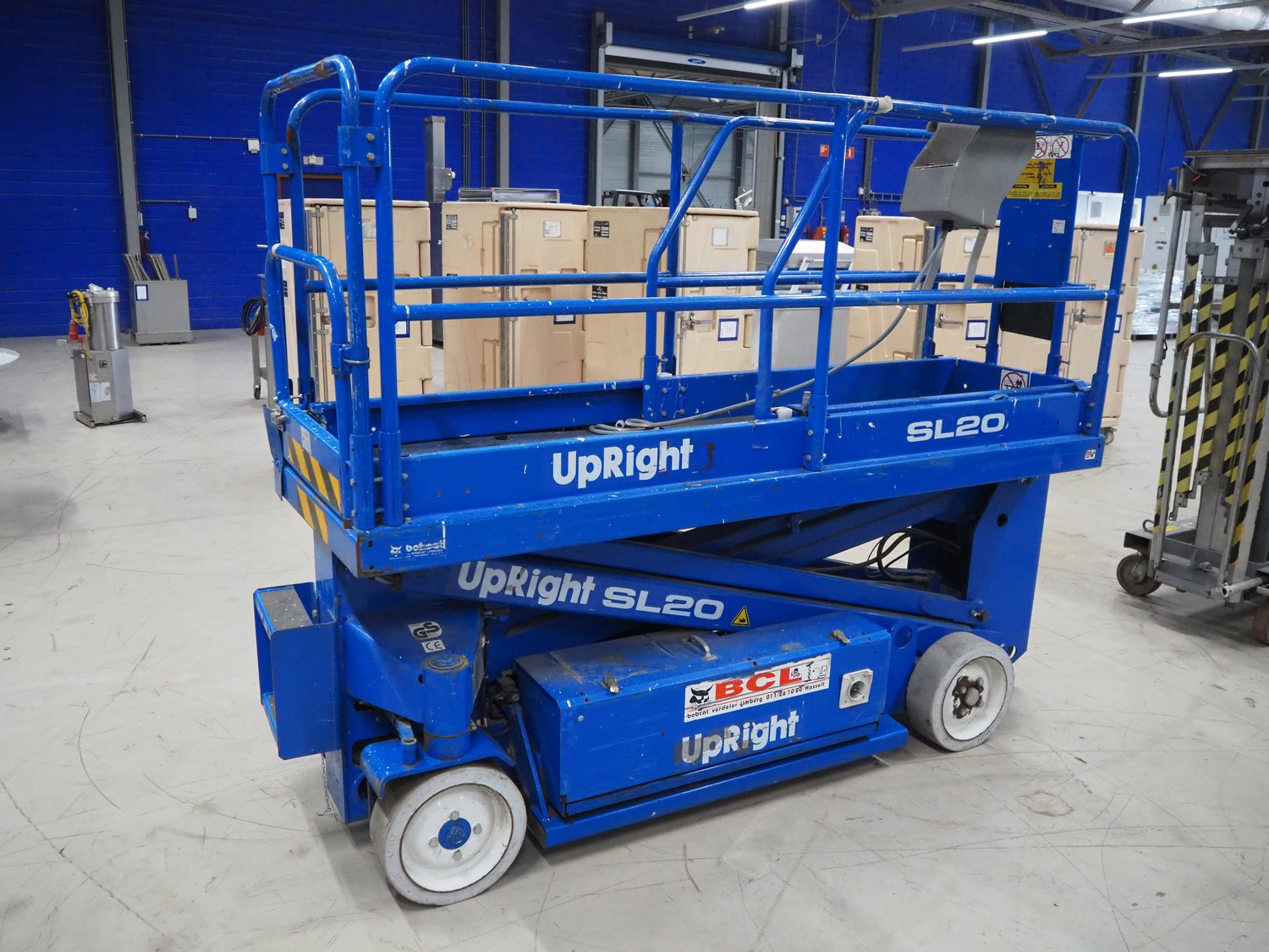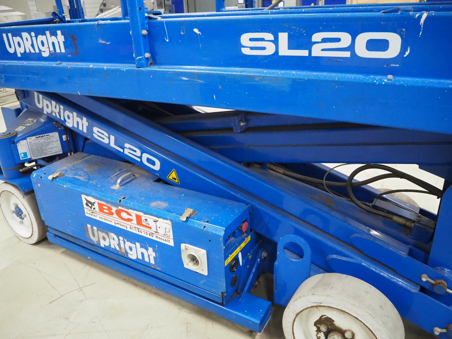 UpRight Inc. mobile scissor lift, type: SL20, model: 101000-011, serial number: 8899, maximum capacity: 351 kg, maximum platform height: 6110 mm, dimensions: 2700 mm x 850 mm x 2000 mm.