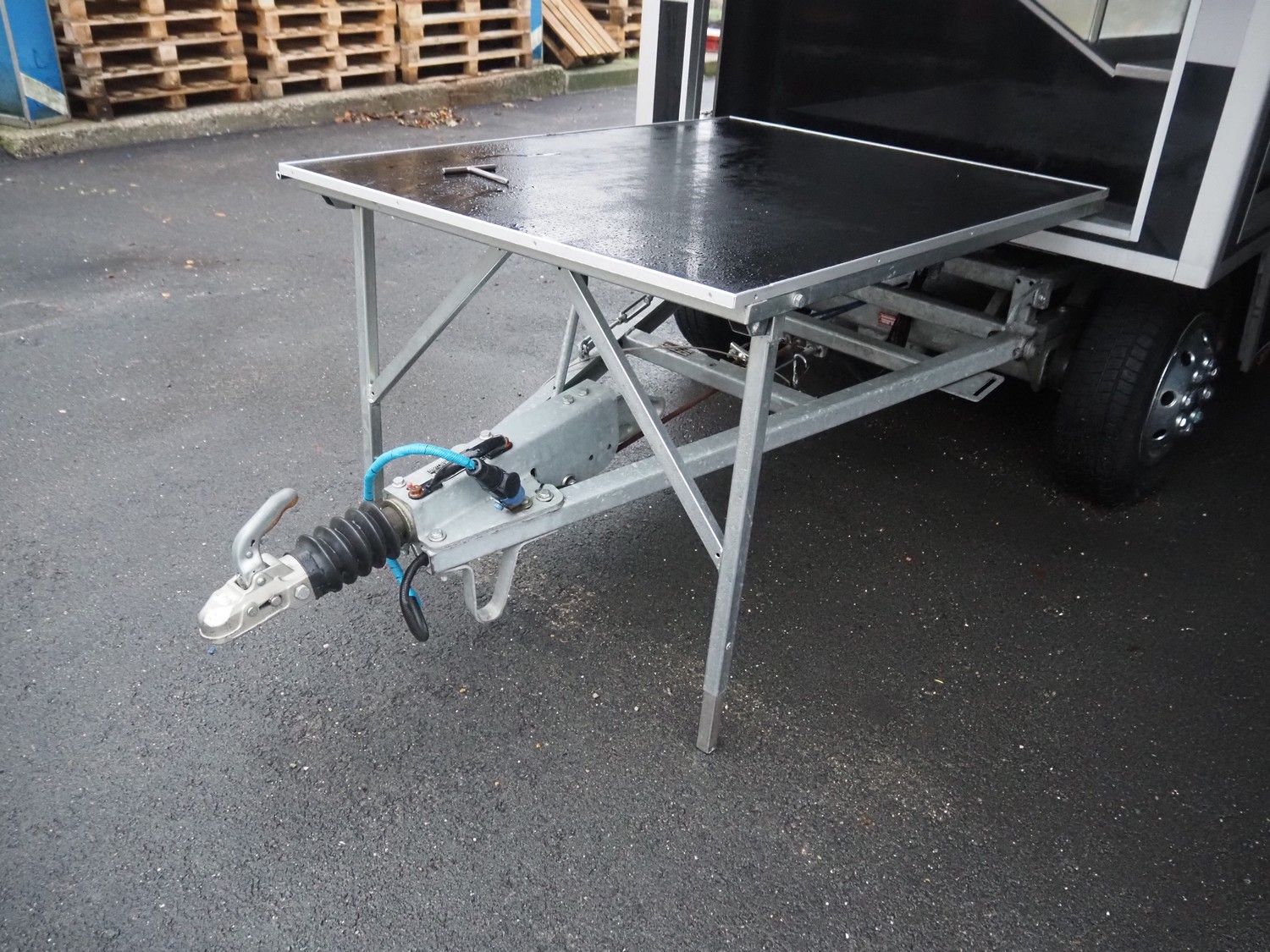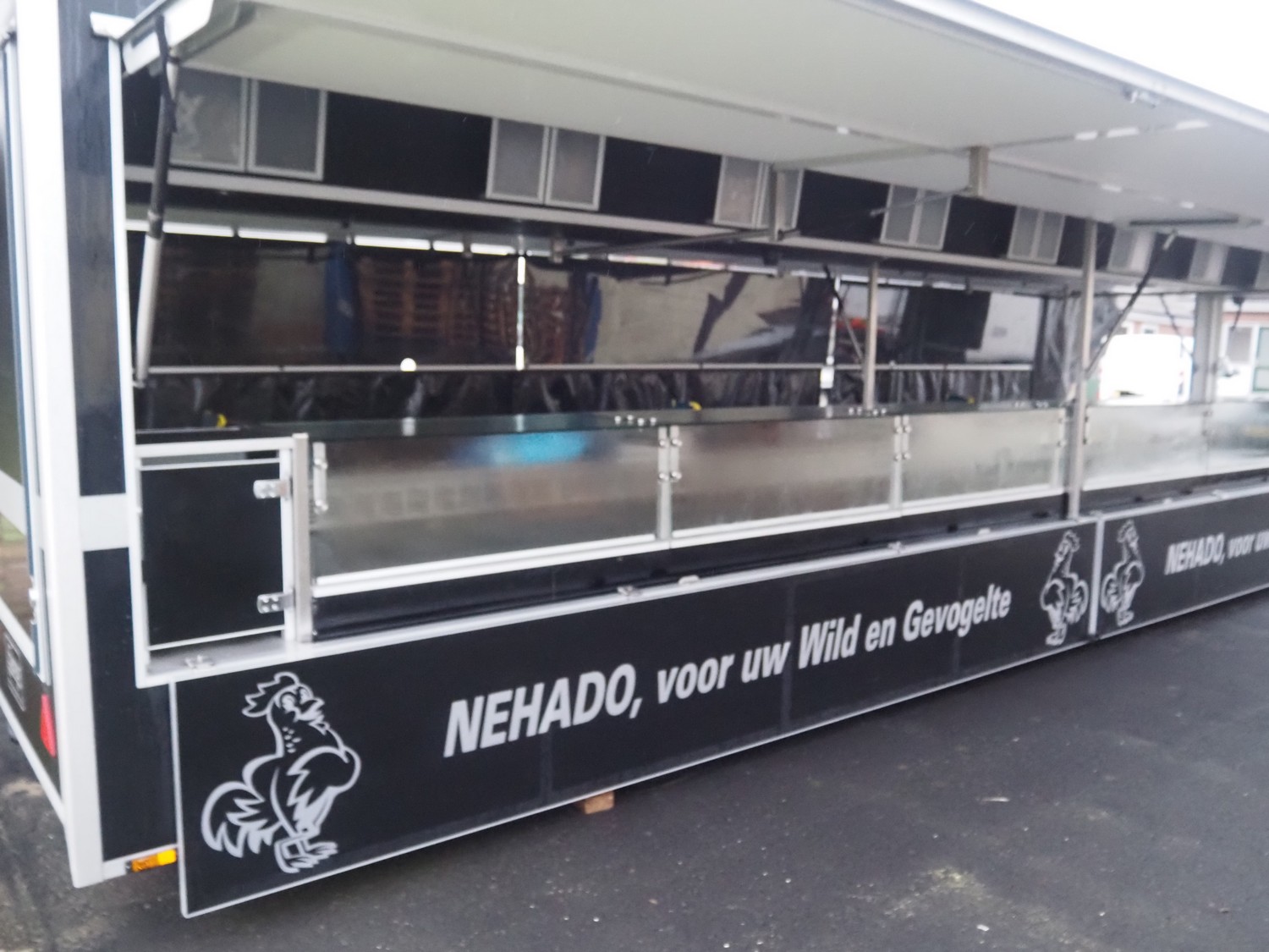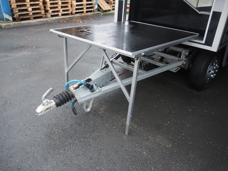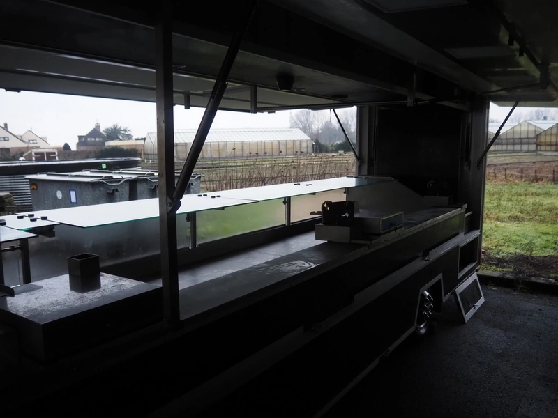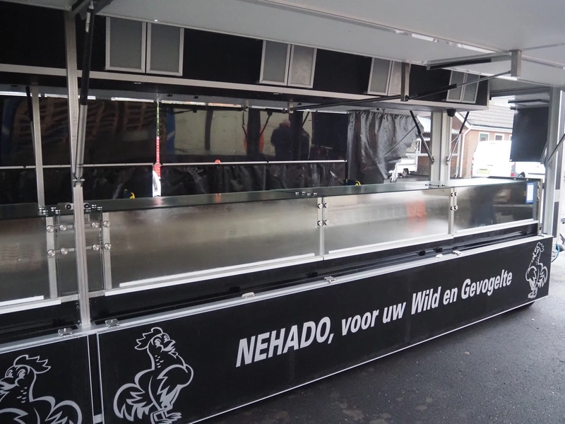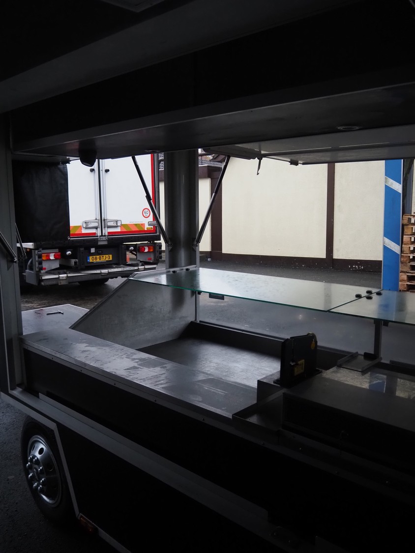 Kuiper Wagenbouw/Evers vending trailer with refrigeration counter, model: Kupa 35 Markavan 9 m, serial number: XL9KD350220090420, first registration: 2020 (no license plate available), MOT expiry date: unknown, weight: 3500 kg, twin-axle, expandable width on left and right sides, transport dimensions: approximately 9000 mm x 1500 mm x 2950 mm, total dimensions when fully extended: approximately 12500 mm x 5000 mm x 2950 mm. Please notice: trailer is not registered and has no license plate, paperwork is not available.