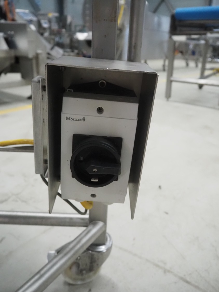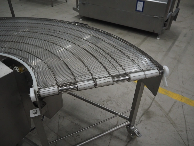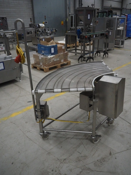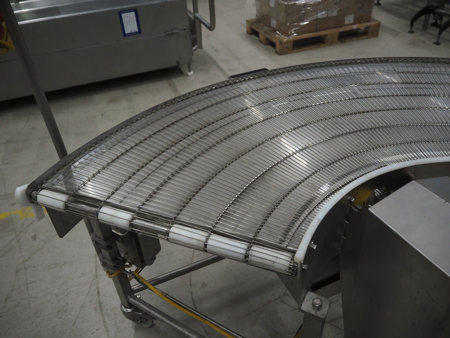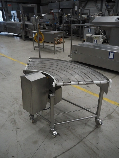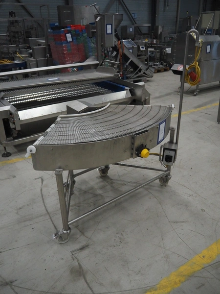 Stork mobile 45° curve conveyor, s/s mesh belt, belt width: 600 mm, total dimensions: 1550 mm x 1050 mm x 1600 mm.