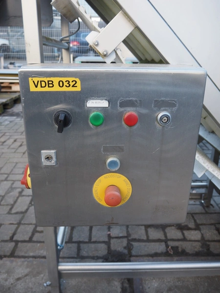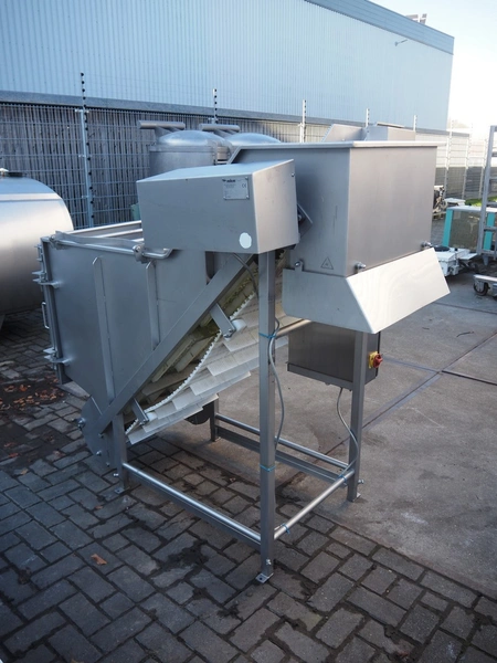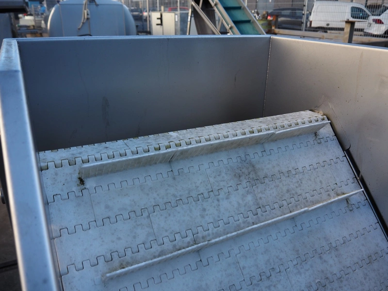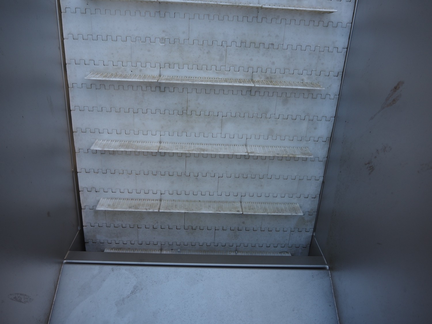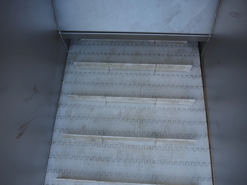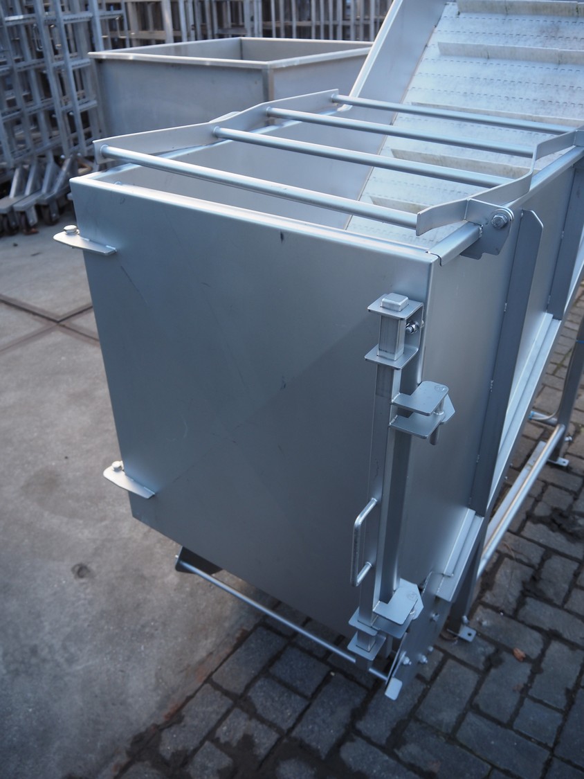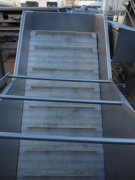 MKM elevating belt, year of construction: 2013, 400 V, plastic belt with dividers, belt width: 600 mm, divider height: 50 mm, distance between dividers: 210 mm, elevating height: 1450 mm, total dimensions: 1700 mm x 900 mm x 1600 mm.