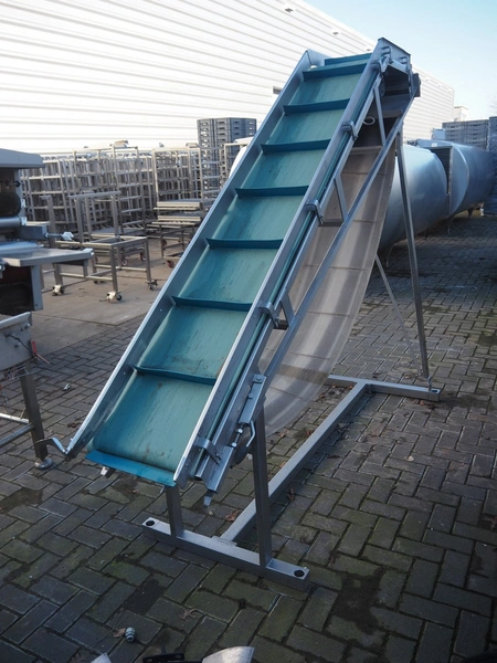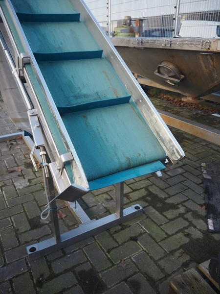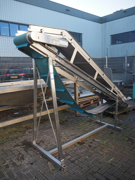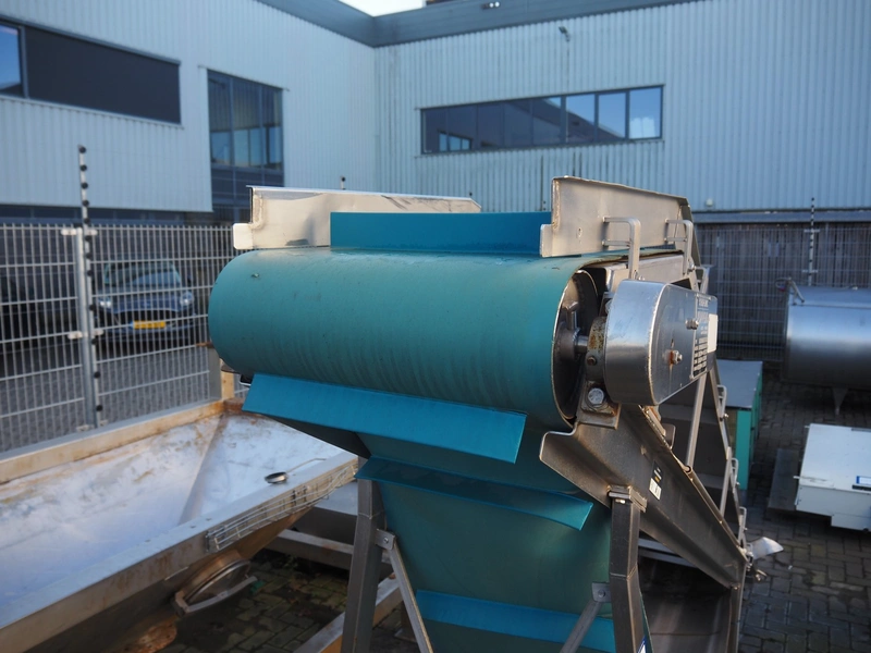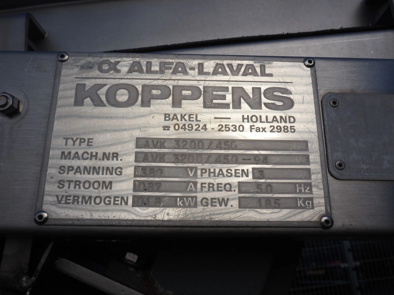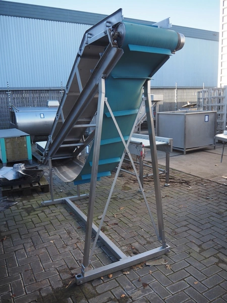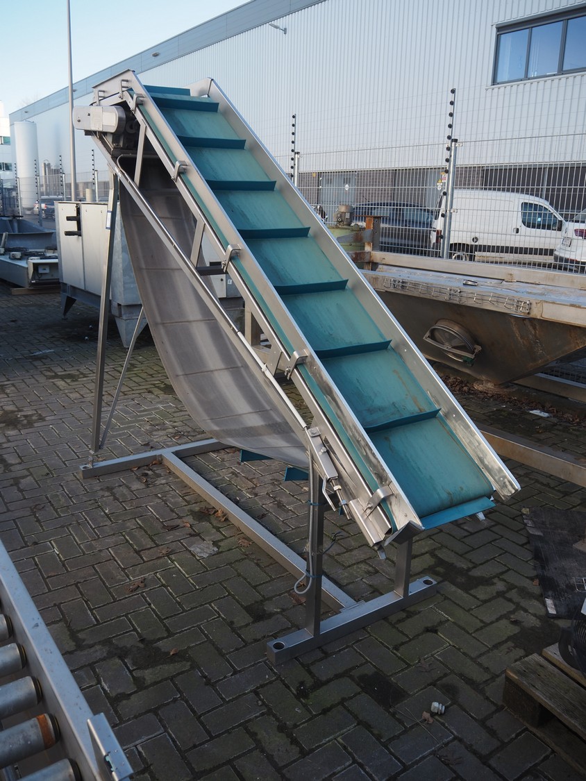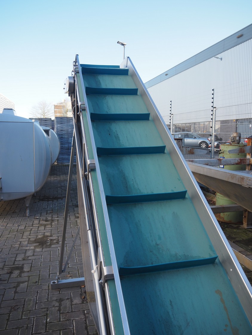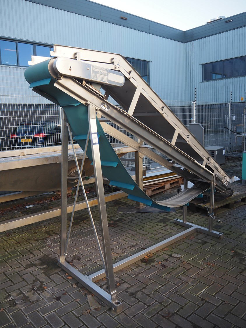 Koppens elevating belt with dividers, s/s frame, plastic belt, type: AVK 3200/450, machine number: AVK 3200/450-94, 380 V, 3 Ph, 50 Hz, 0.87 A, 0.18 kW, weight: 185 kg, belt width: 450 mm, distance between dividers: 330 mm, divider height: 50 mm, elevating height: 2100 mm, total dimensions: 3000 mm x 1100 mm x 2200 mm.