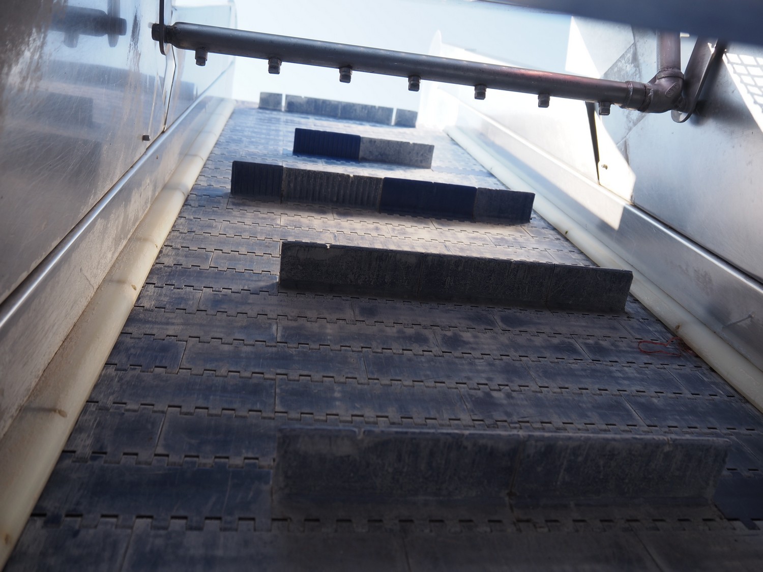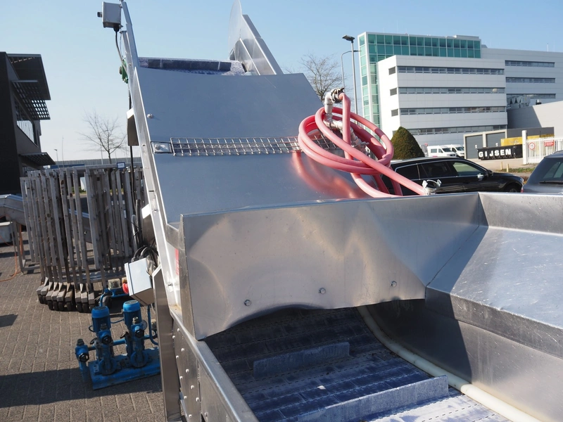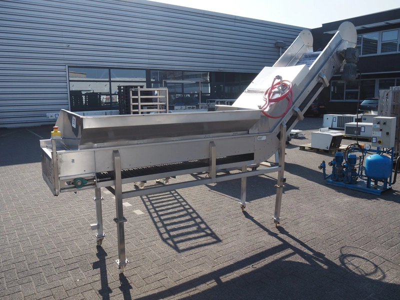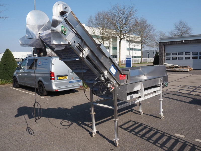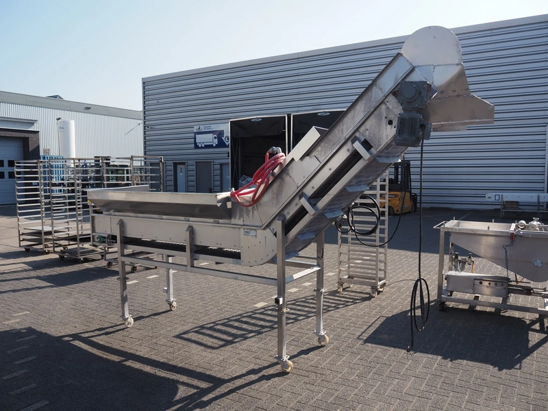 Kemco elevating belt with infeed hopper, plastic belt with dividers, belt width: 600 mm, distance between dividers: 305 mm, divider height: 50 mm, elevating height: 2200 mm, total dimensions: 4150 mm x 950 mm x 2560 mm.
