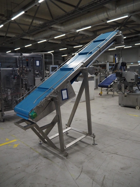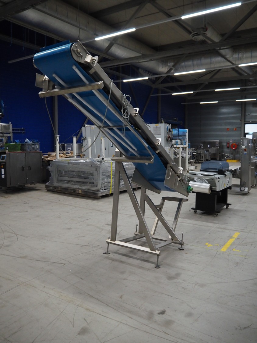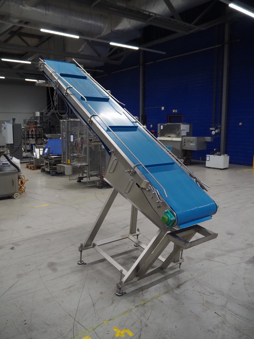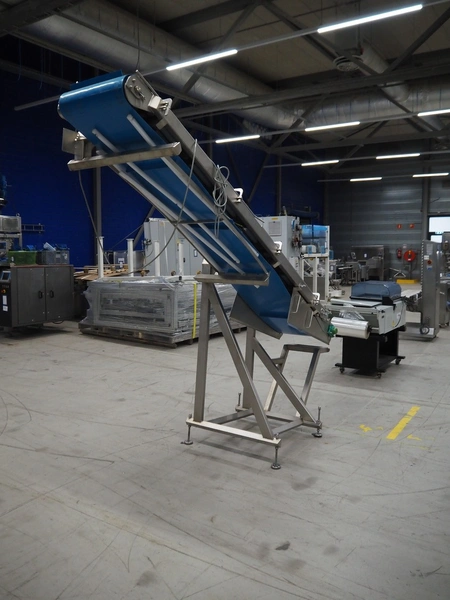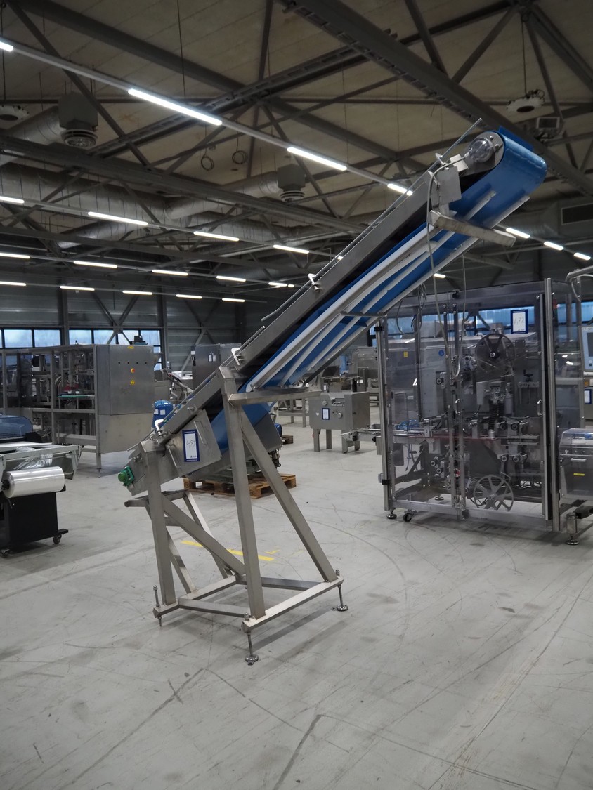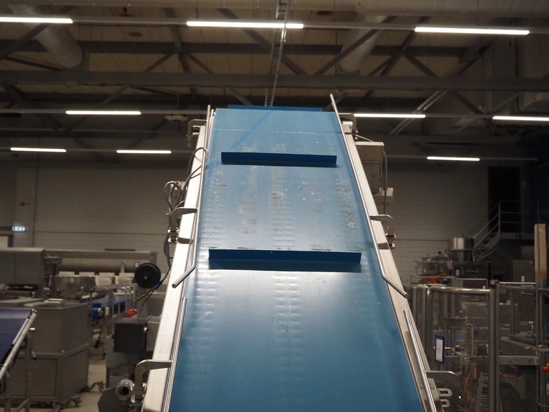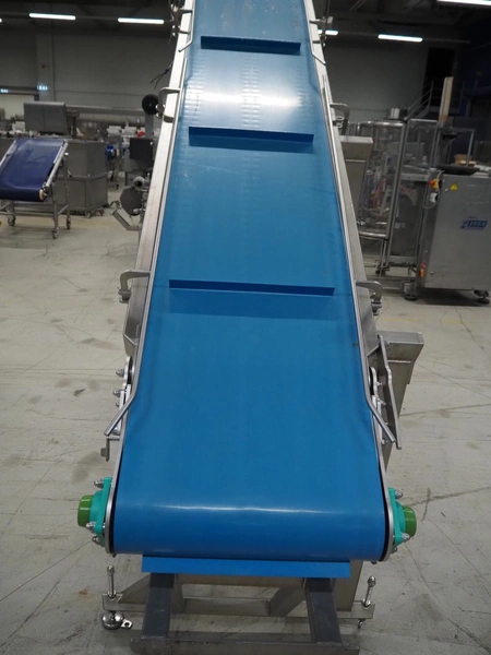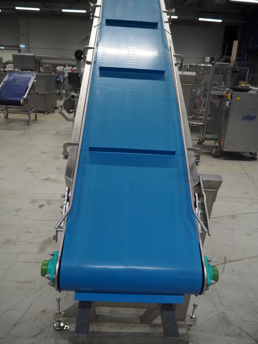 Elevating belt, plastic belt with dividers, belt width: 500 mm, divider height: 30 mm, distance between dividers: 656 mm, elevating height: 2550 mm, total dimensions: 2850 mm x 900 mm x 2600 mm.