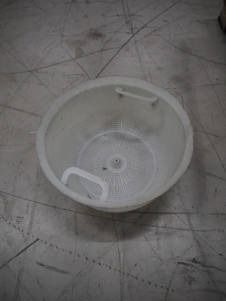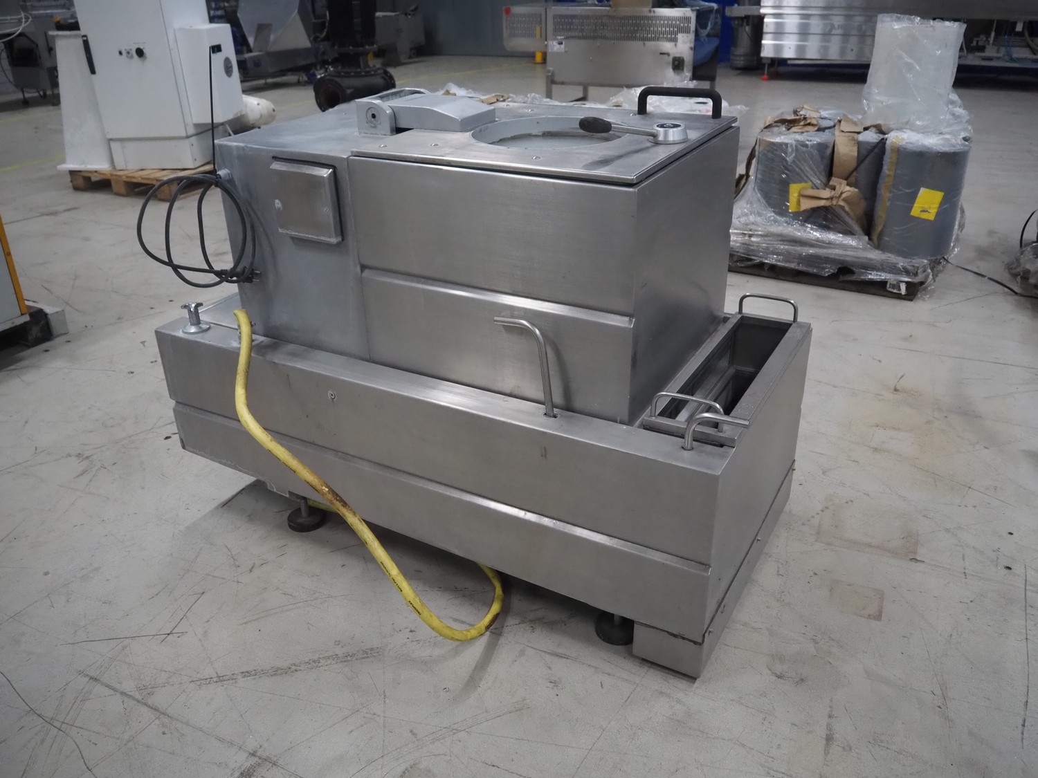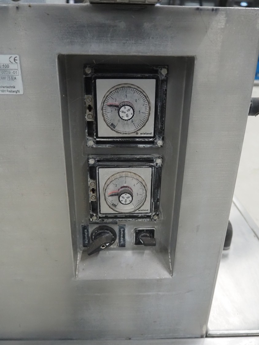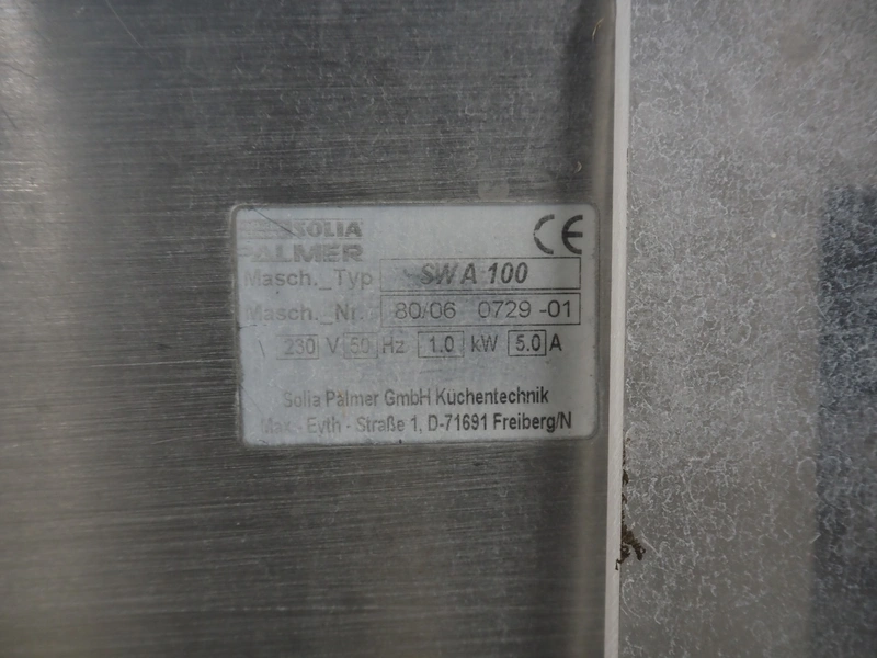 Solia Palmer salad spinner, type: SWA 100, machine number: 80/06 0729-01, 230 V, 50 Hz, 5.0 A, 1.0 kW, plastic basket dimensions: Ø 470 mm x 250 mm, total dimensions: 1500 mm x 750 mm x 1100 mm.