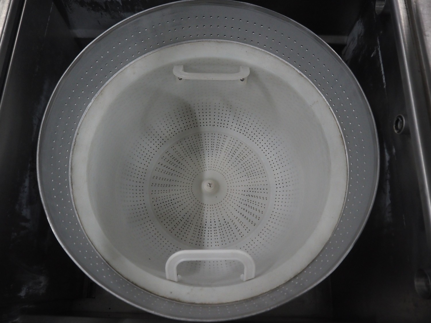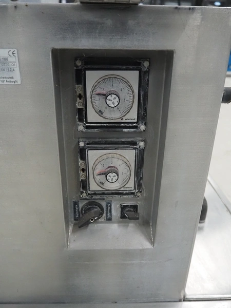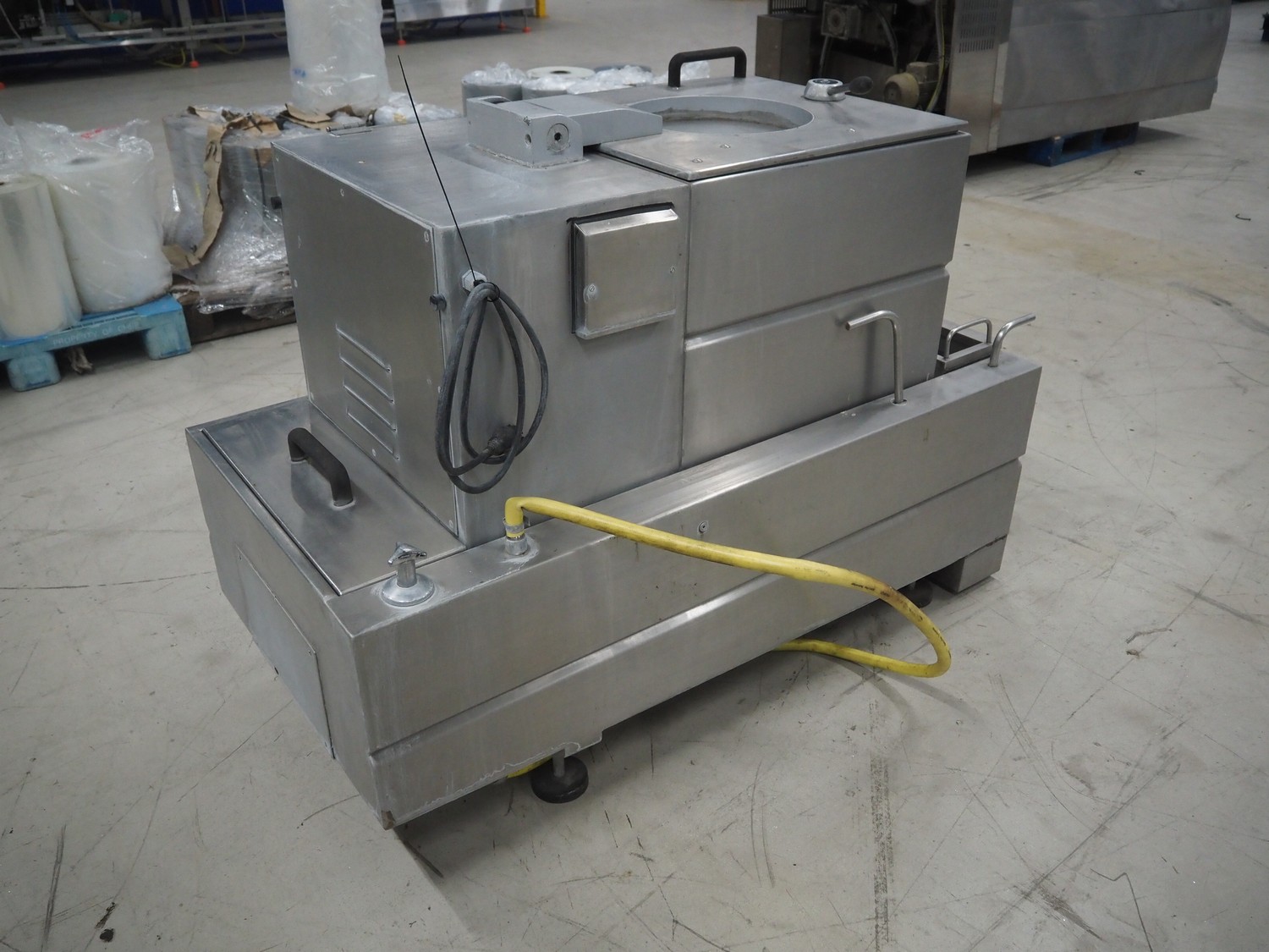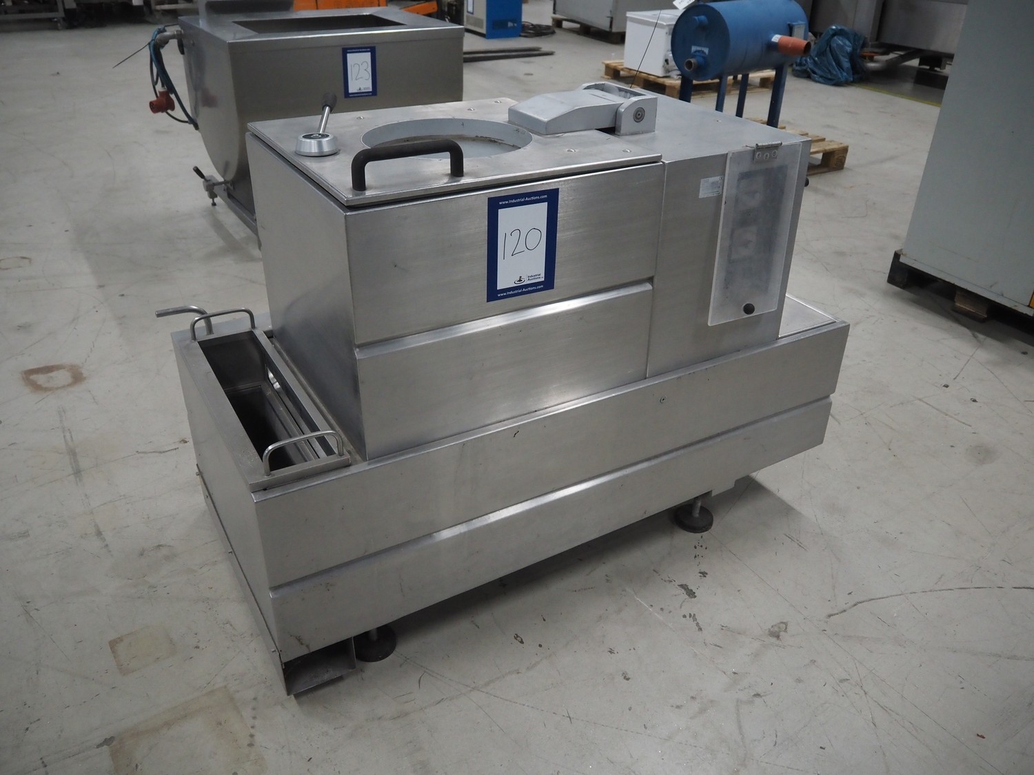 Solia Palmer salad spinner, type: SWA 100, machine number: 80/06 0729-01, 230 V, 50 Hz, 5.0 A, 1.0 kW, plastic basket dimensions: Ø 470 mm x 250 mm, total dimensions: 1500 mm x 750 mm x 1100 mm.