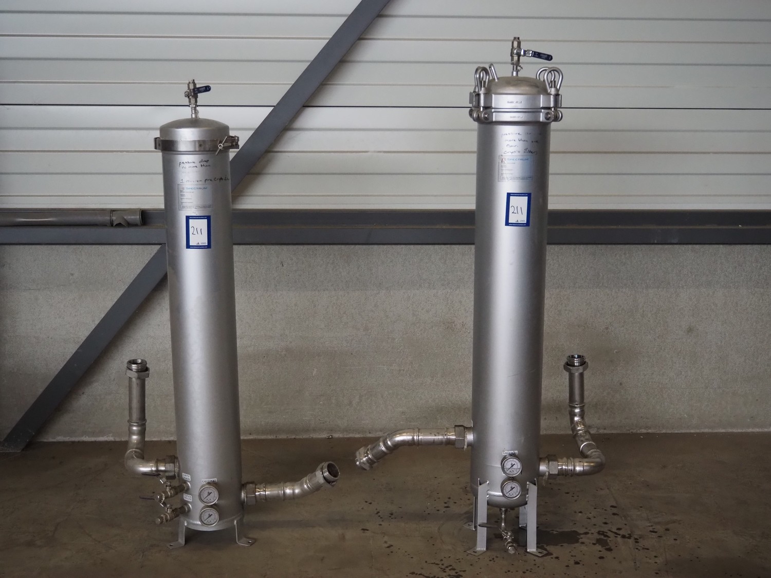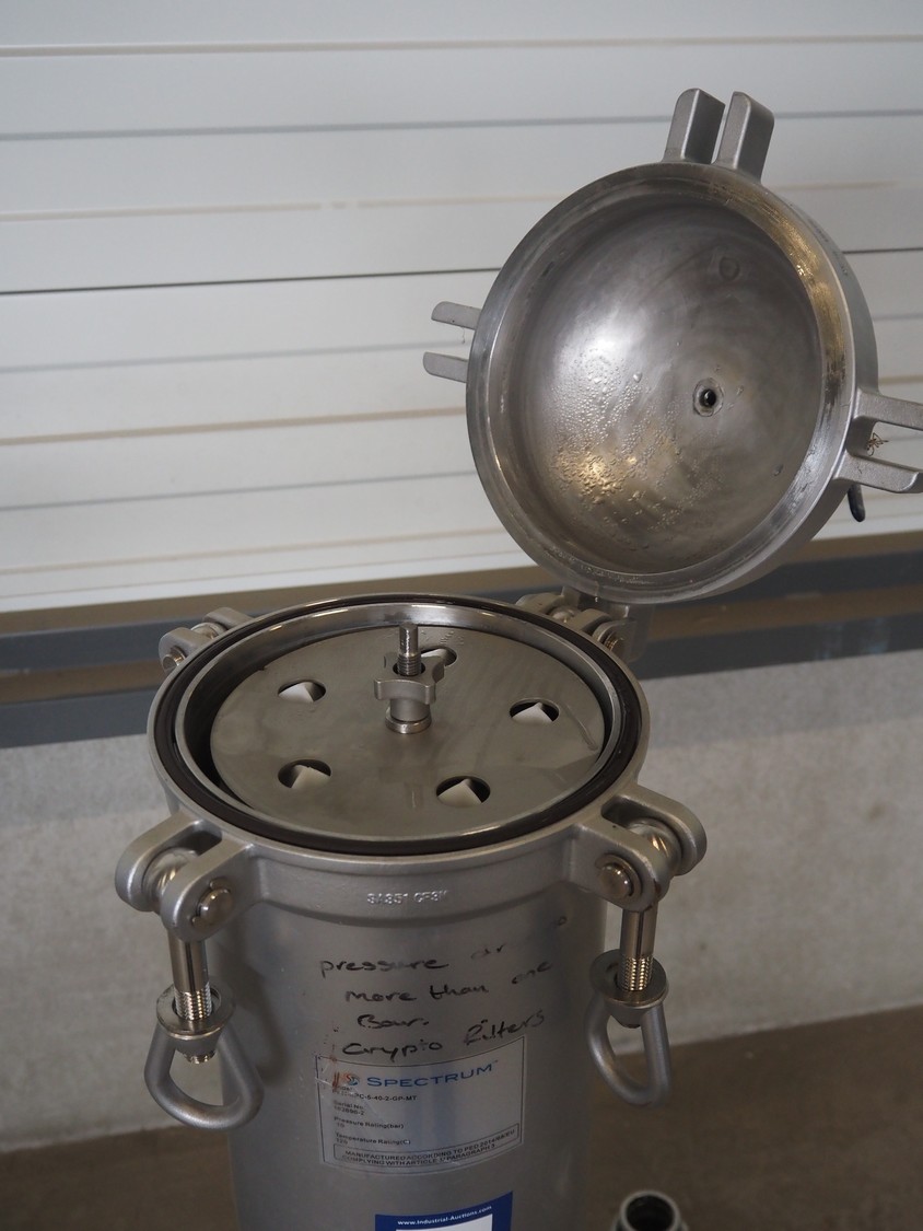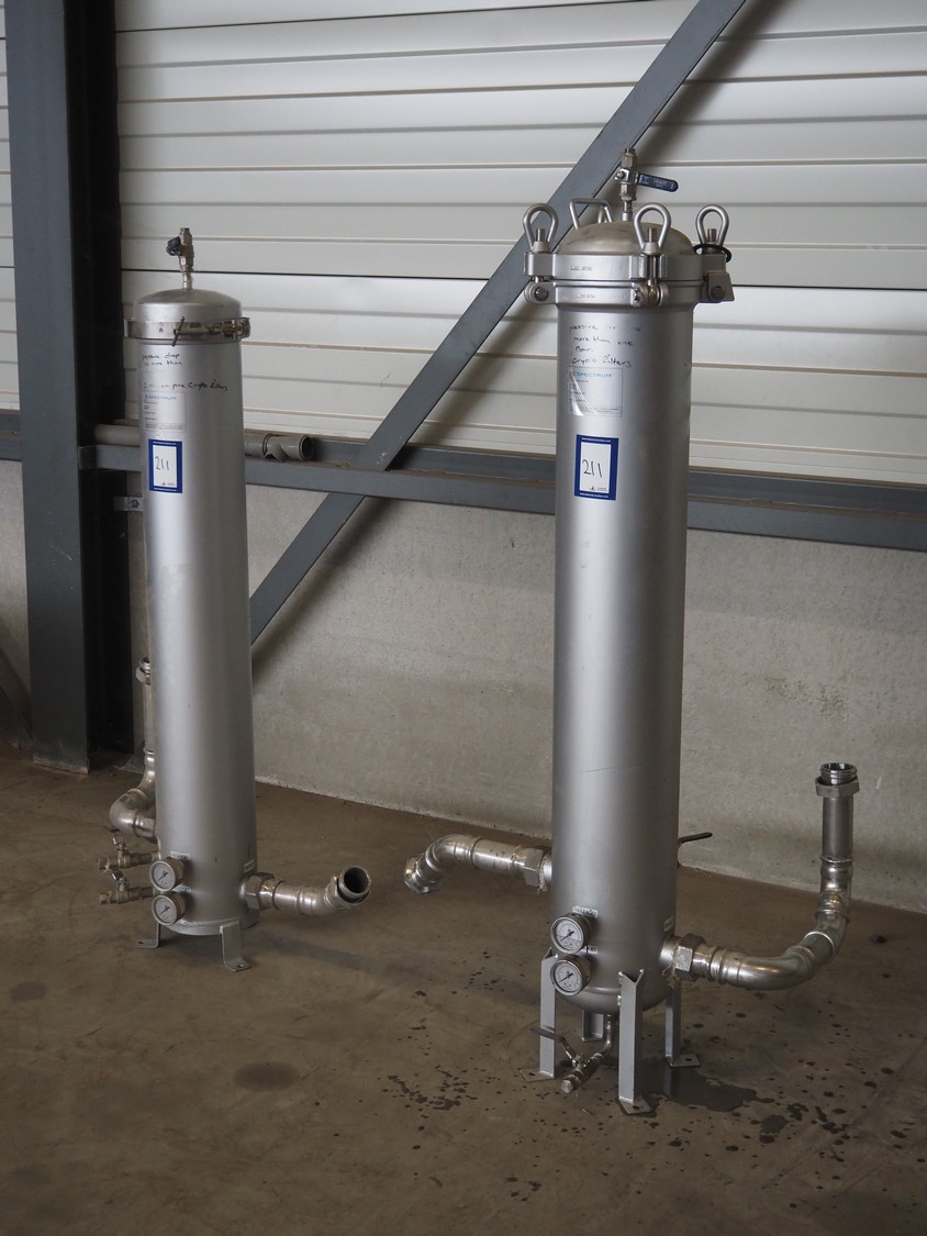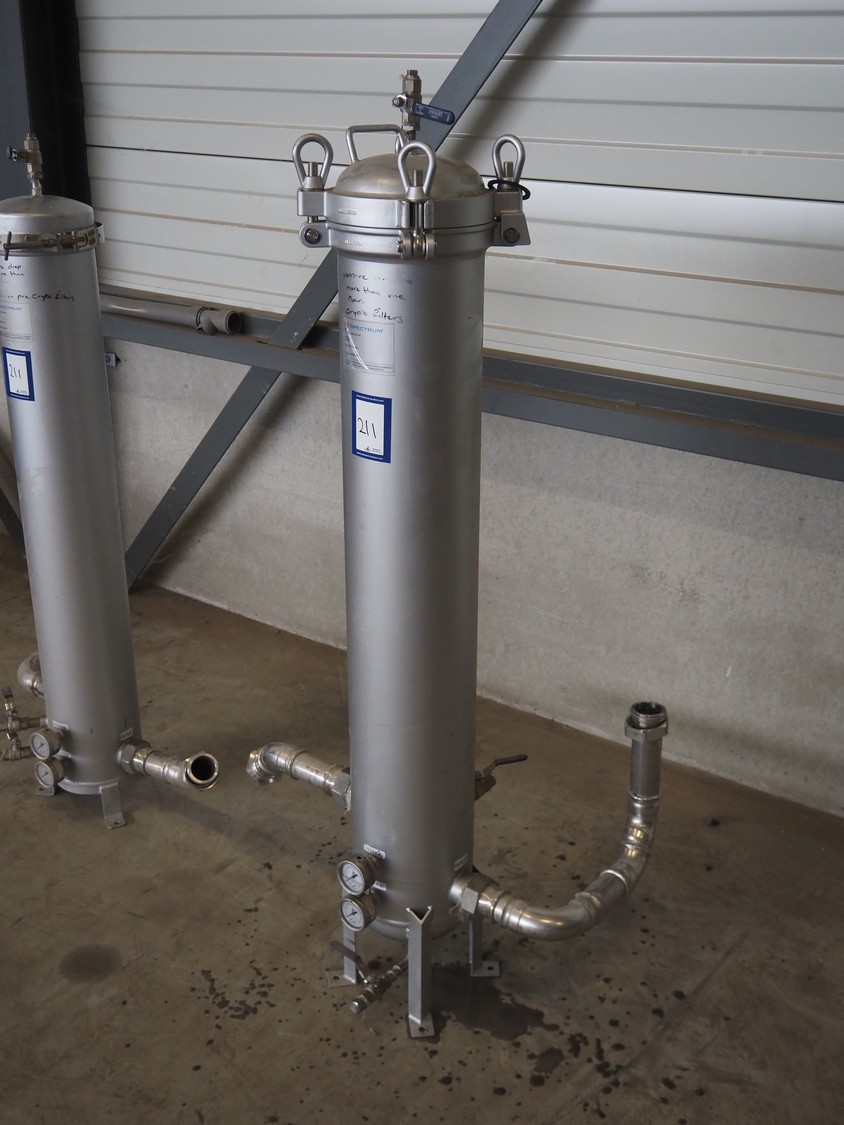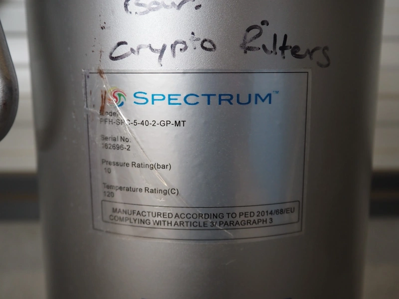 2 Spectrum water filters, model: SFH-SPC-5-40-2-GP-MT, serial number: 163528-5, pressure rating: 10 bar, temperature rating: 120° Celsius, dimensions: (2x) 1600 mm x 800 mm x 500 mm.