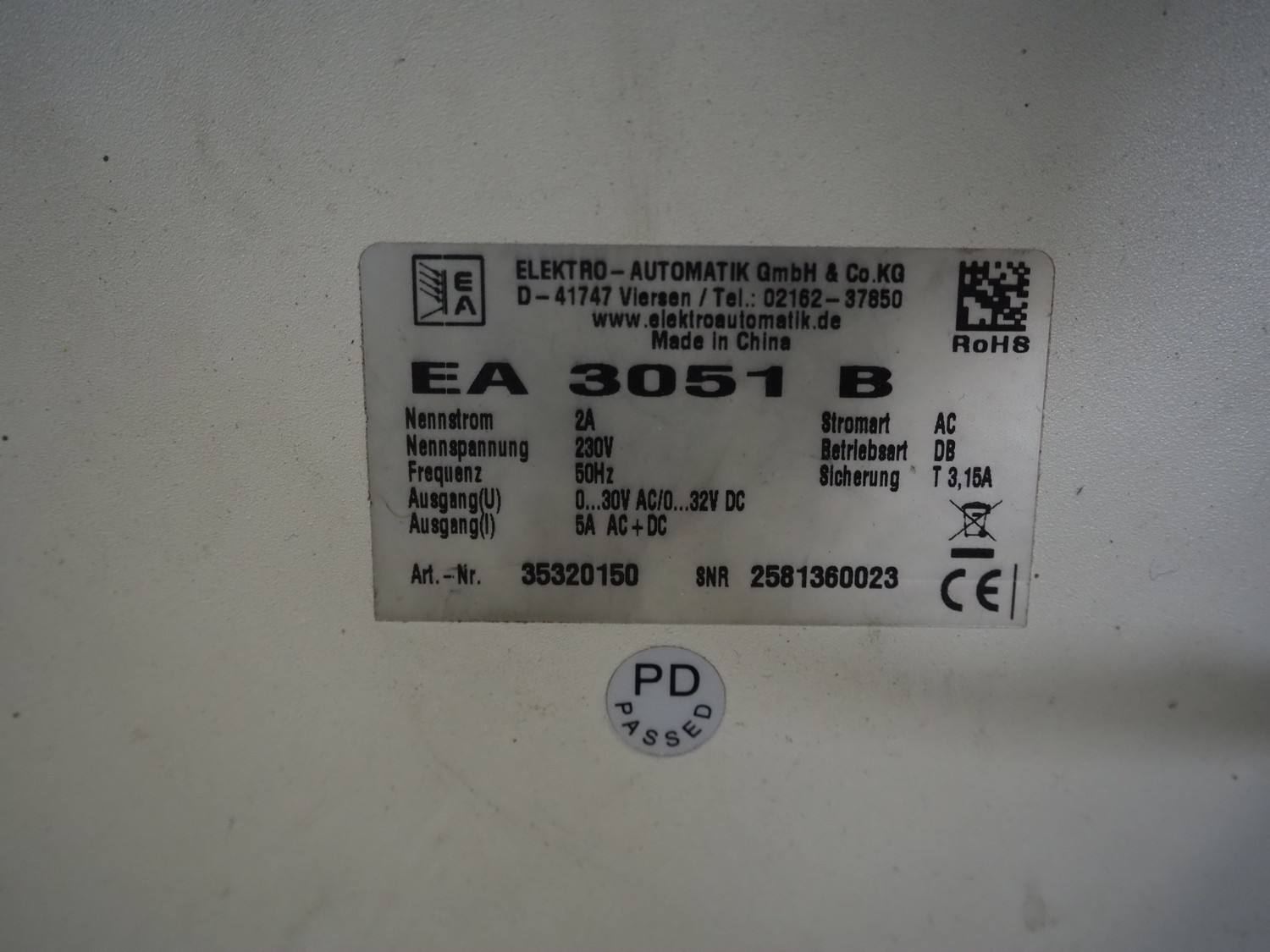 Elektro-Automatik GmbH & Co. KG power supply, model: EA 3051 B, 230 V, 50 Hz, dimensions: 260 mm x 285 mm x 150 mm.
