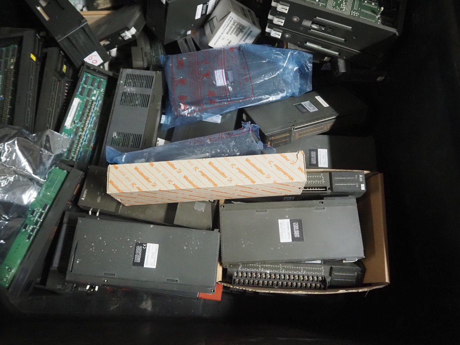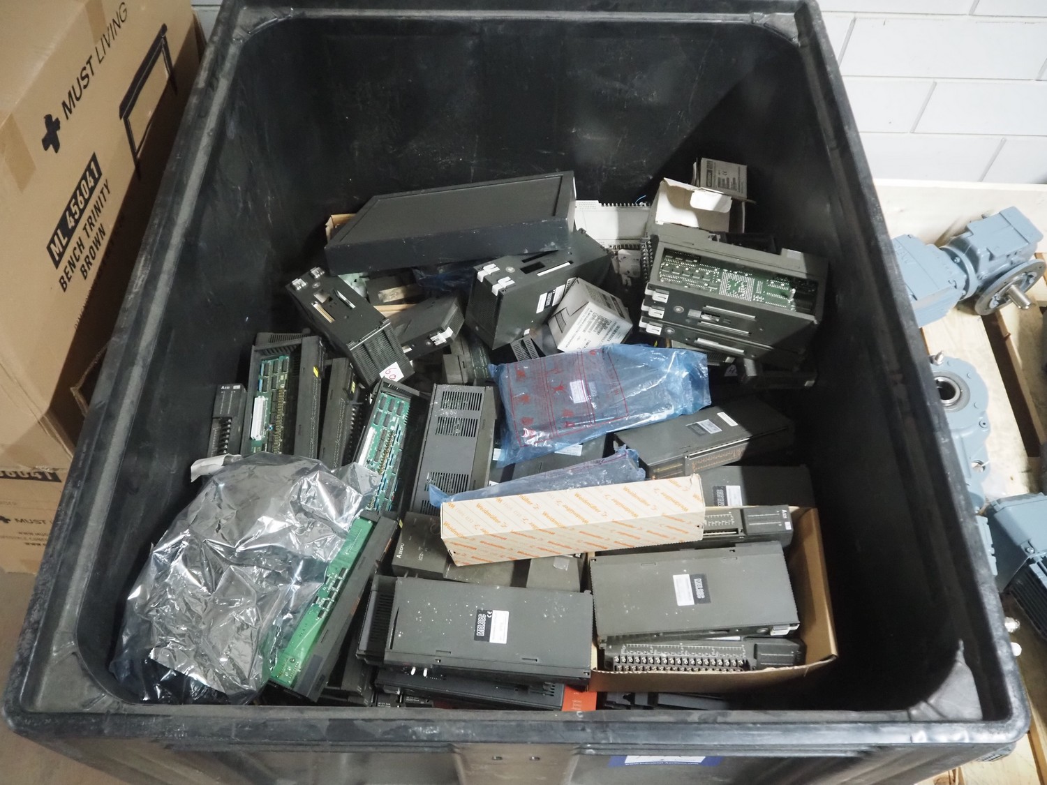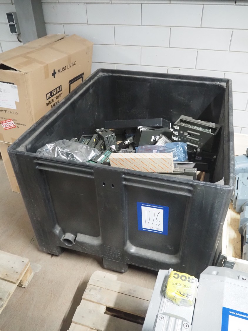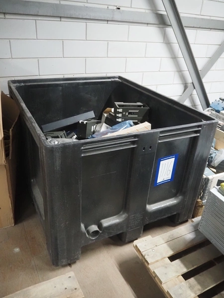 Plastic pallet box with large amount of various frequency converters, dimensions: 1200 mm x 800 mm x 800 mm.
