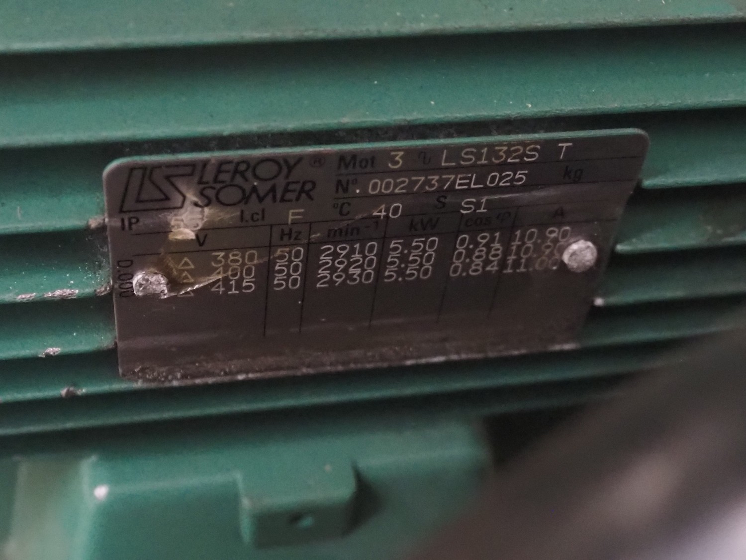 Leroy Somer motor, number: 002737EL025, 5.5 kW, dimensions: 420 mm x 300 mm x 300 mm.
