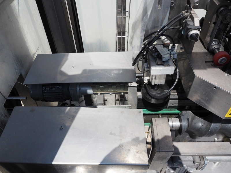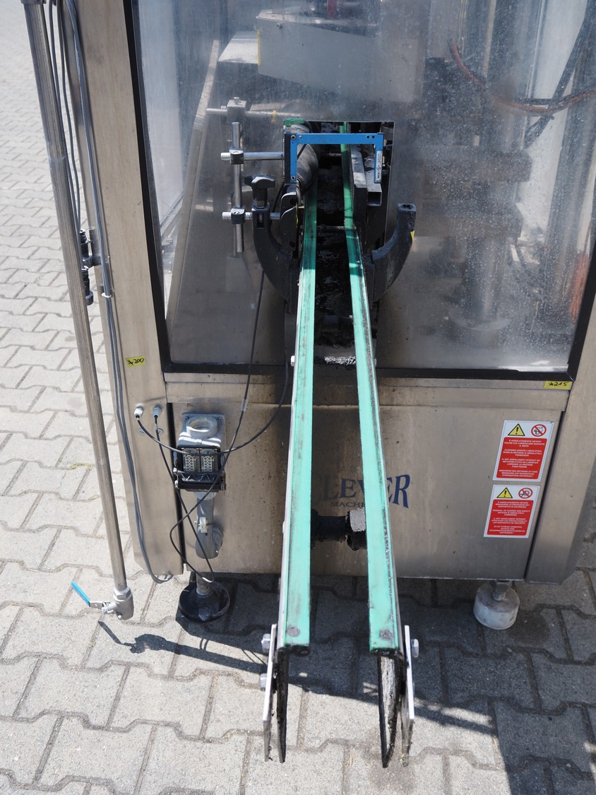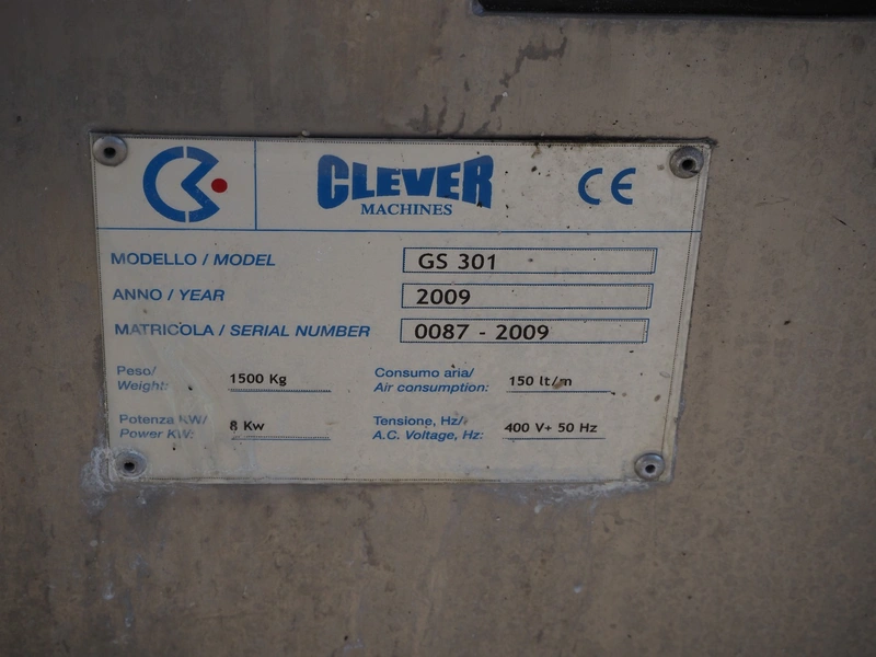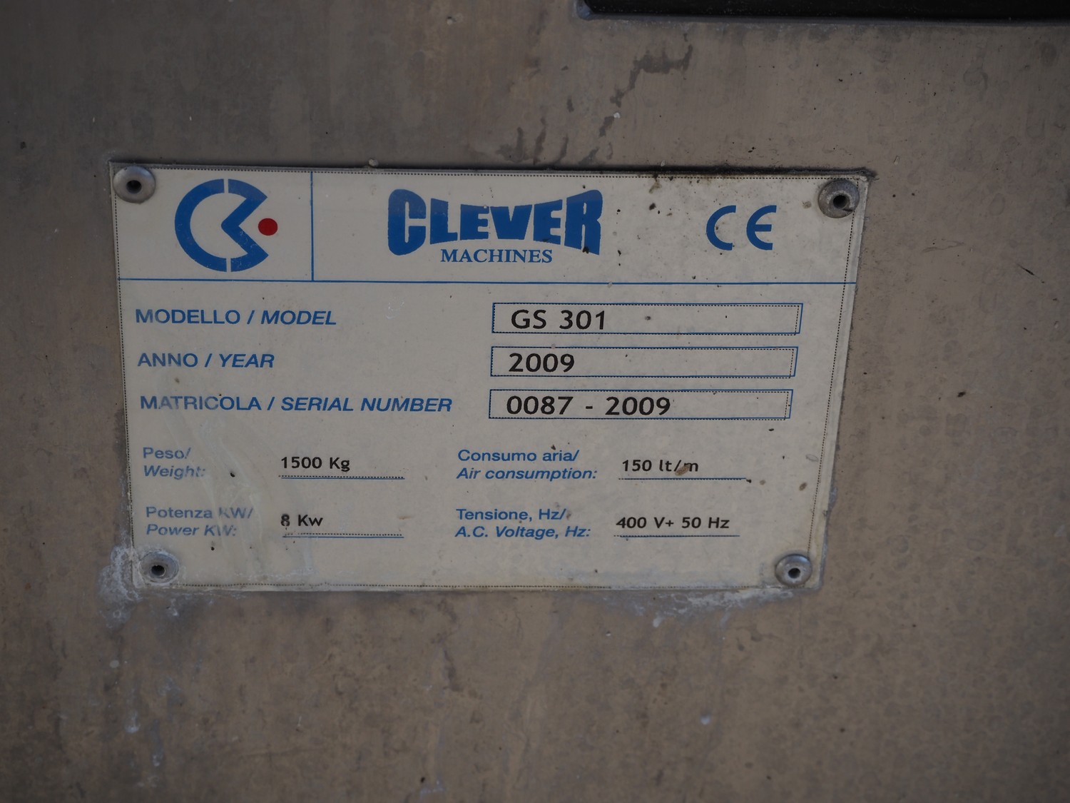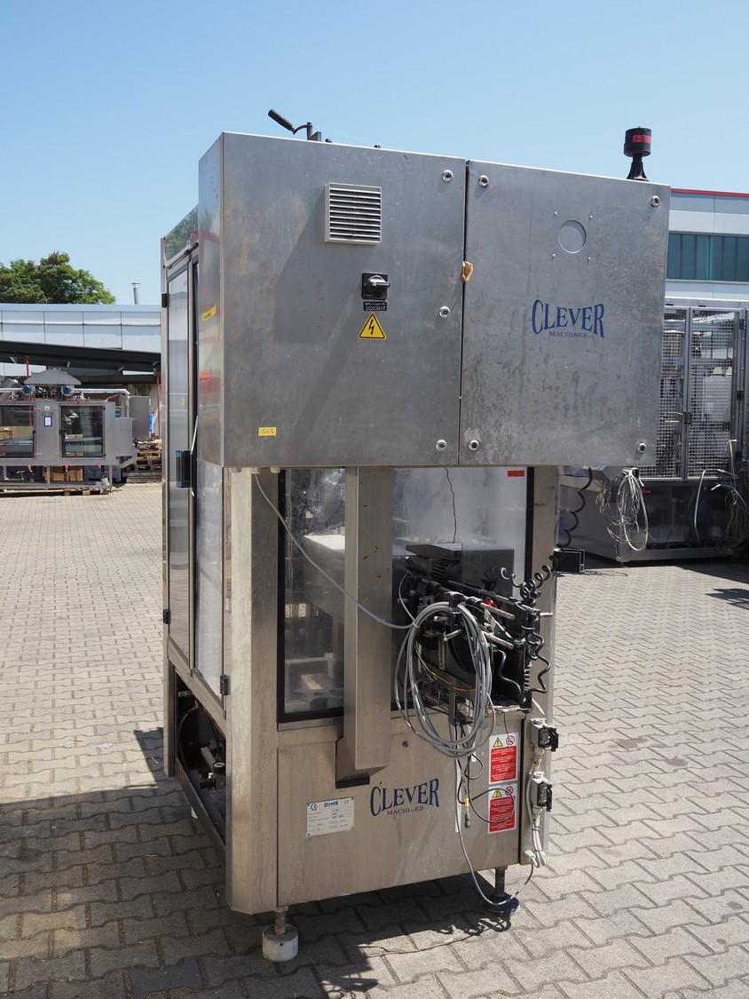 Clever Machines sleever for jars, type: GS 301, serial number: 0087 – 2009, year of construction: 2009, film width: 110 mm, belt width: 85 mm, total dimensions: 2400 mm x 1600 mm x 2450 mm.