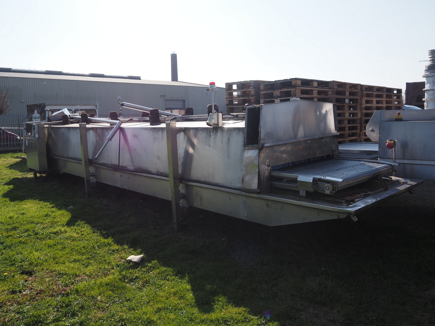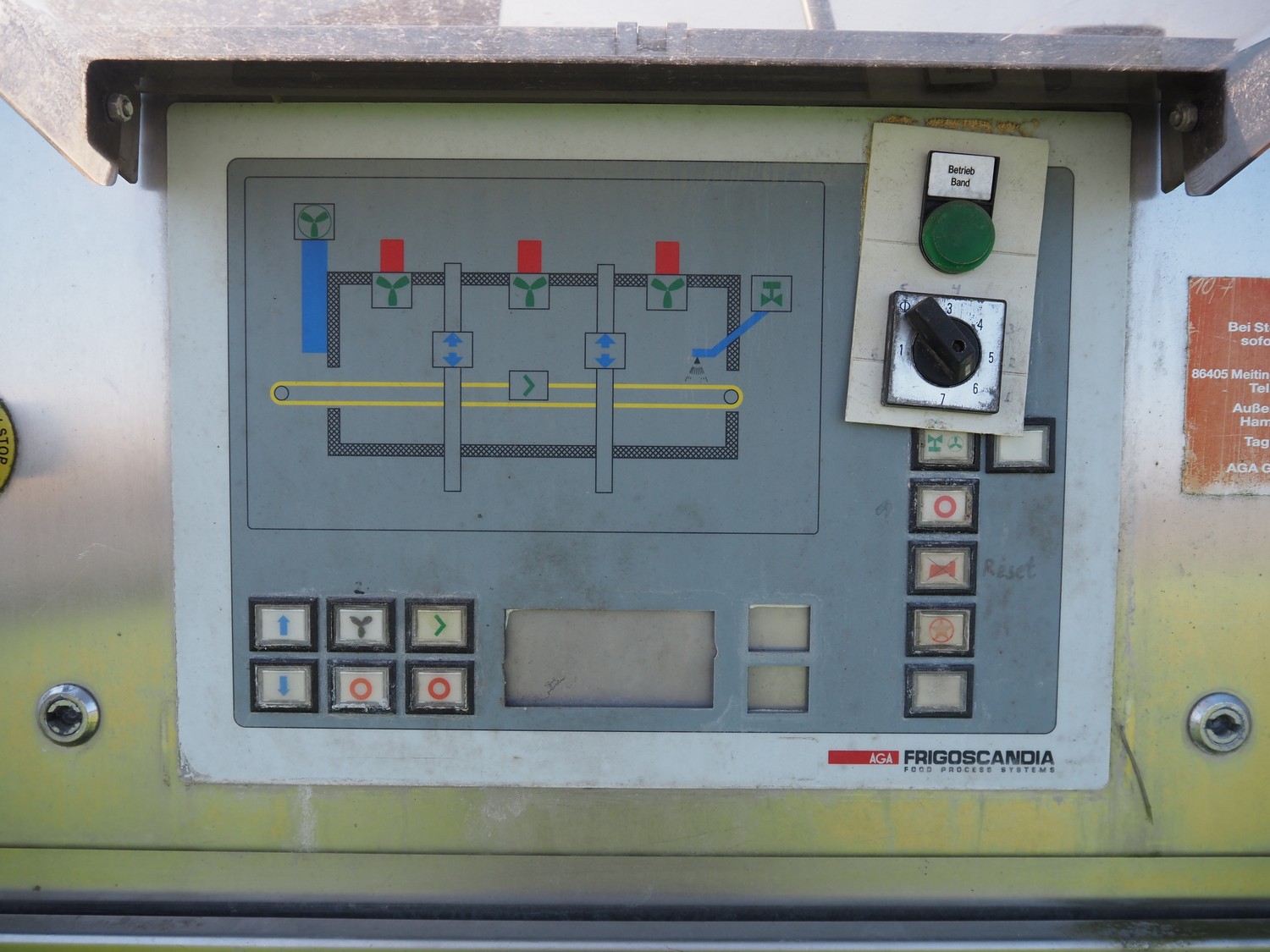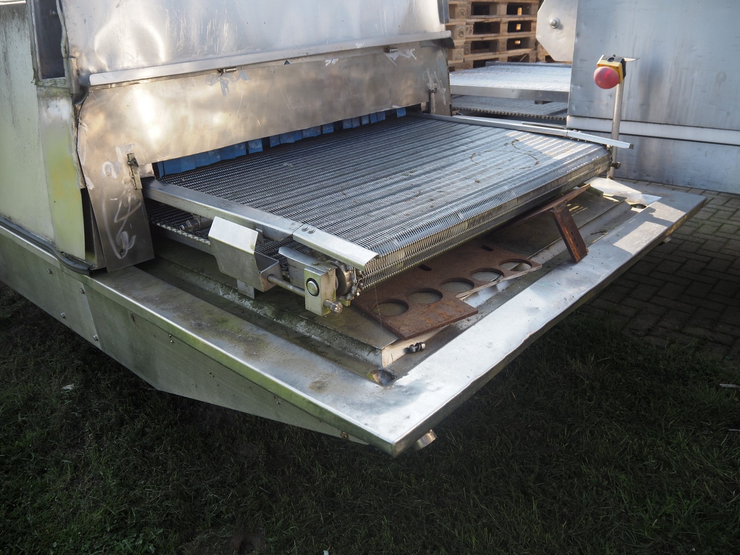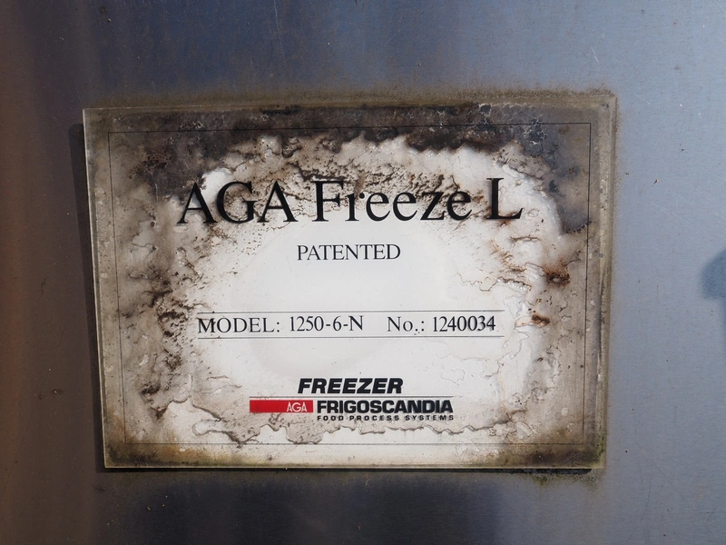 Frigoscandia freezing tunnel, model: AGA Freeze L 1250-6-N, number: 1240034, s/s mesh belt, belt width: 1250 mm, total dimensions: 11000 mm x 2500 mm x 2050 mm