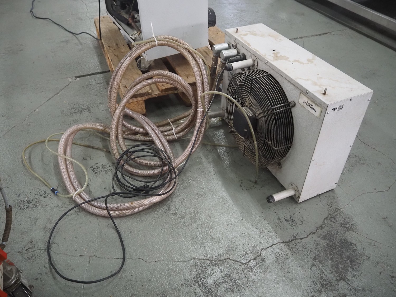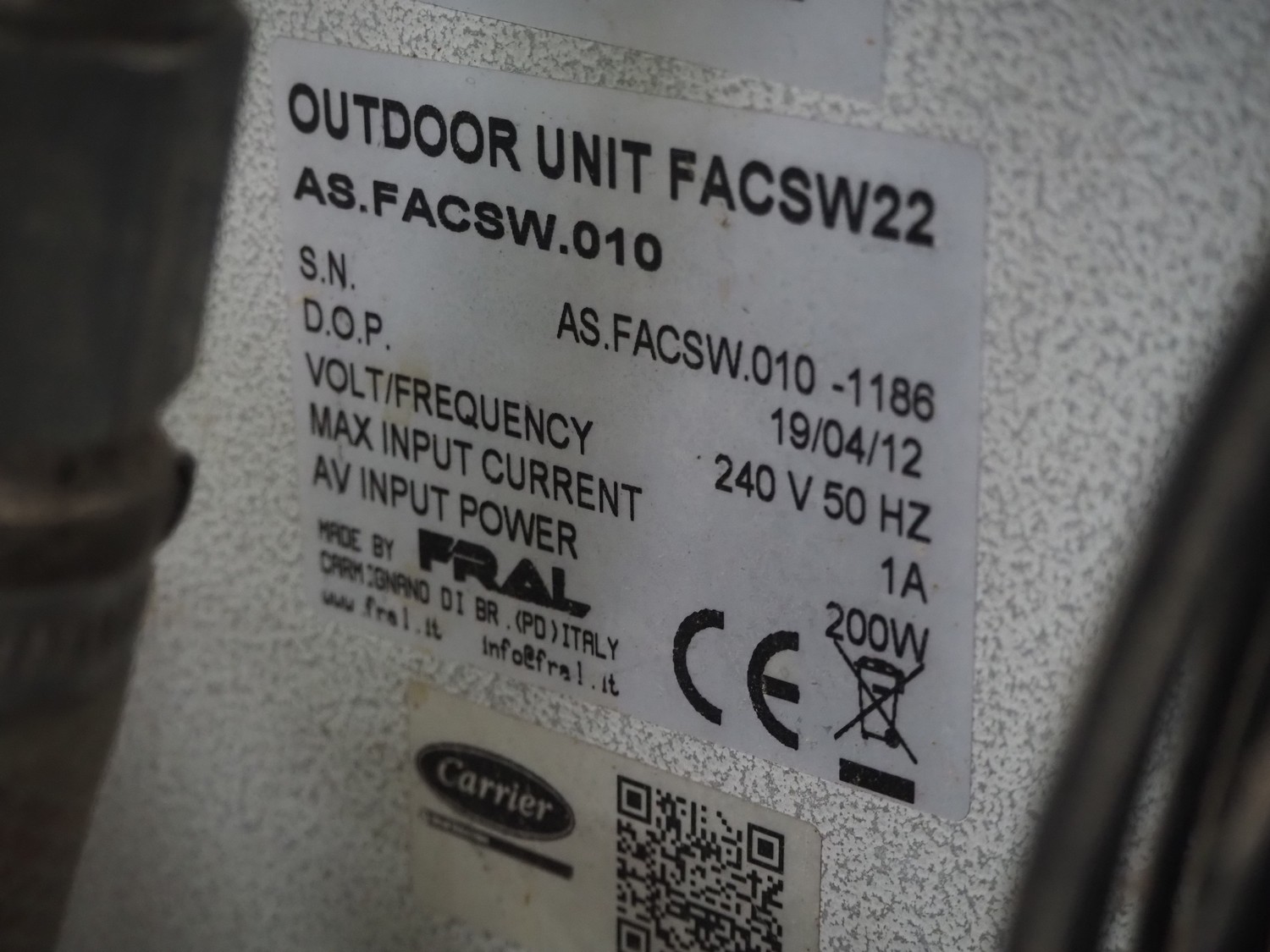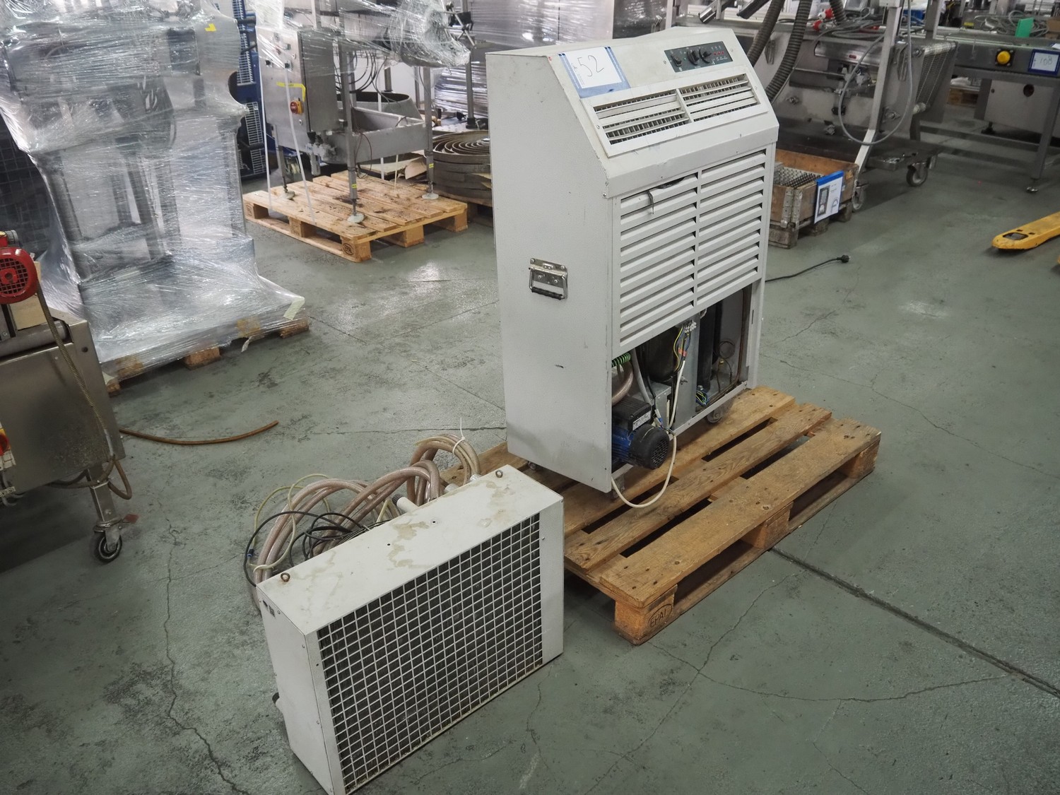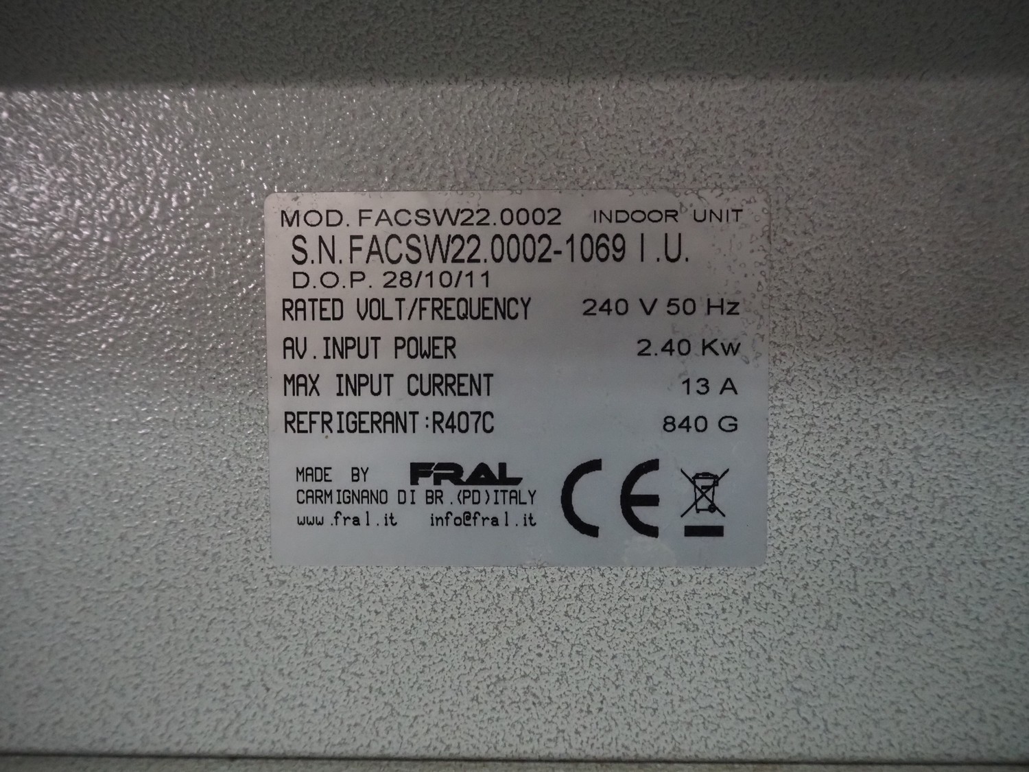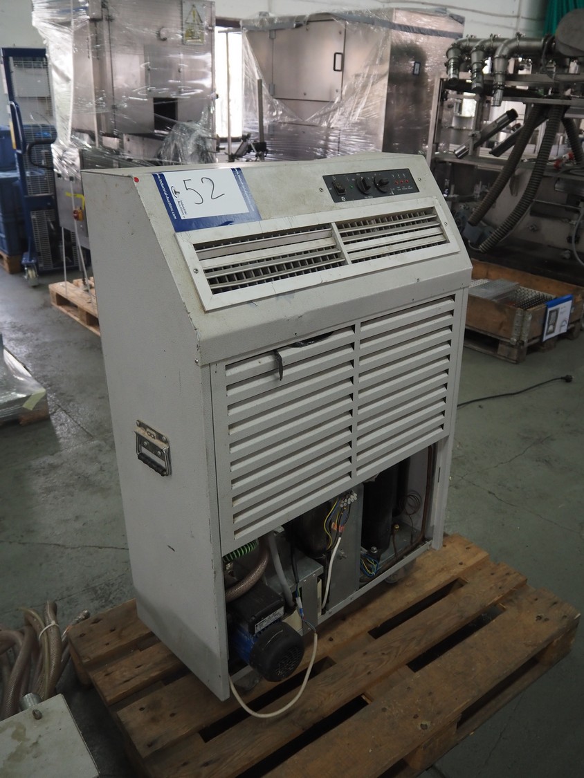 Fral mobile chiller, indoor unit: model: FACSW22.0002, serial number: FACSW22.0002-1069 I.U., year of construction: 28/10/11, 240 V, 50 Hz, 13 A, 2.4 kW, refrigerant: R407C / 840 gram, outdoor unit: model: FACSW22, serial number: AS.FACSW010,-1186, year of construction: 19/04/12, 240 V, 50 Hz, 1 A, 200 W, dimensions: 1200 mm x 800 mm x 1320 mm.
