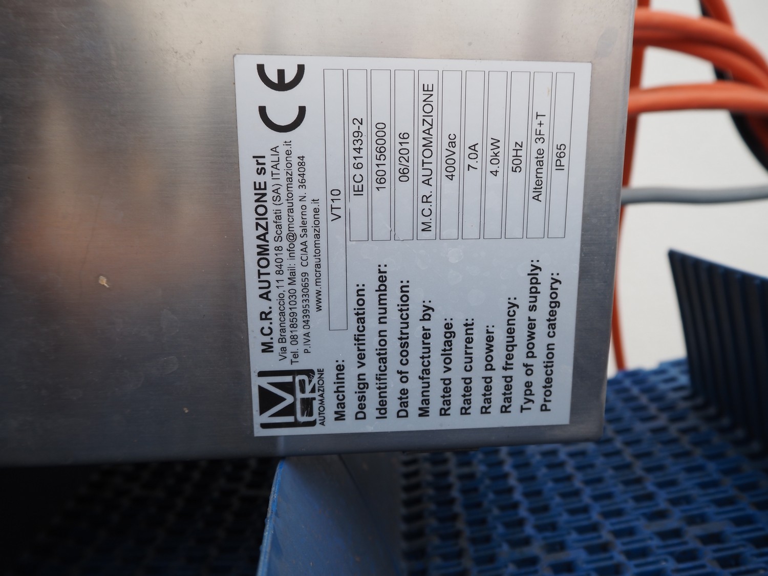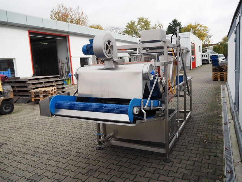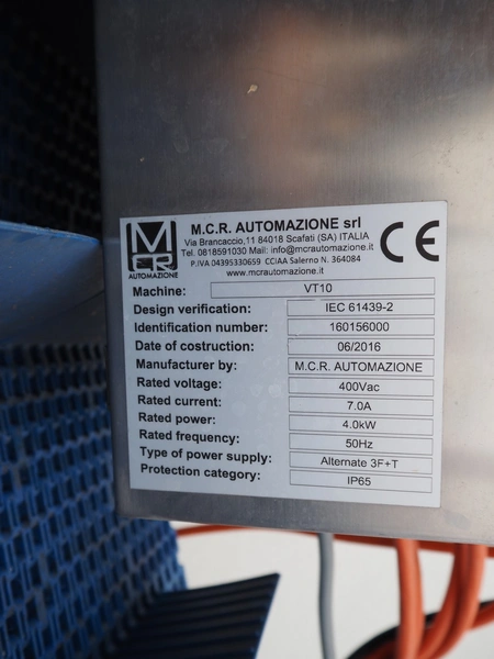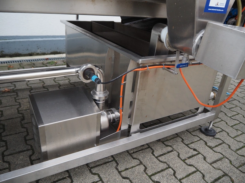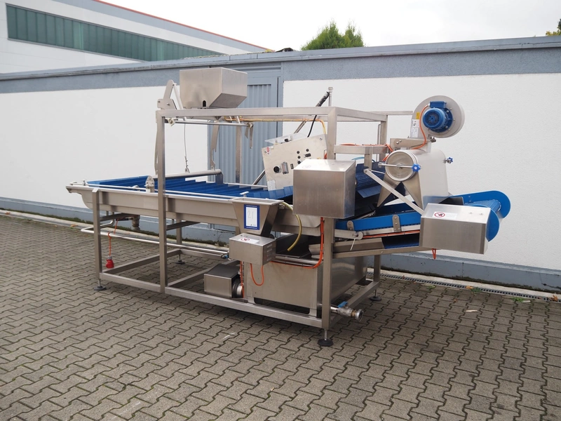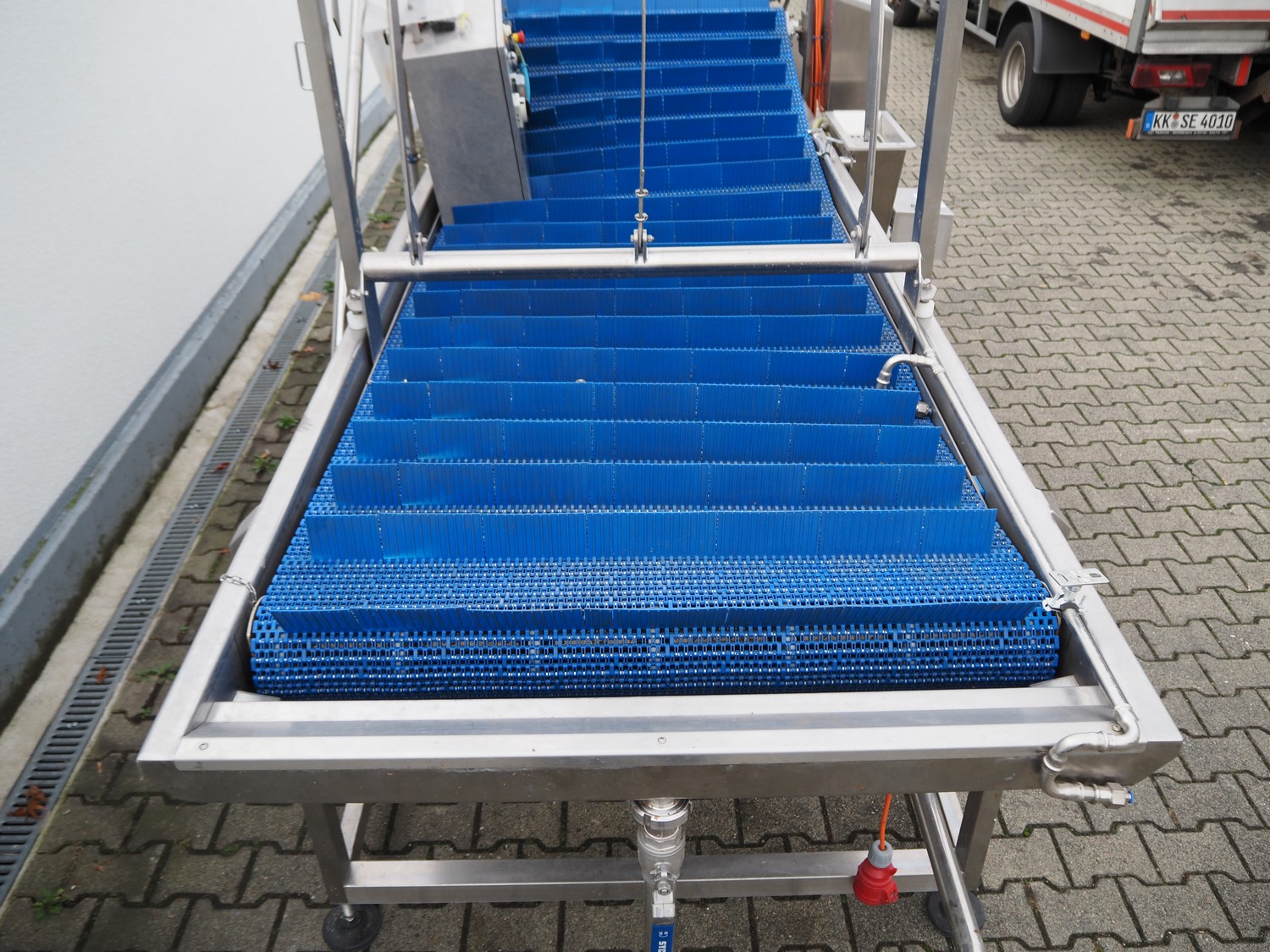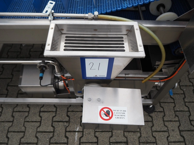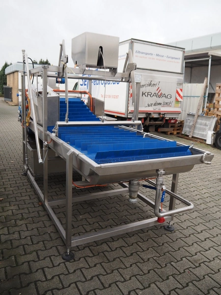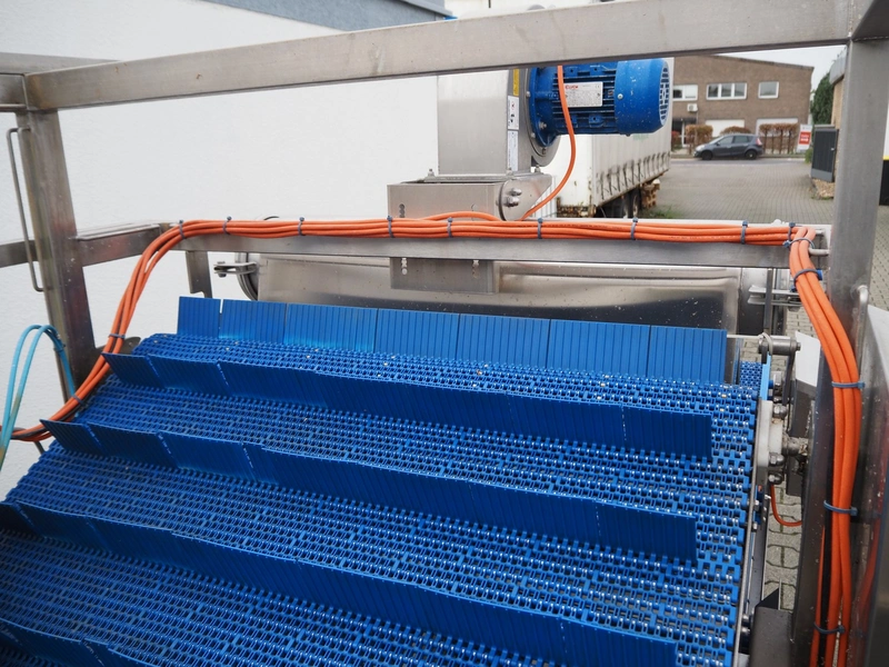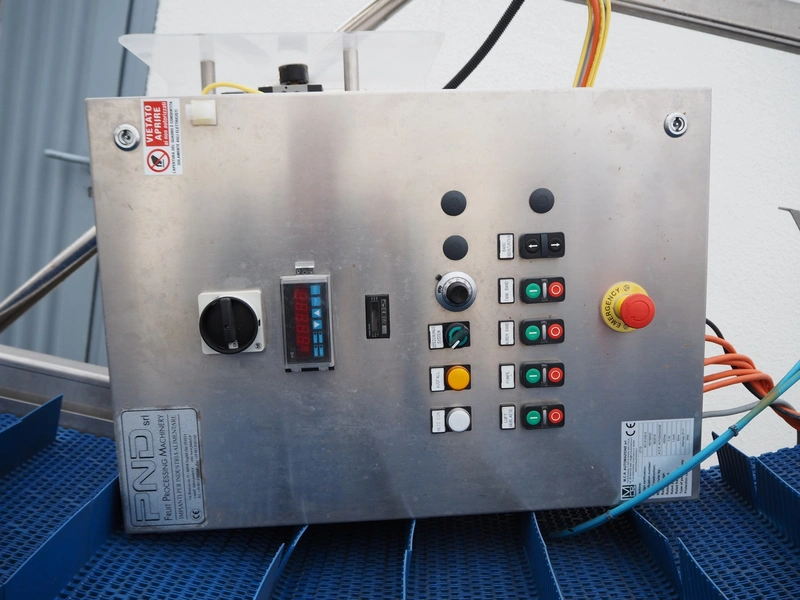 PND s.r.l. dipping belt for fruits and vegetables, type: universal dipping system, year of construction: 2017, plastic mesh belt with dividers, belt width: 1100 mm, divider height: 80 mm, distance between dividers: 150 mm, elevating height: 1400 mm, total dimensions: 4400 mm x 1700 mm x 2300 mm.