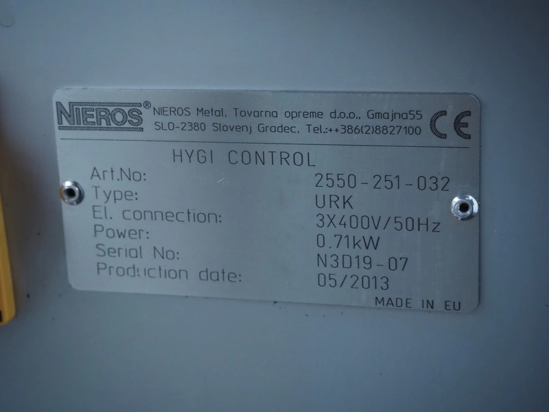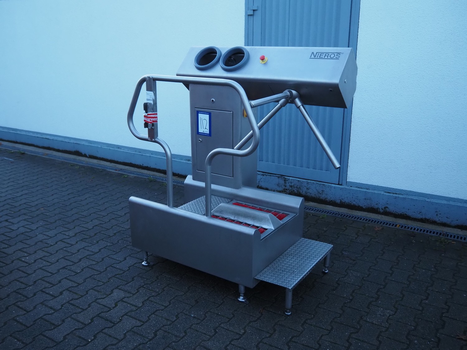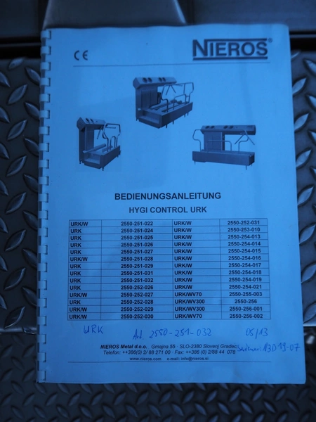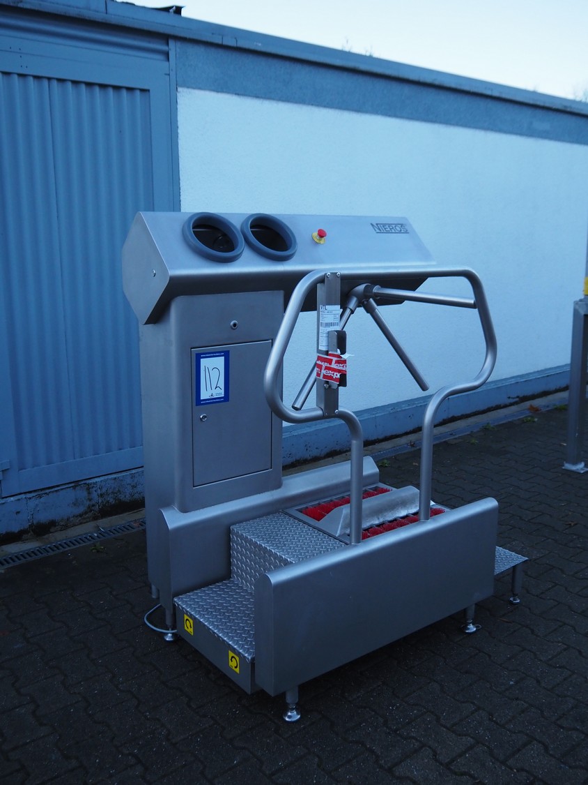 Nieros hygiene station with sole cleaner, tourniquet and hand disinfection, type: URK, serial number: N3D19-07, year of construction: 05/2013, brush length: (2x) 450 mm, total dimensions: 1350 mm x 950 mm x 1600 mm.