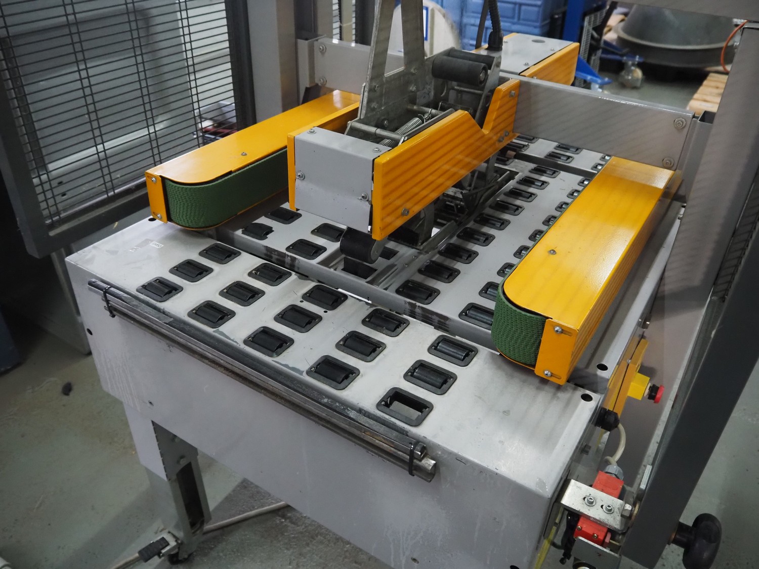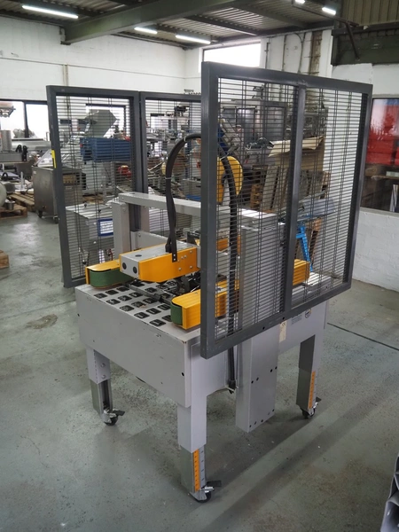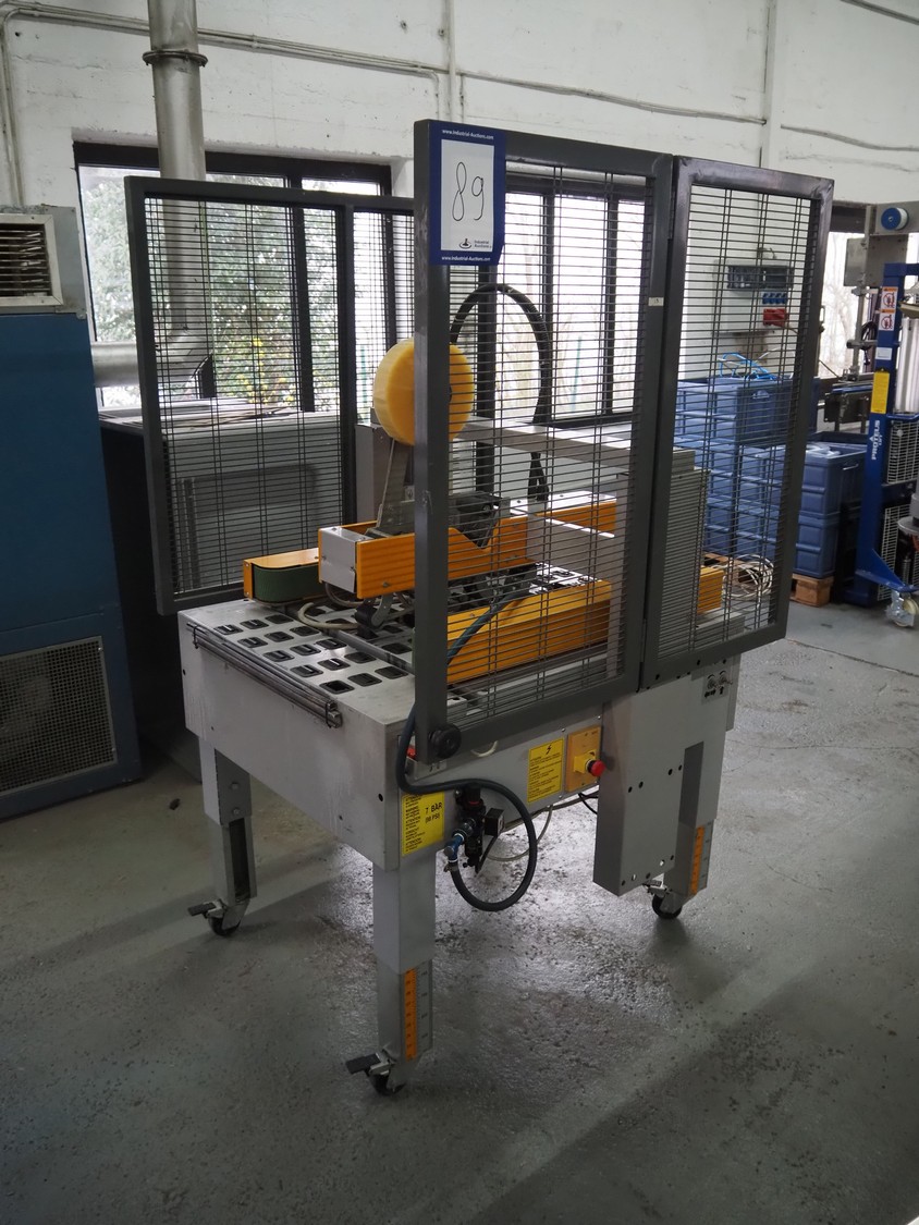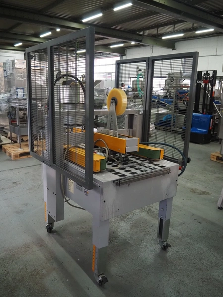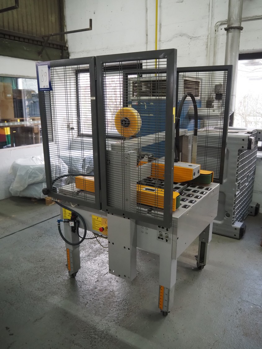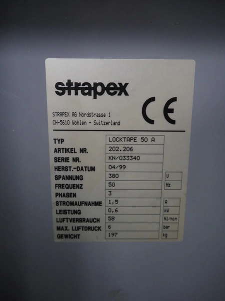 Strapex mobile box closing machine, type: Locktape 50 A, serial number: KN/033340, year of construction: 04/99, 380 V, 3 Ph, 50 Hz, 1.5 A, 0.6 kW, weight: 197 kg, clearance: 500 mm x 100 mm, total dimensions: 1100 mm x 1120 mm x 1820 mm.