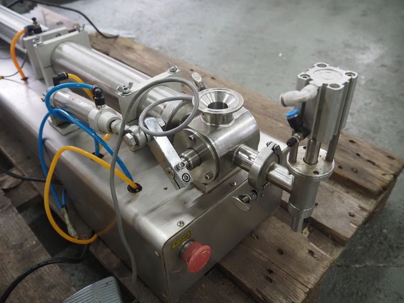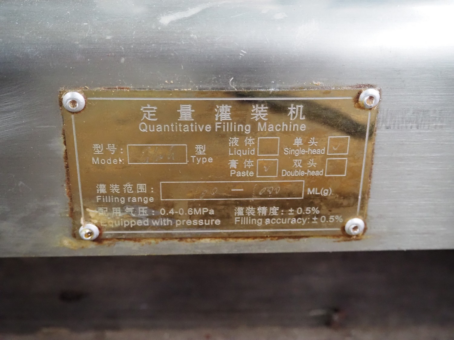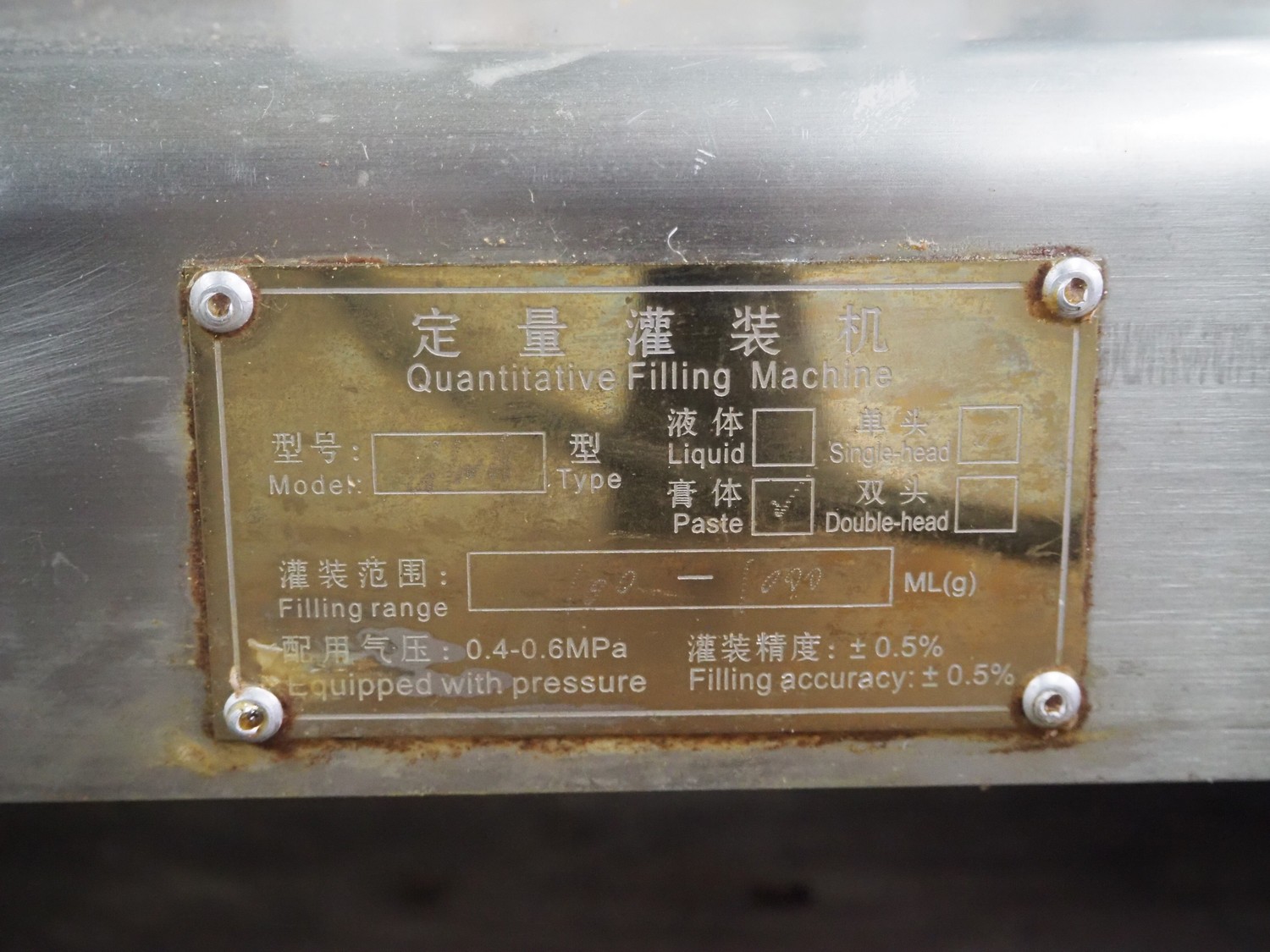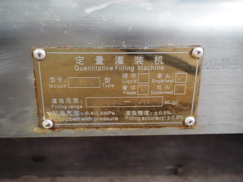 S/s filling machine, filling range: 100-1000 ml/g, dimensions: 1100 mm x 400 mm x 500 mm. Incomplete.