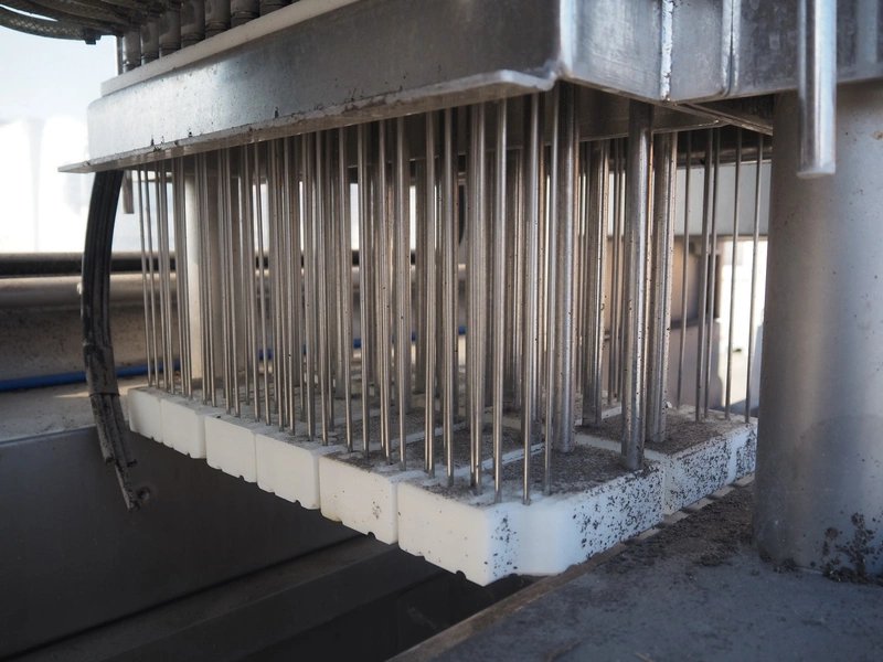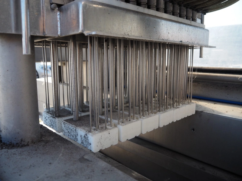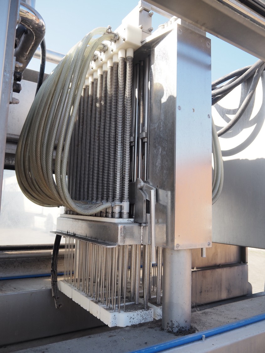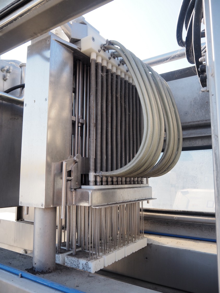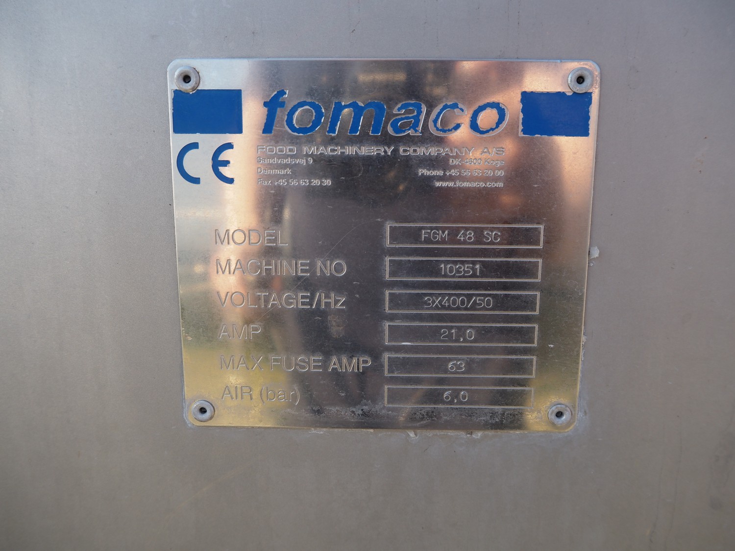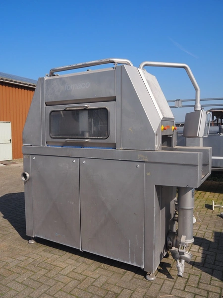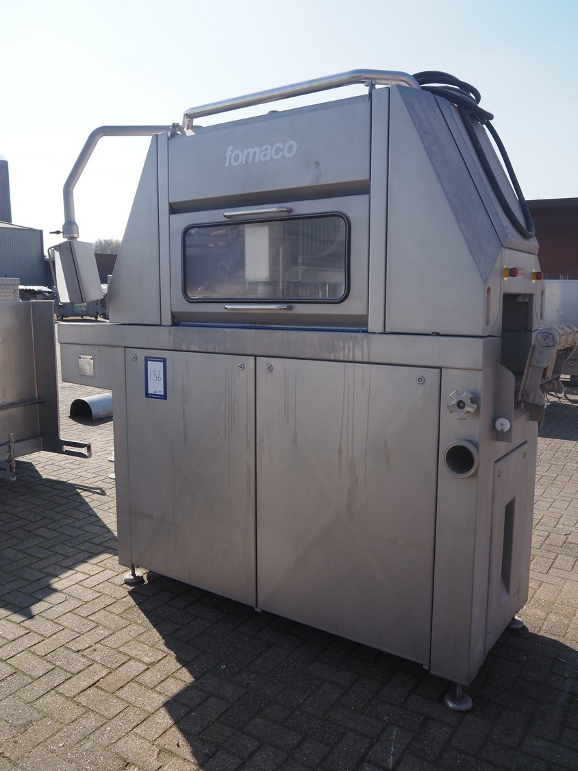Fomaco injector, model: FGM 48 SC, machine number: 10351, 400 V, 3 Ph, 50 Hz, 21 A, 96 needles, belt width: 420 mm, total dimensions: 2450 mm x 1000 mm x 2300 mm. Incomplete.