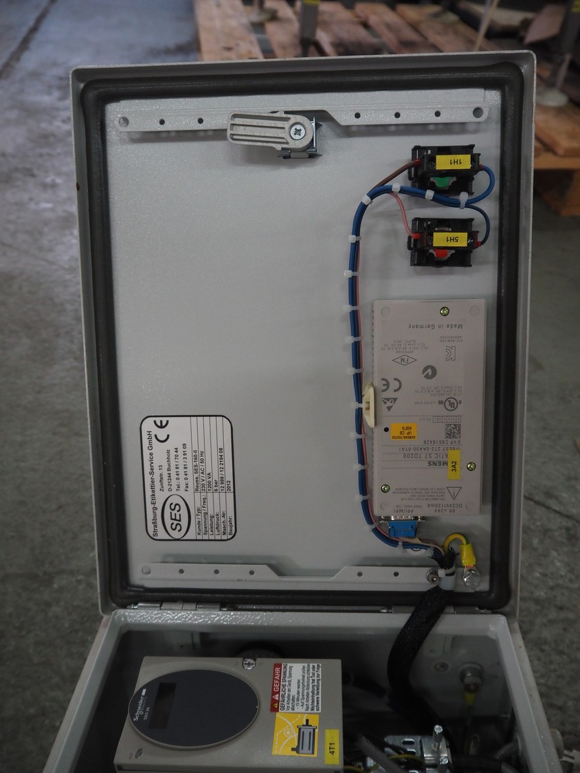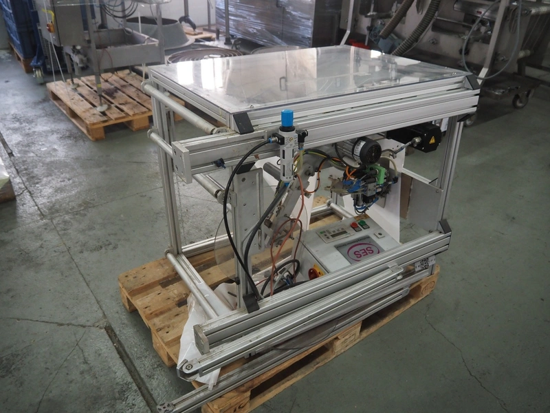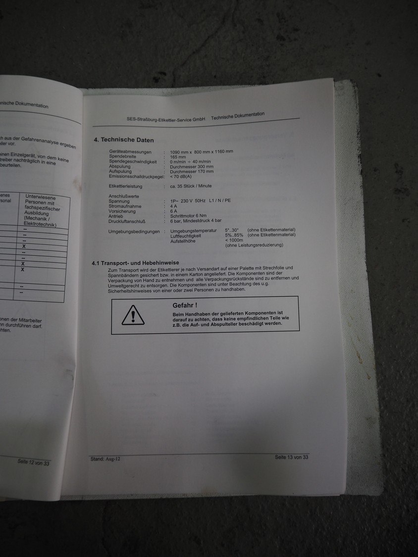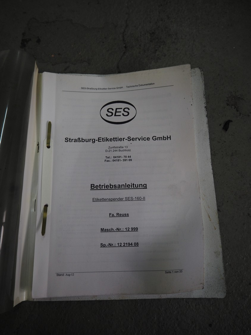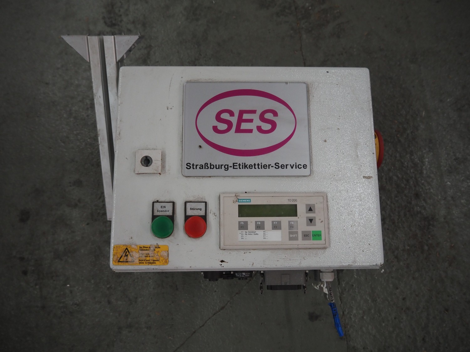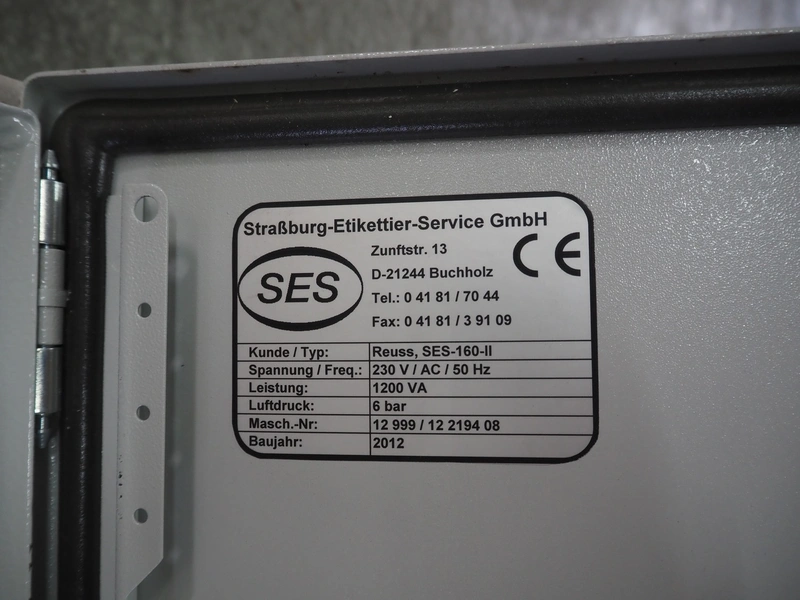 SES labelling machine, type: SES-160-II, machine number: 12 999/12 2194 08, year of construction: 2012, 230 V, 50 Hz, maximum label width: 170 mm, total dimensions: 1100 mm x 900 mm x 1000 mm.