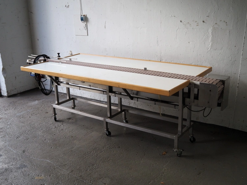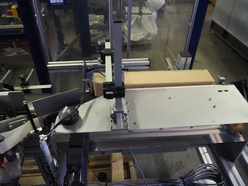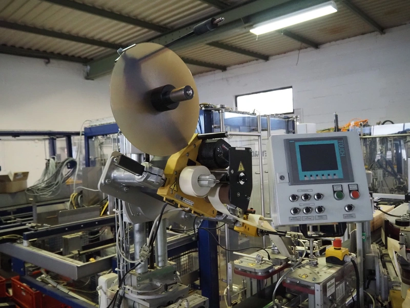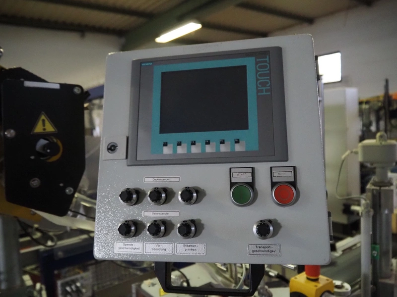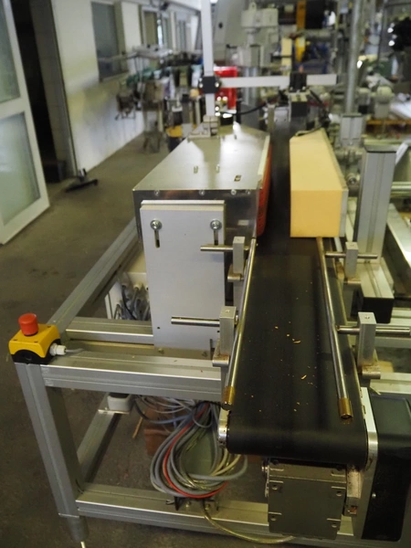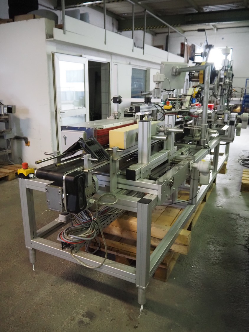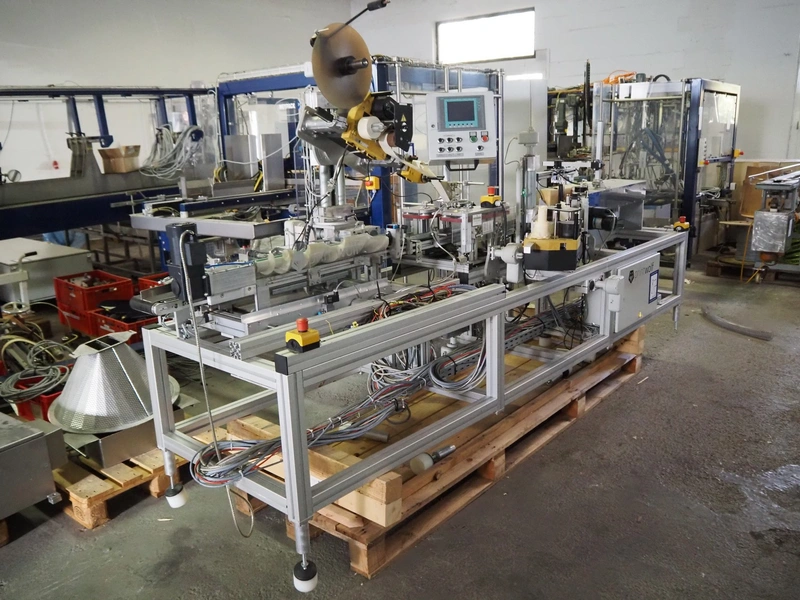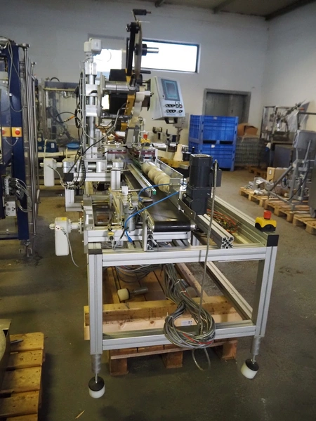 Printwolf labelling machine for jars, jars dimensions approximately: 60 - 250 ml, approximately 80 jars per minute, plastic belt, belt width: 150 mm, label width: 70 mm, clearance: 70 mm, 400 V, 50 Hz, total dimensions: 4000 mm x 1370 mm x 2200 mm. Including mobile table, plastic belt, belt width: 190 mm, total dimensions table: 3150 mm x 1220 mm x 950 mm. Including Printwolf switch cabinet, type: 8099, year of construction: 2013, 400 V, 50 Hz, 8 A, dimensions switch cabinet: 2100 mm x 820 mm x 410 mm.