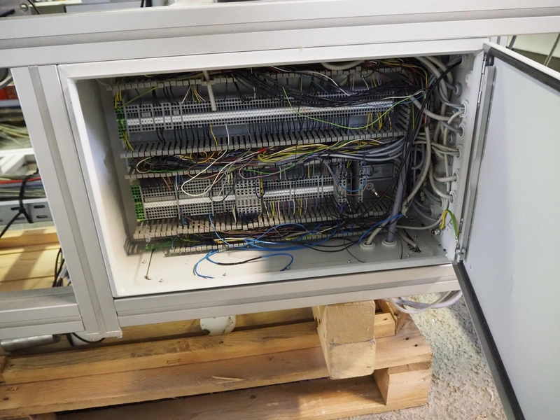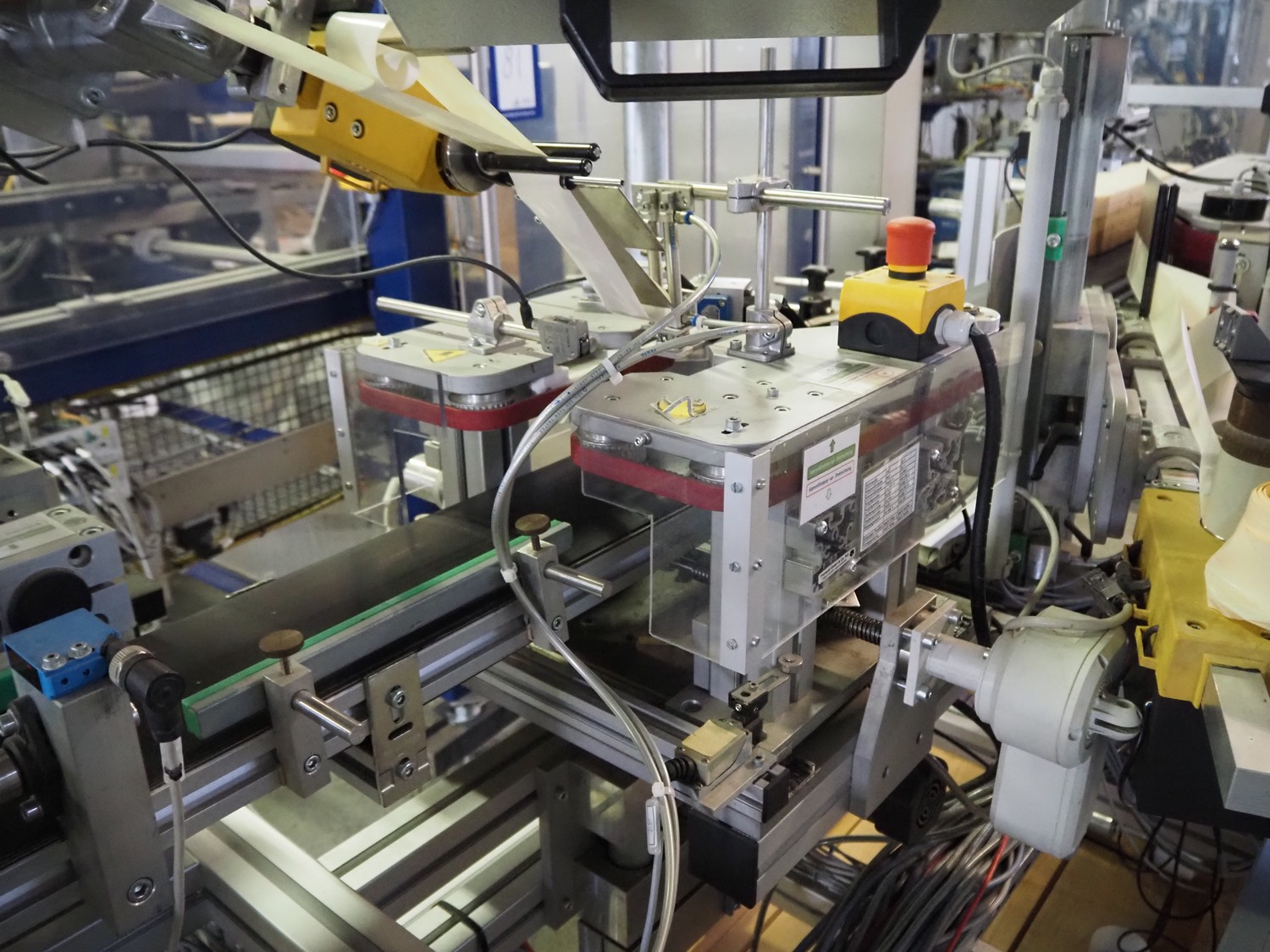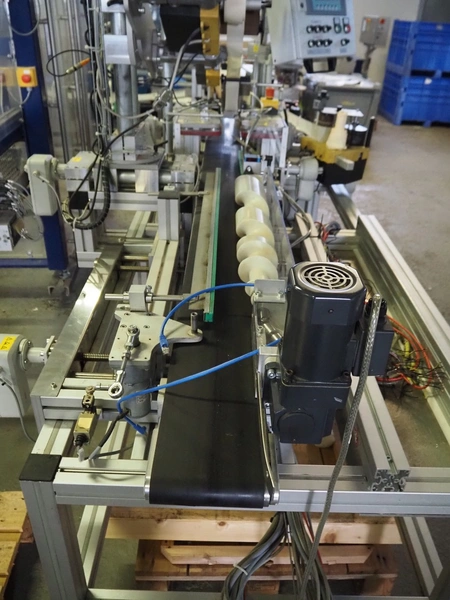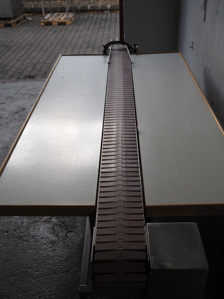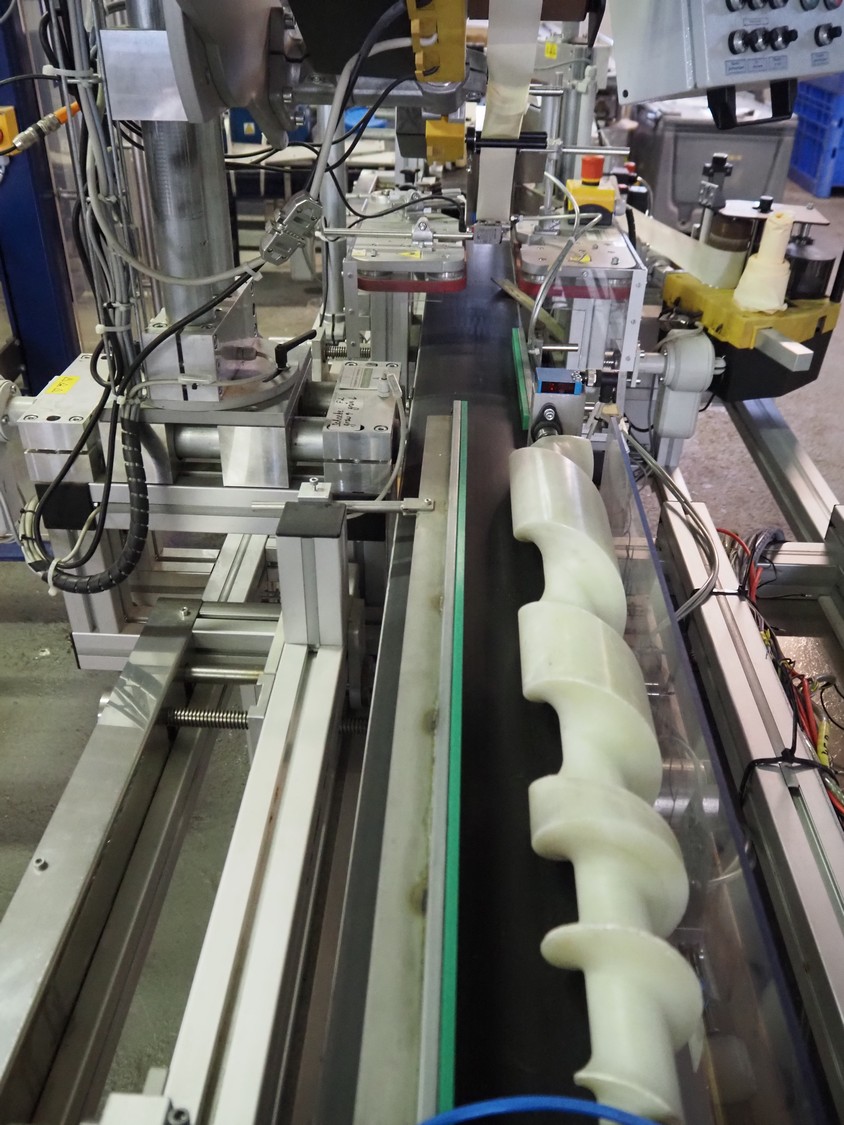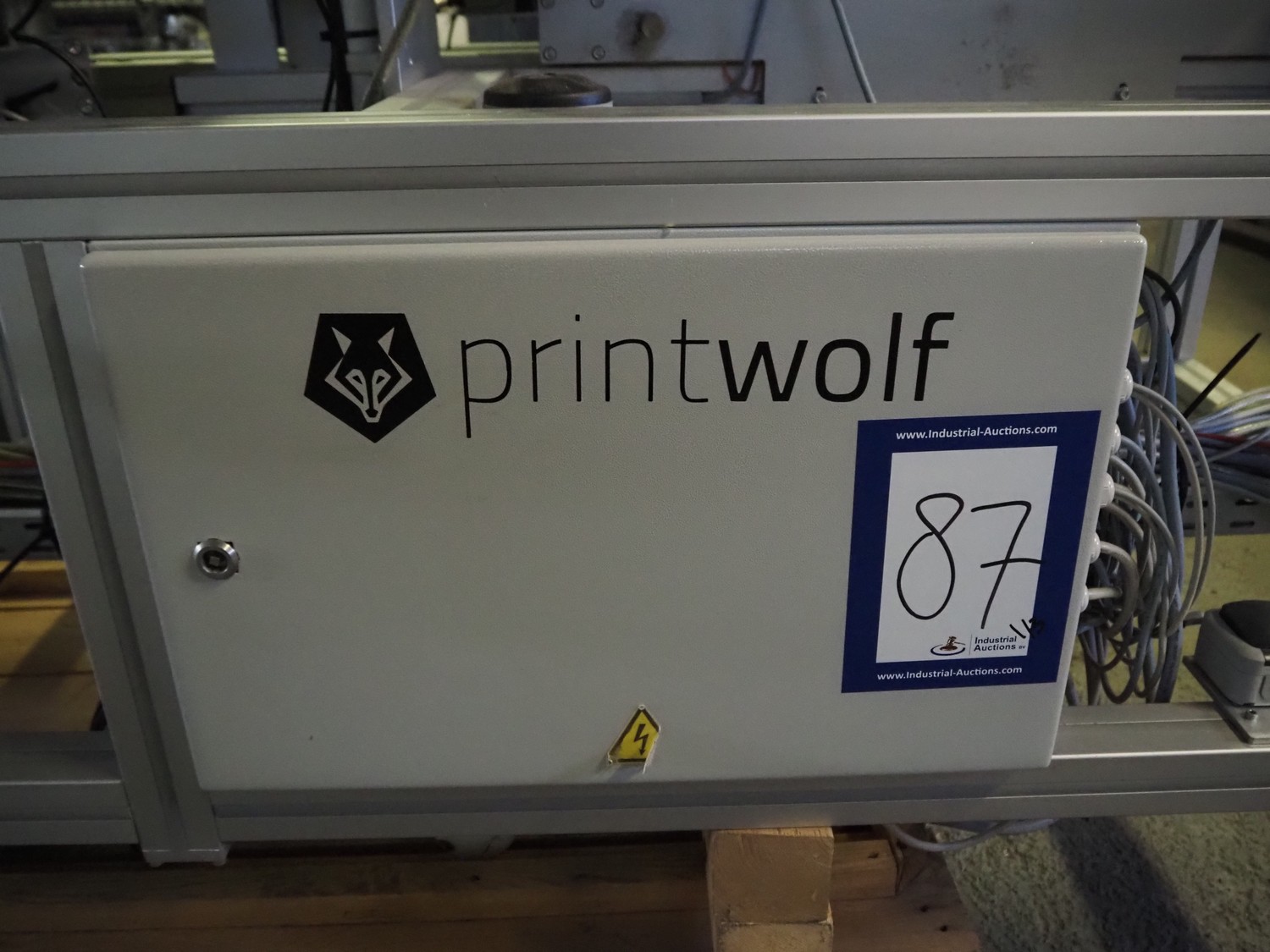 Printwolf labelling machine for jars, jars dimensions approximately: 60 - 250 ml, approximately 80 jars per minute, plastic belt, belt width: 150 mm, label width: 70 mm, clearance: 70 mm, 400 V, 50 Hz, total dimensions: 4000 mm x 1370 mm x 2200 mm. Including mobile table, plastic belt, belt width: 190 mm, total dimensions table: 3150 mm x 1220 mm x 950 mm. Including Printwolf switch cabinet, type: 8099, year of construction: 2013, 400 V, 50 Hz, 8 A, dimensions switch cabinet: 2100 mm x 820 mm x 410 mm.