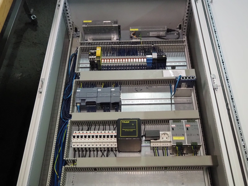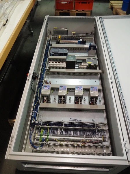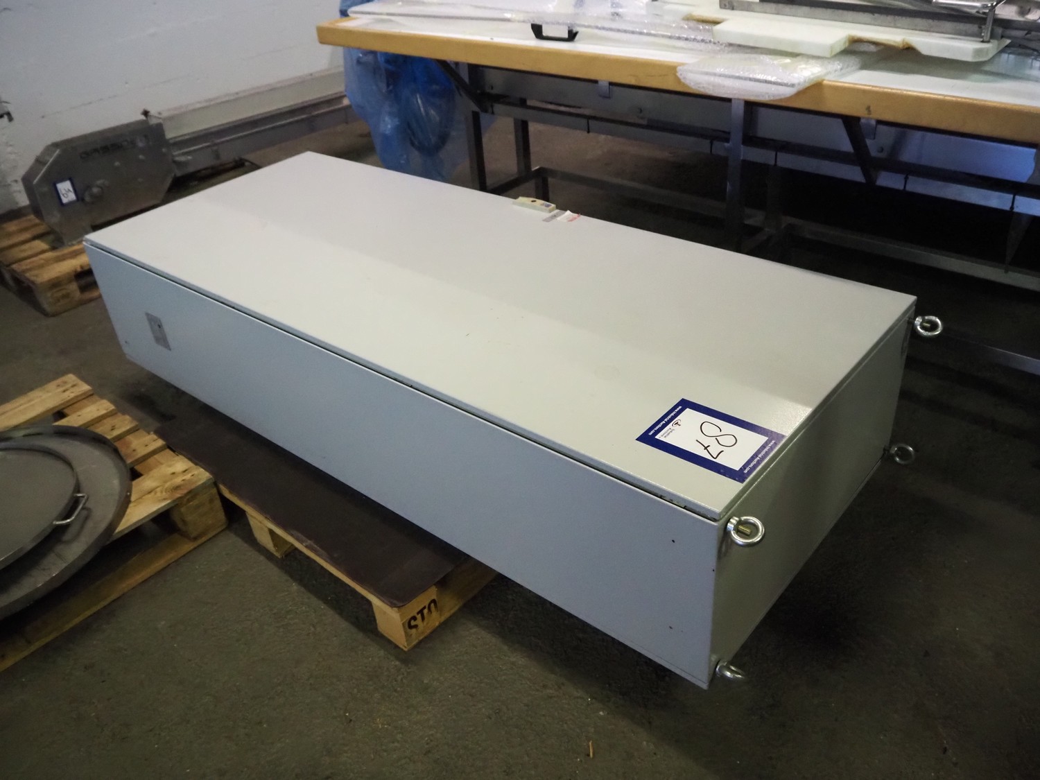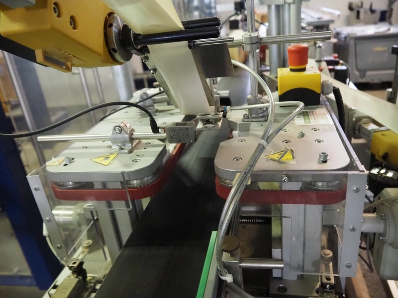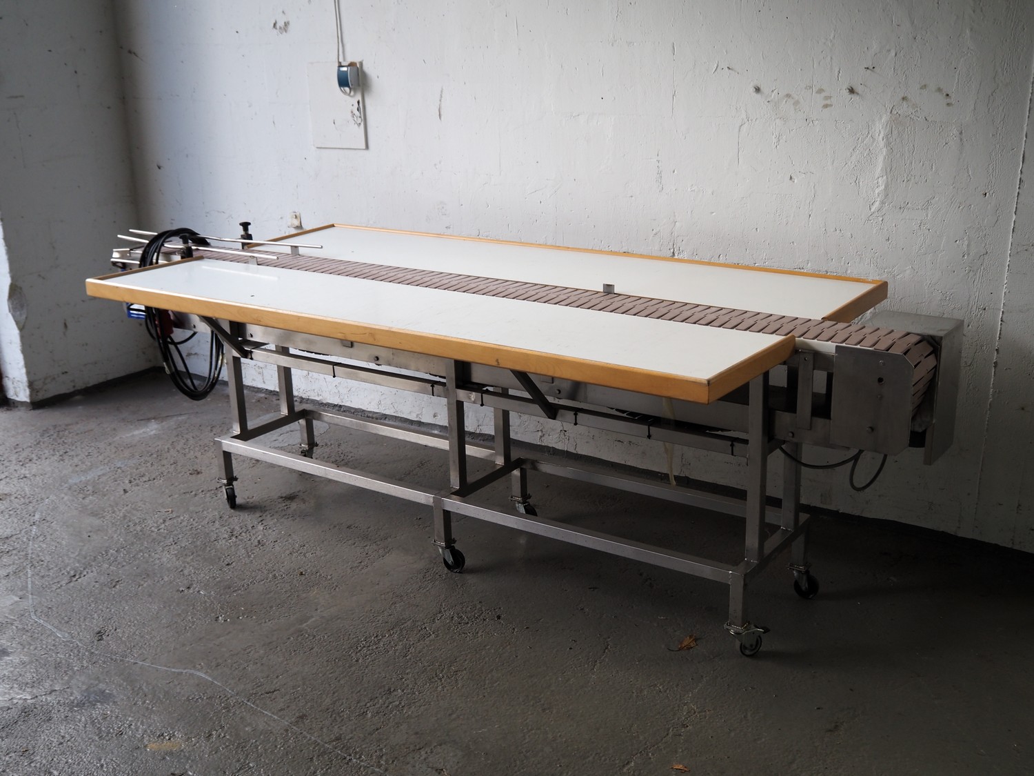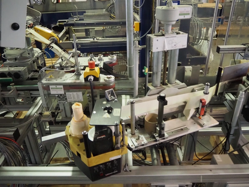 Printwolf labelling machine for jars, jars dimensions approximately: 60 - 250 ml, approximately 80 jars per minute, plastic belt, belt width: 150 mm, label width: 70 mm, clearance: 70 mm, 400 V, 50 Hz, total dimensions: 4000 mm x 1370 mm x 2200 mm. Including mobile table, plastic belt, belt width: 190 mm, total dimensions table: 3150 mm x 1220 mm x 950 mm. Including Printwolf switch cabinet, type: 8099, year of construction: 2013, 400 V, 50 Hz, 8 A, dimensions switch cabinet: 2100 mm x 820 mm x 410 mm.