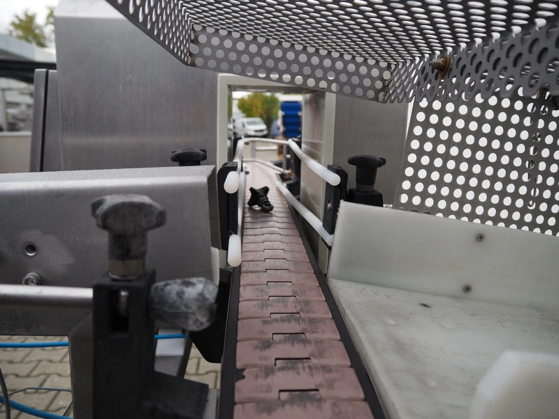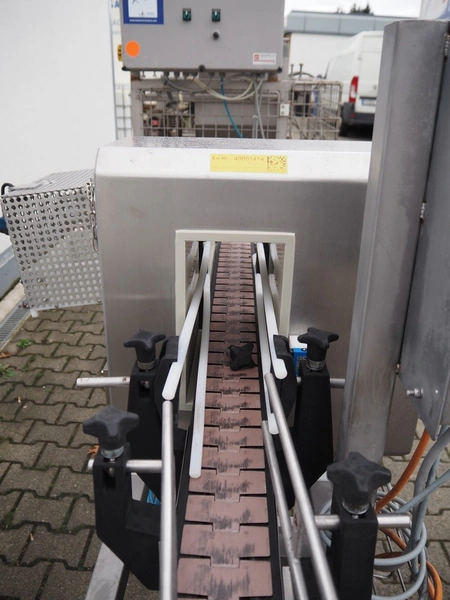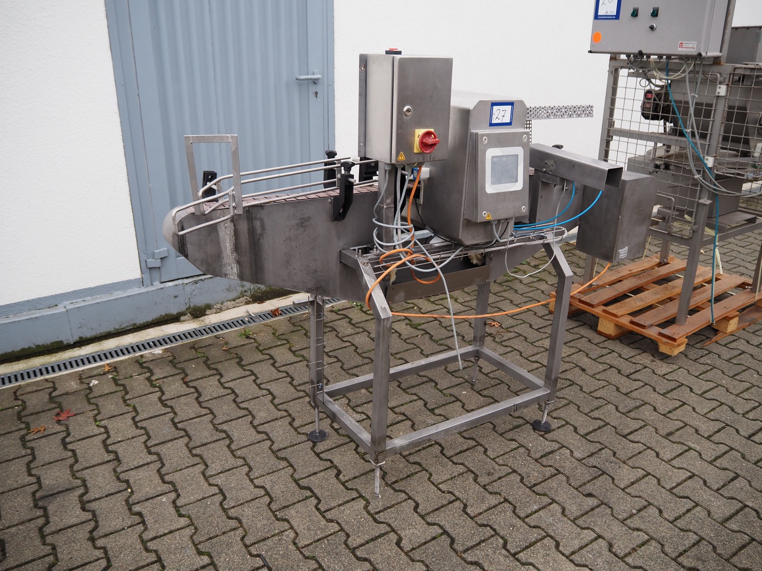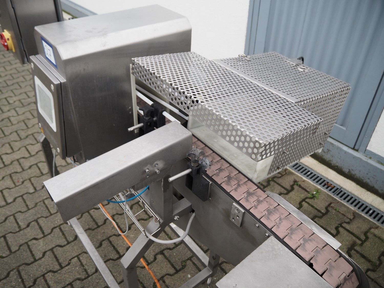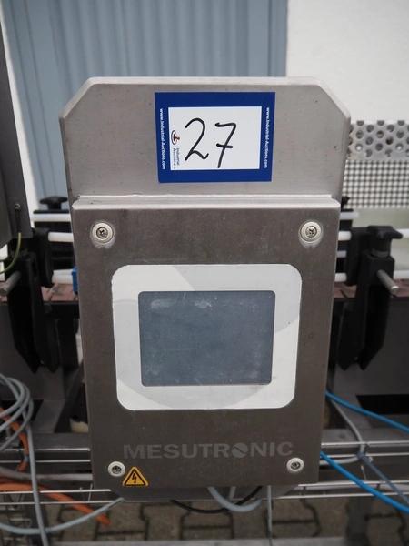 Mesutronic metal detector with rejector, type: FC 01 BA 3.1.1, serial number: 1013 FC, year of construction: 2013, 230 V, 50 Hz, plastic belt, belt width: 80 mm, clearance: 130 mm x 205 mm, total dimensions: 2050 mm x 990 mm x 1500 mm.