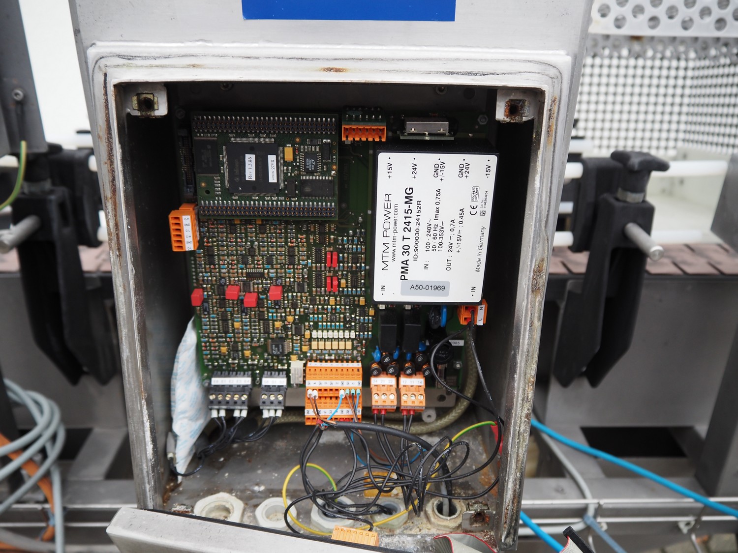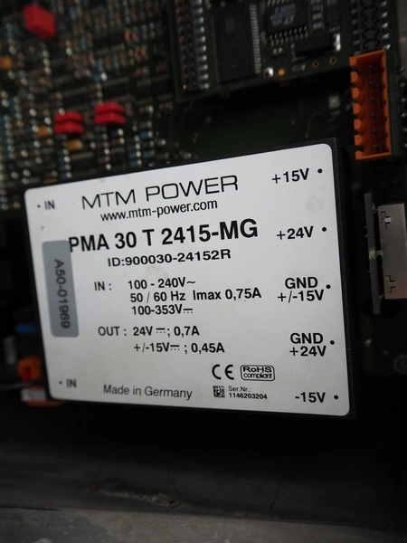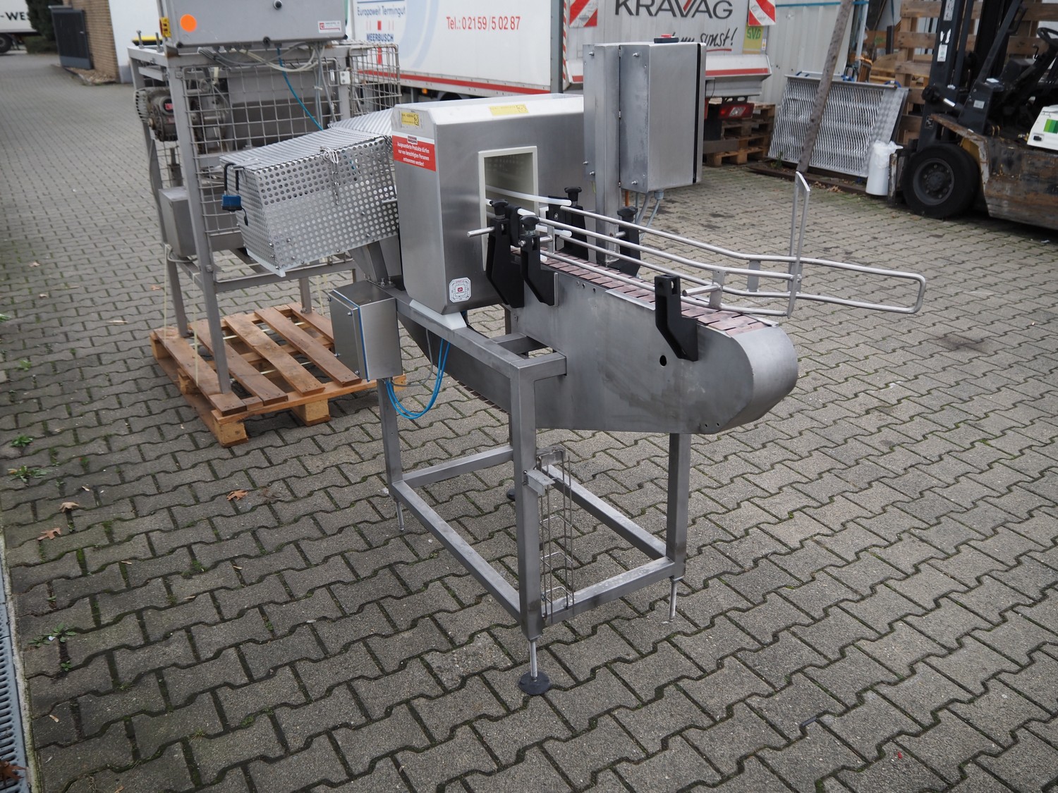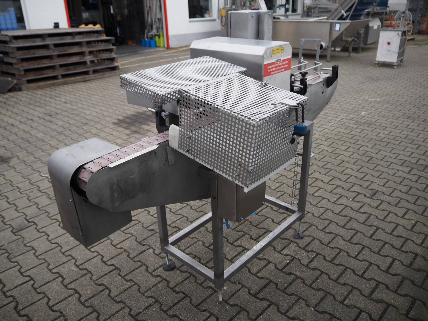 Mesutronic metal detector with rejector, type: FC 01 BA 3.1.1, serial number: 1013 FC, year of construction: 2013, 230 V, 50 Hz, plastic belt, belt width: 80 mm, clearance: 130 mm x 205 mm, total dimensions: 2050 mm x 990 mm x 1500 mm.