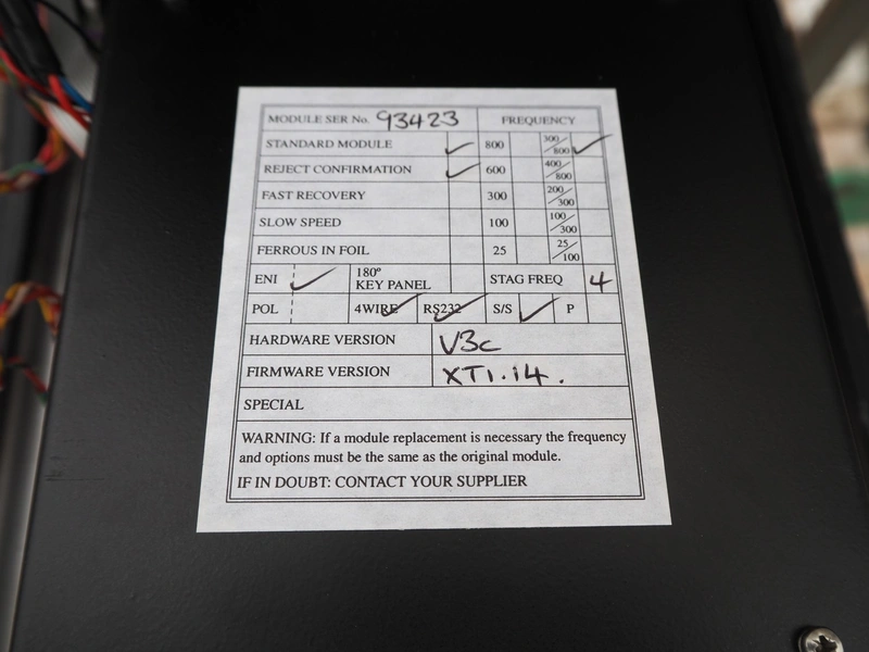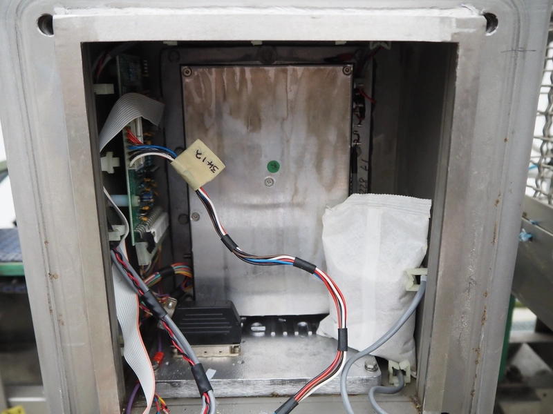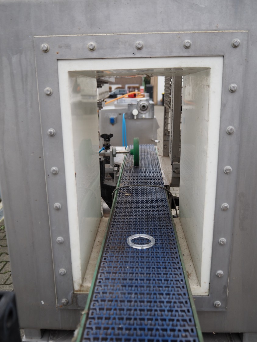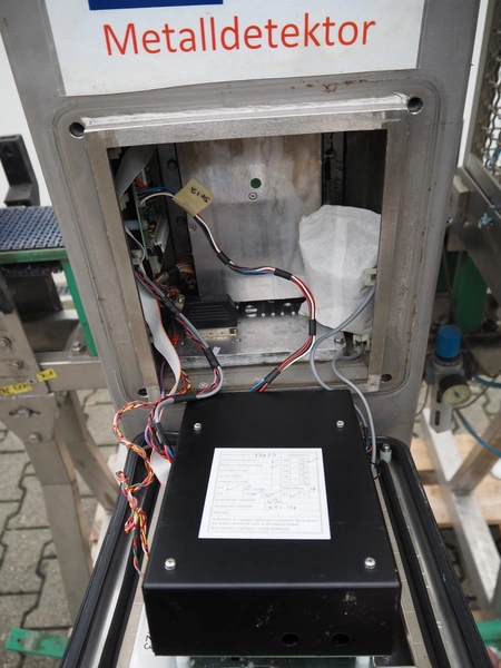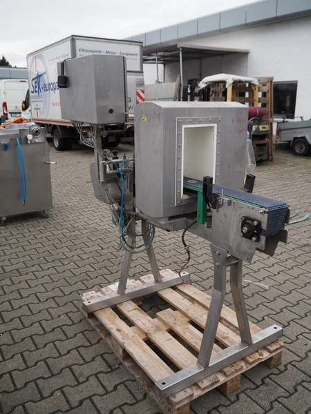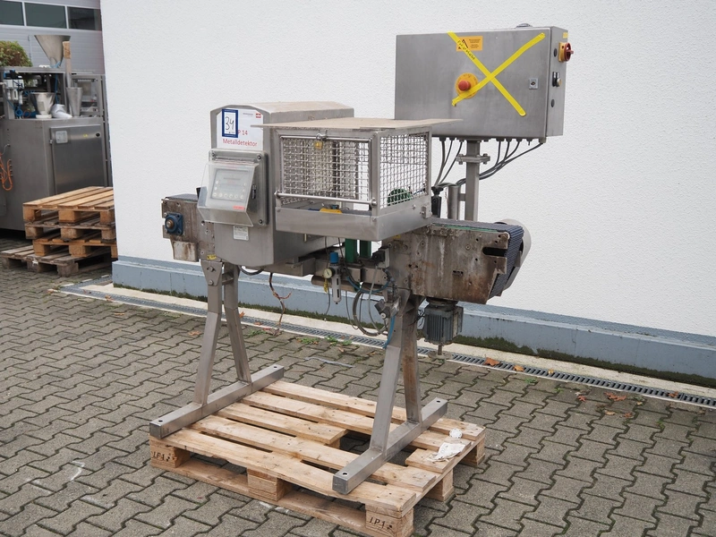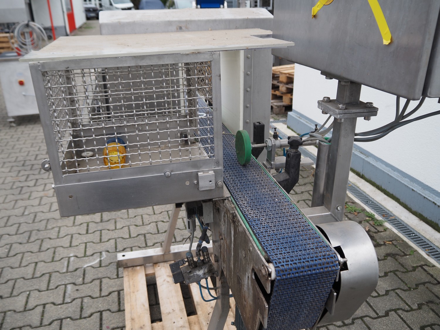 Safeline metal detector with rejector, clearance: 200 mm x 350 mm, plastic belt, belt width: 120 mm, total dimensions: 1600 mm x 900 mm x 1650 mm.